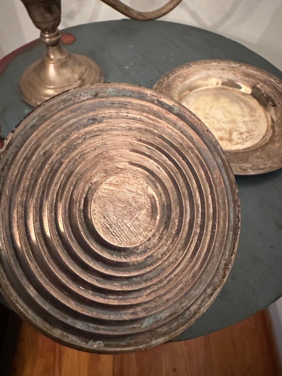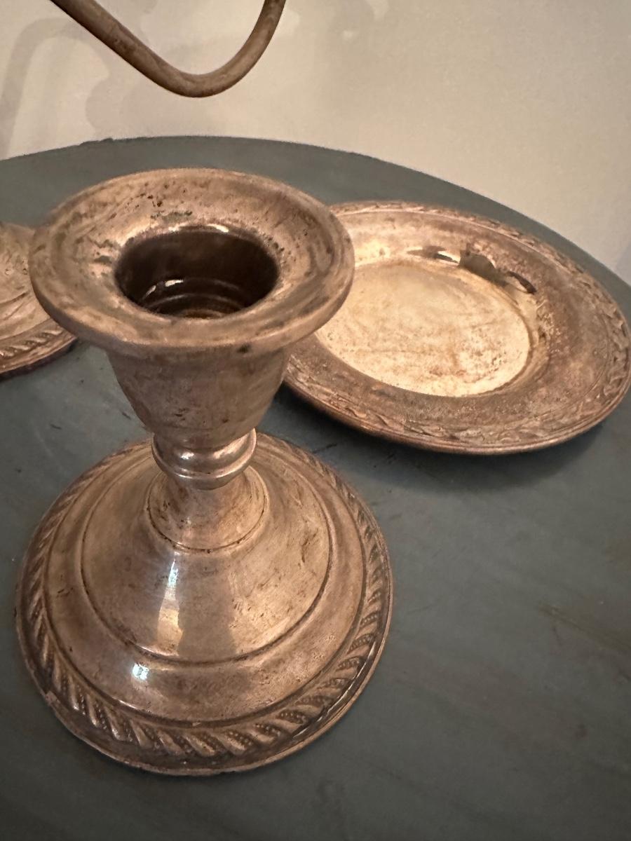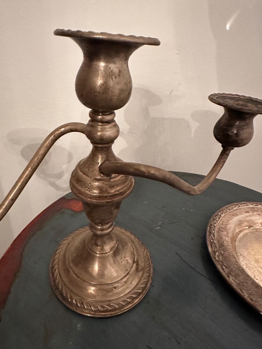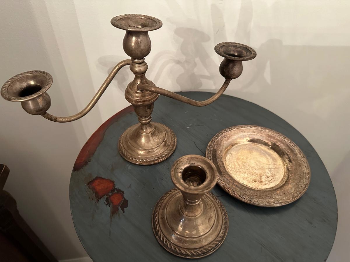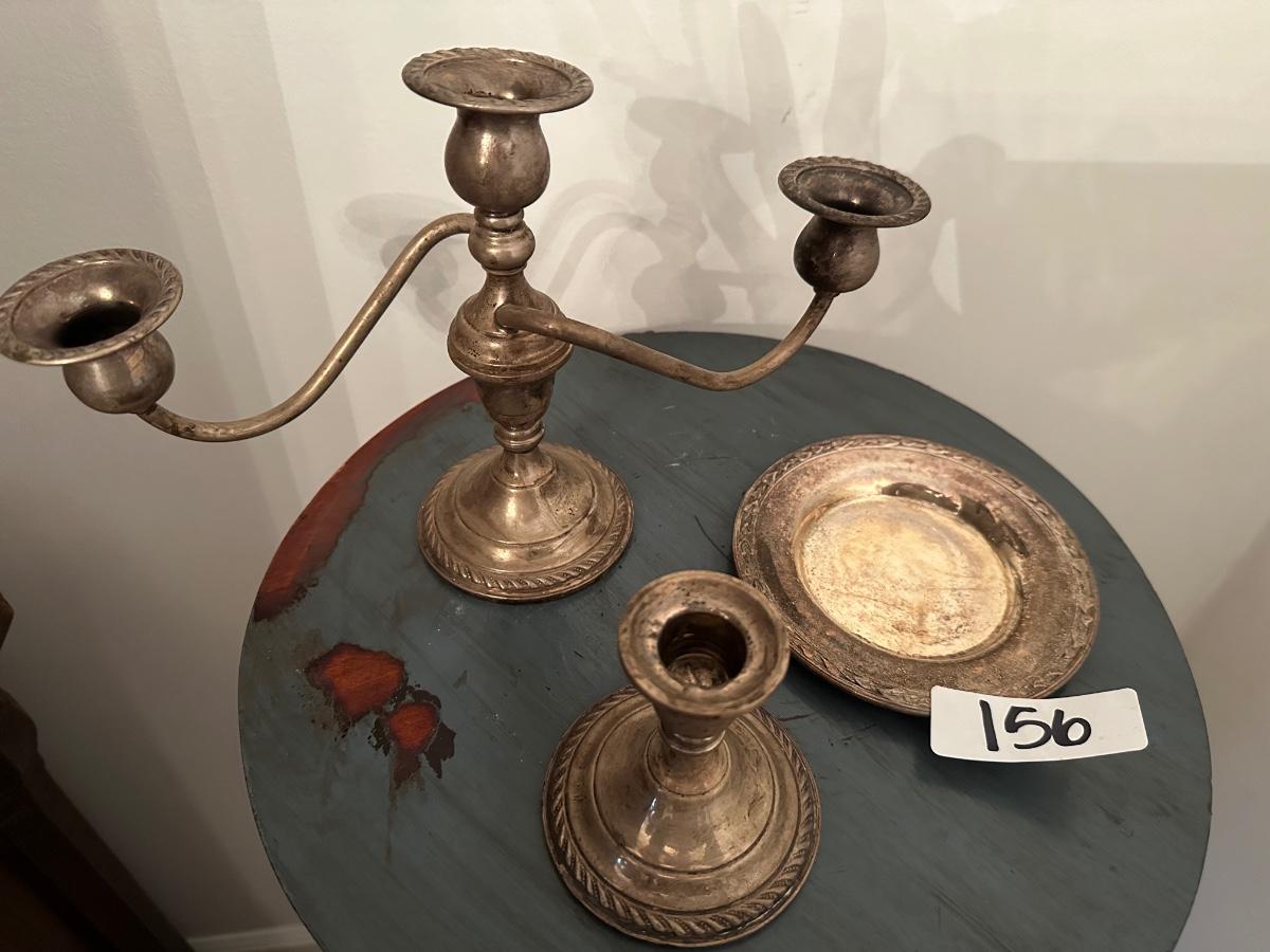 SILVER PLATE SMALL PLATE, PREMIER STERLING CANDLE STICK, STERLING 3 ARM CANDELABRA AS PICTURED