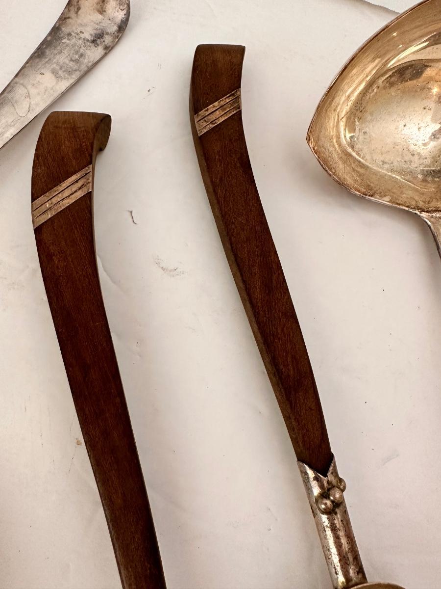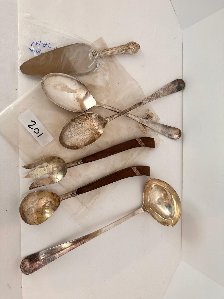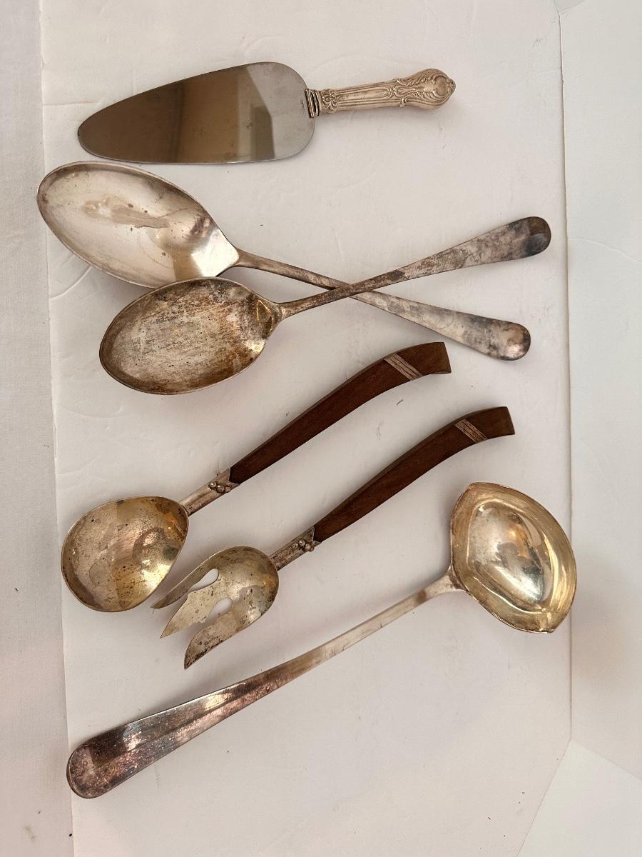 STERLING AND SILVER PLATE SERVING LOT, WOOD HANDLE STERLING SILVER SALAD SET, STERLING SILVER HANDLE CAKE KNIFE, SILVER PLATE LADLE, AND RICE SPOONS AS PICTURED