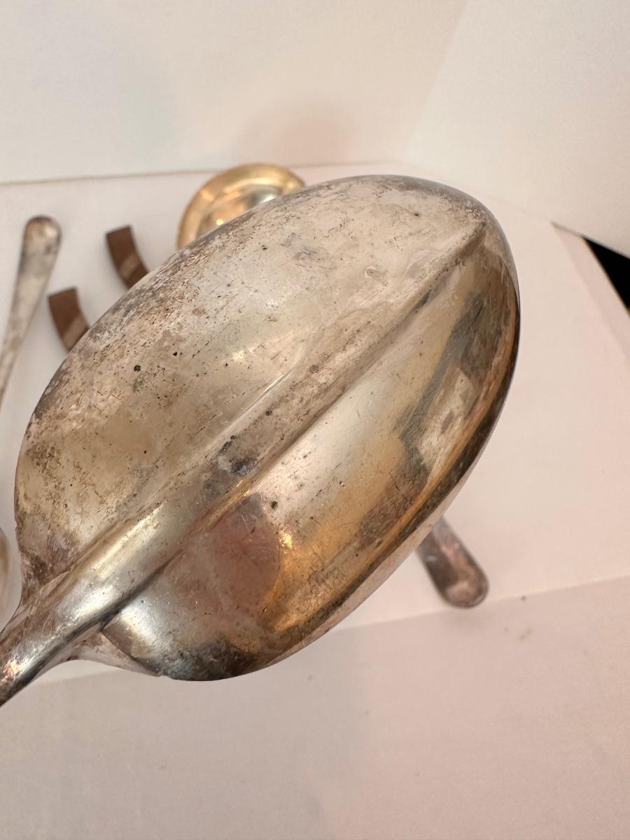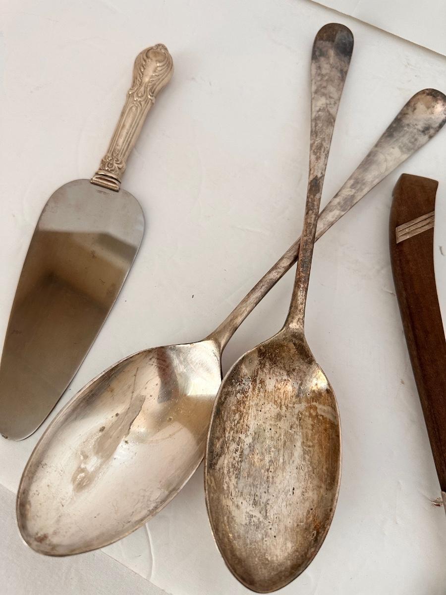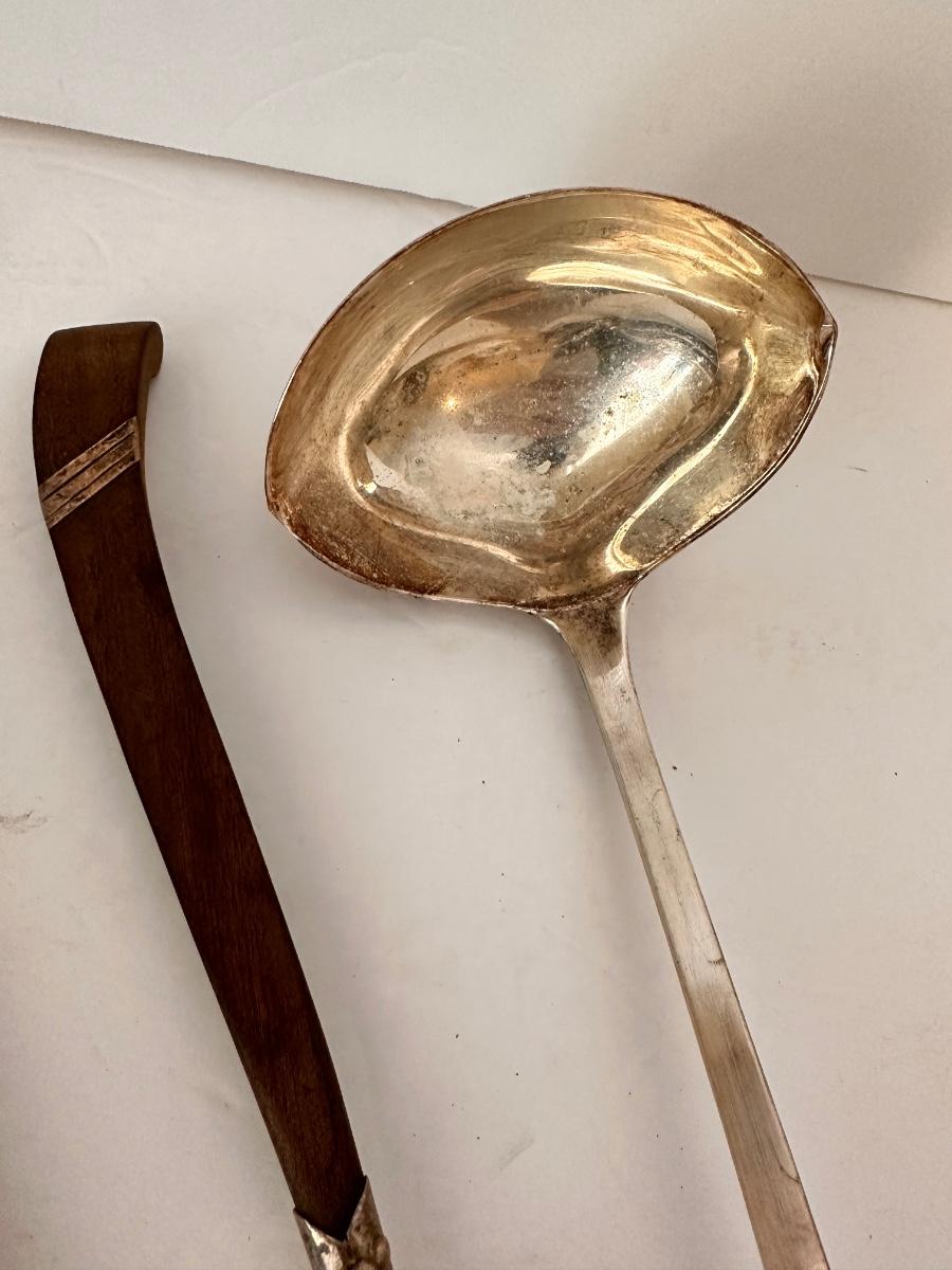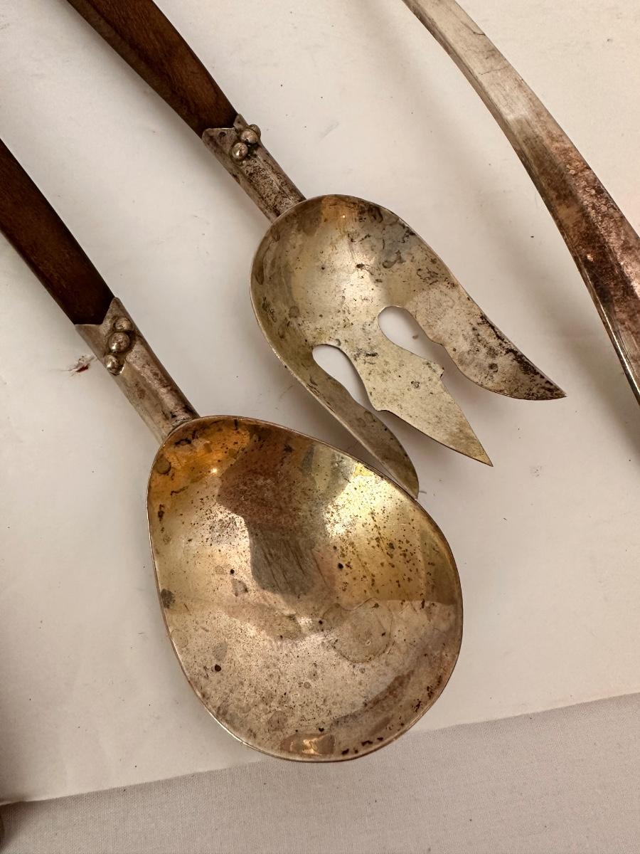 STERLING AND SILVER PLATE SERVING LOT, WOOD HANDLE STERLING SILVER SALAD SET, STERLING SILVER HANDLE CAKE KNIFE, SILVER PLATE LADLE, AND RICE SPOONS AS PICTURED