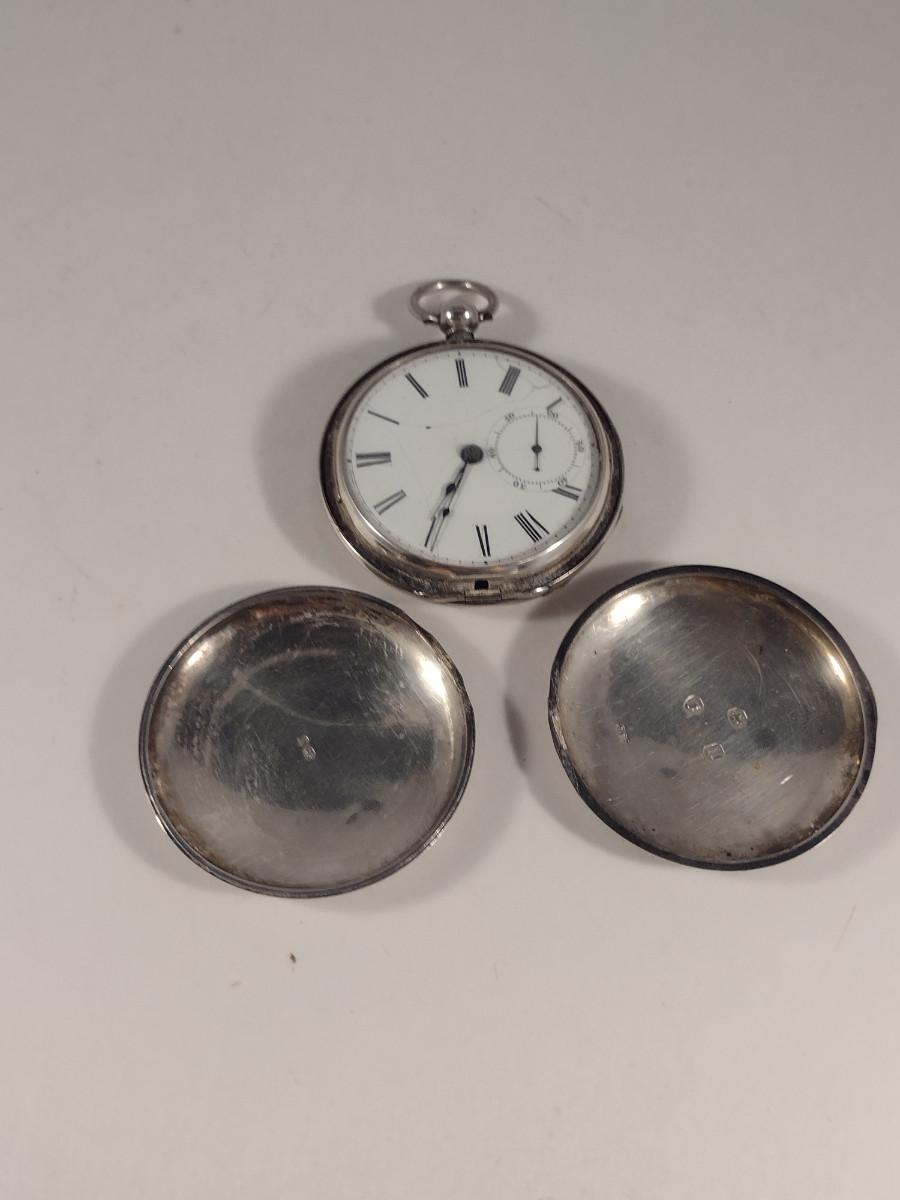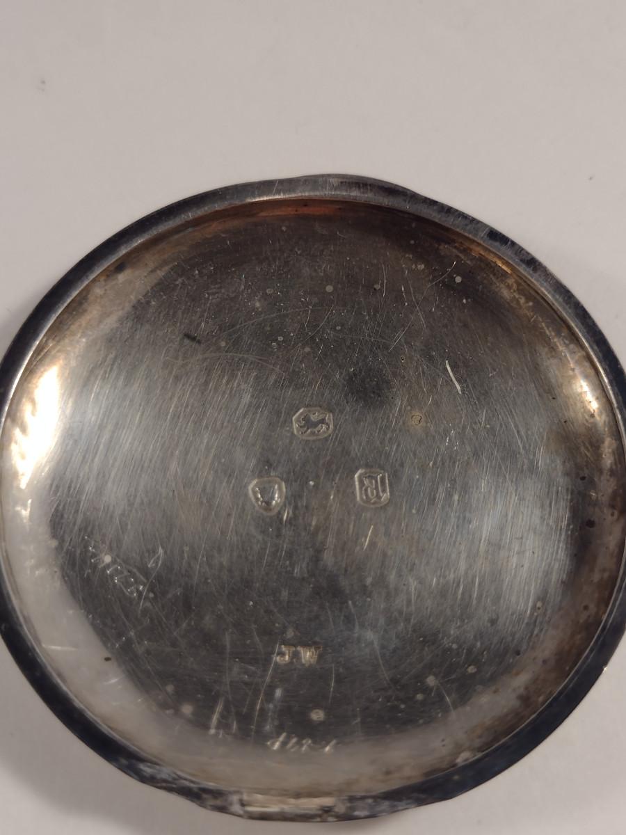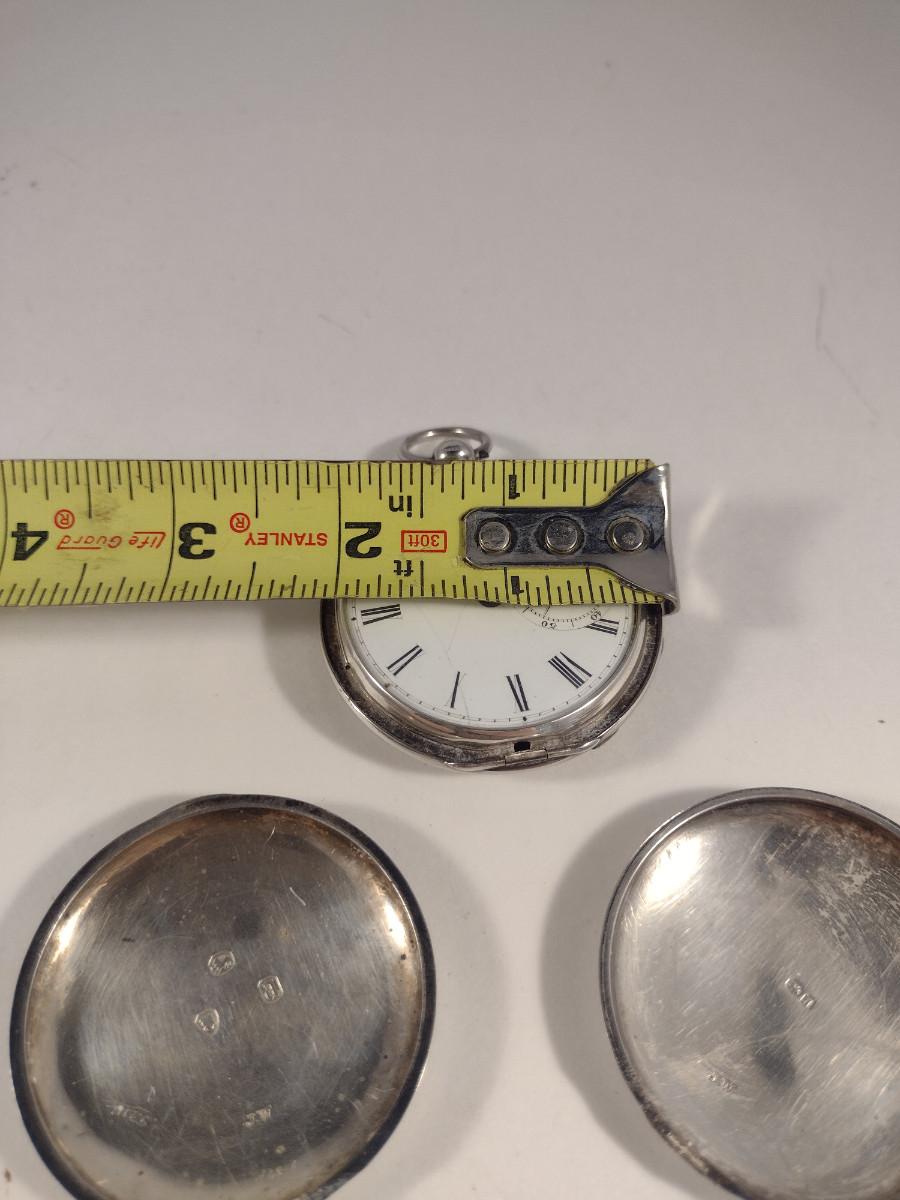 Sterling Silver Pocket Watch. Hinge needs to be repaired/replaced. Item is untested. Cracked appearance shown in pictures is on the face of the watch- glass is not cracked.