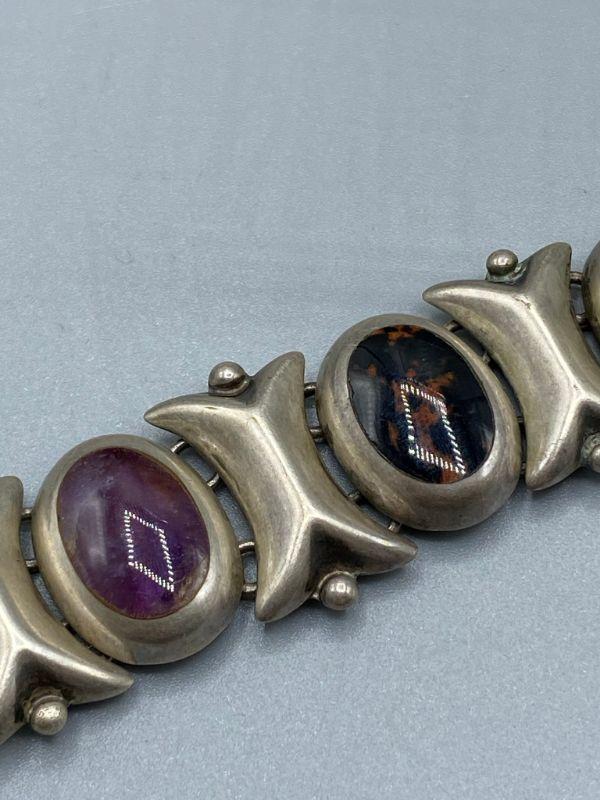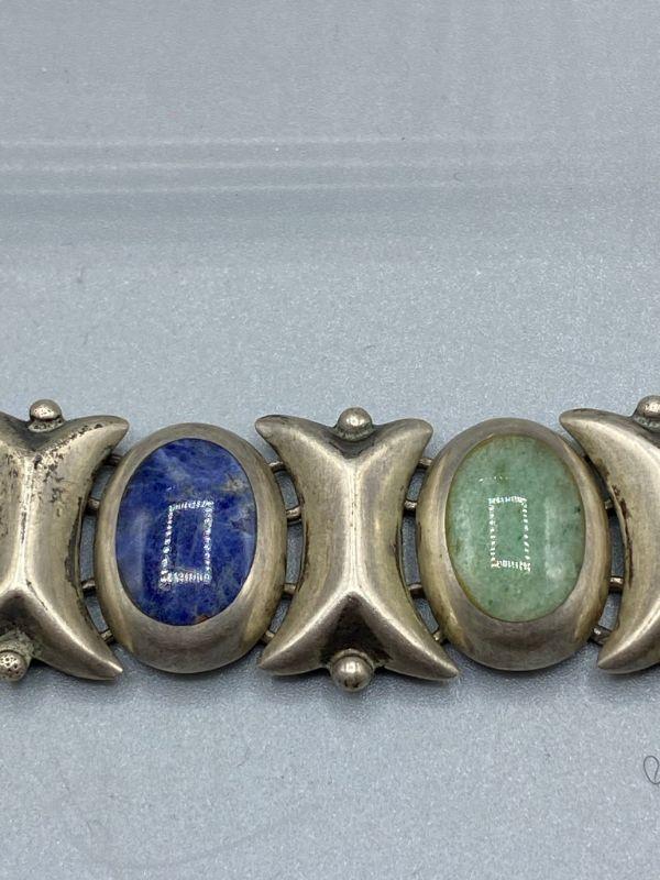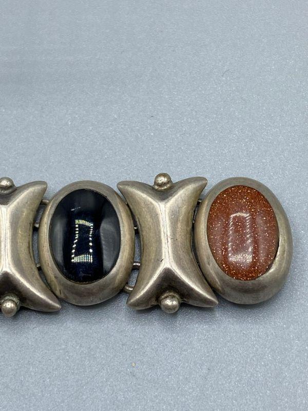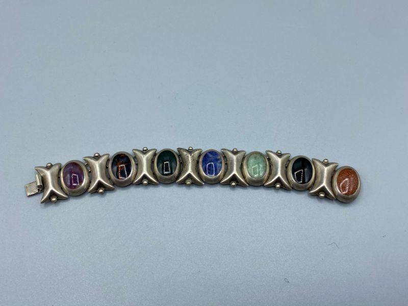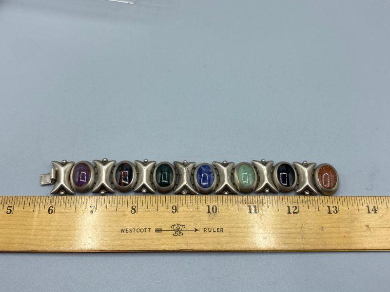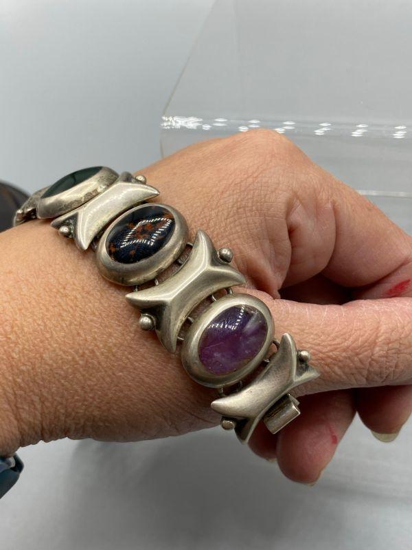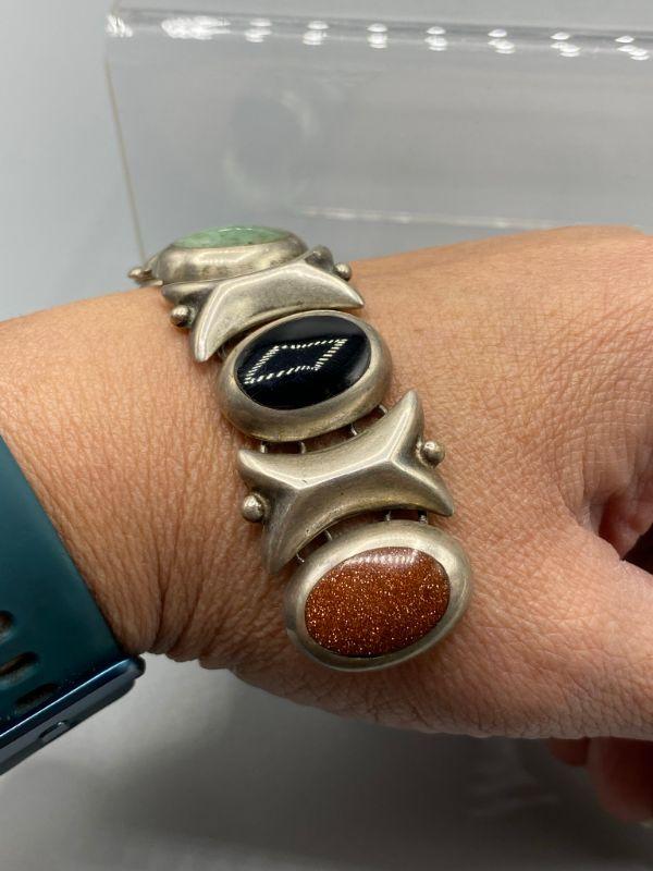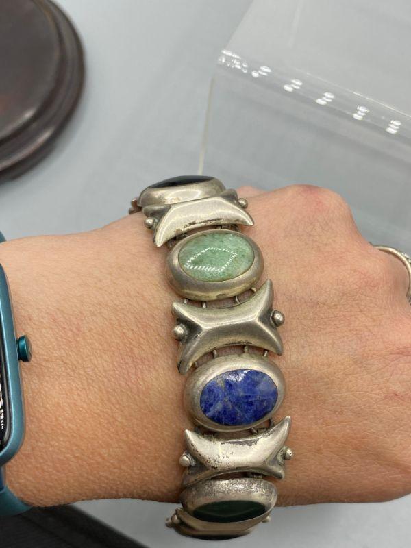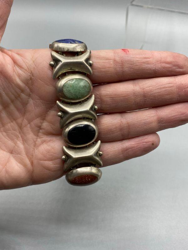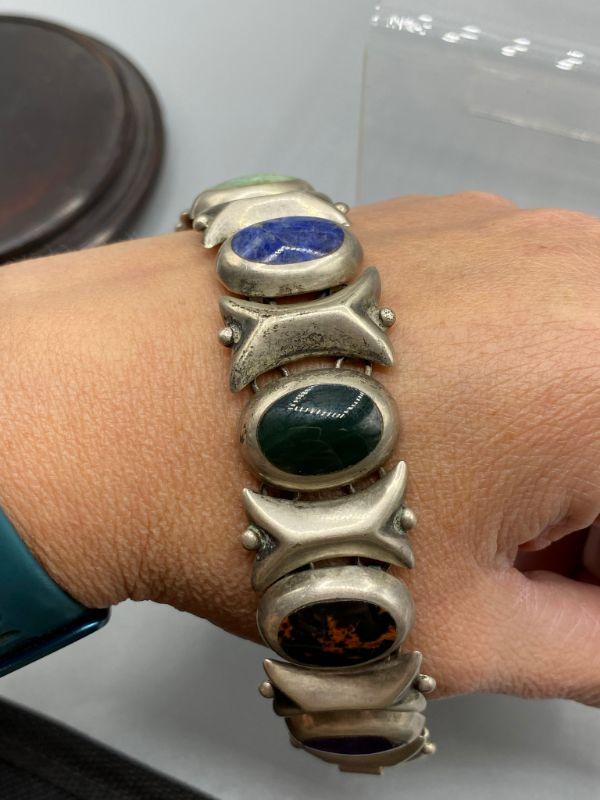 Heavy sterling silver and multi stone chunky bracelet. 7 different polished stones, believe they are goldstone, onyx, jadeite, lapis, bloodstone, jasper, and amethyst. Stamped on a inside link Taxco Mexico 925 SCM. Has loops to add a jump chain at the ends. Latches nice and securely. About 7" length and 1" wide.