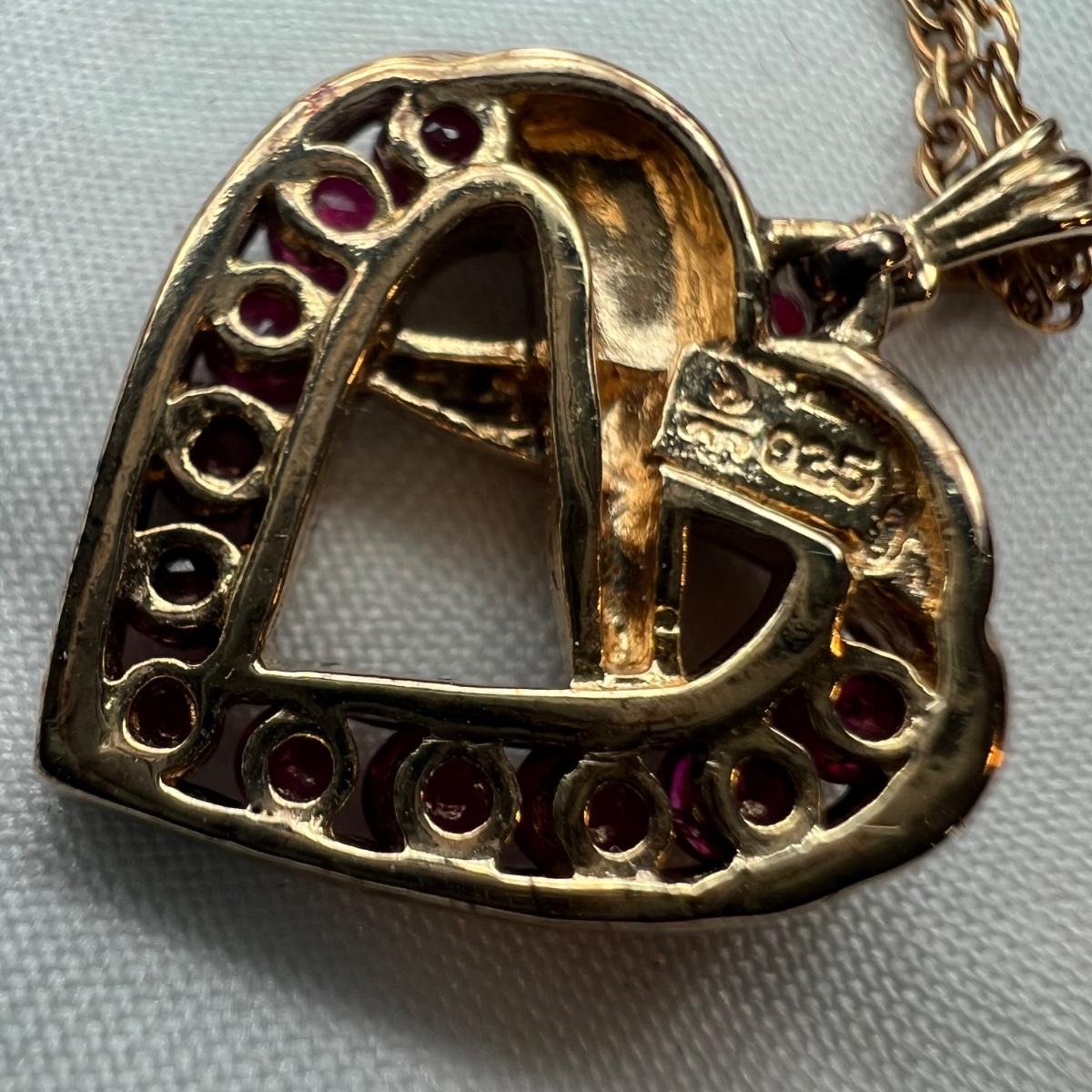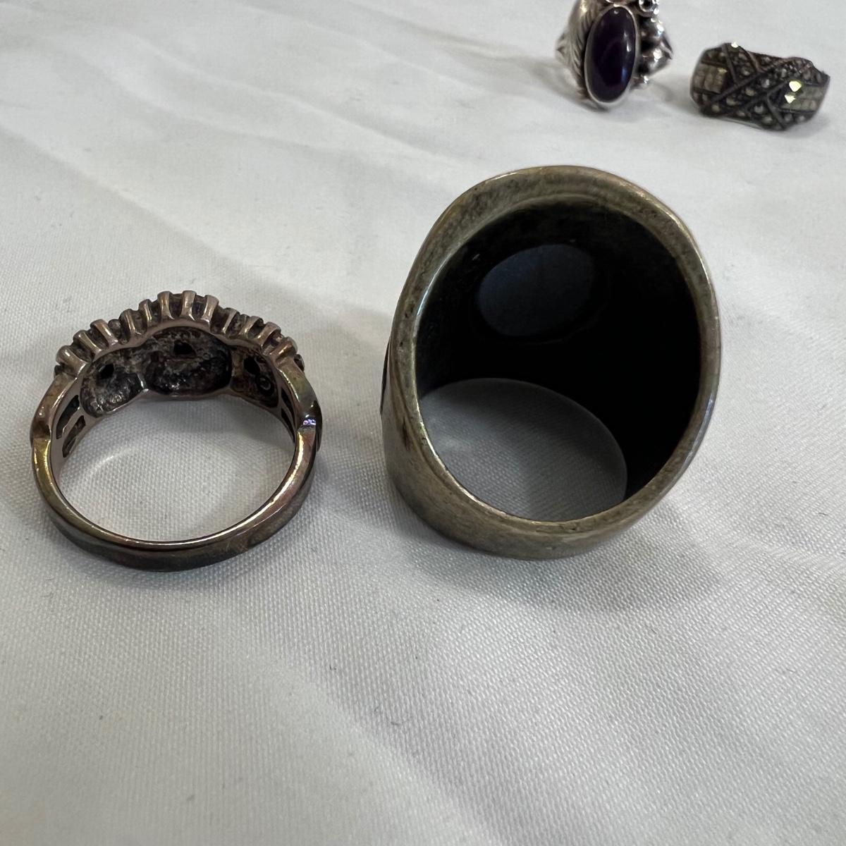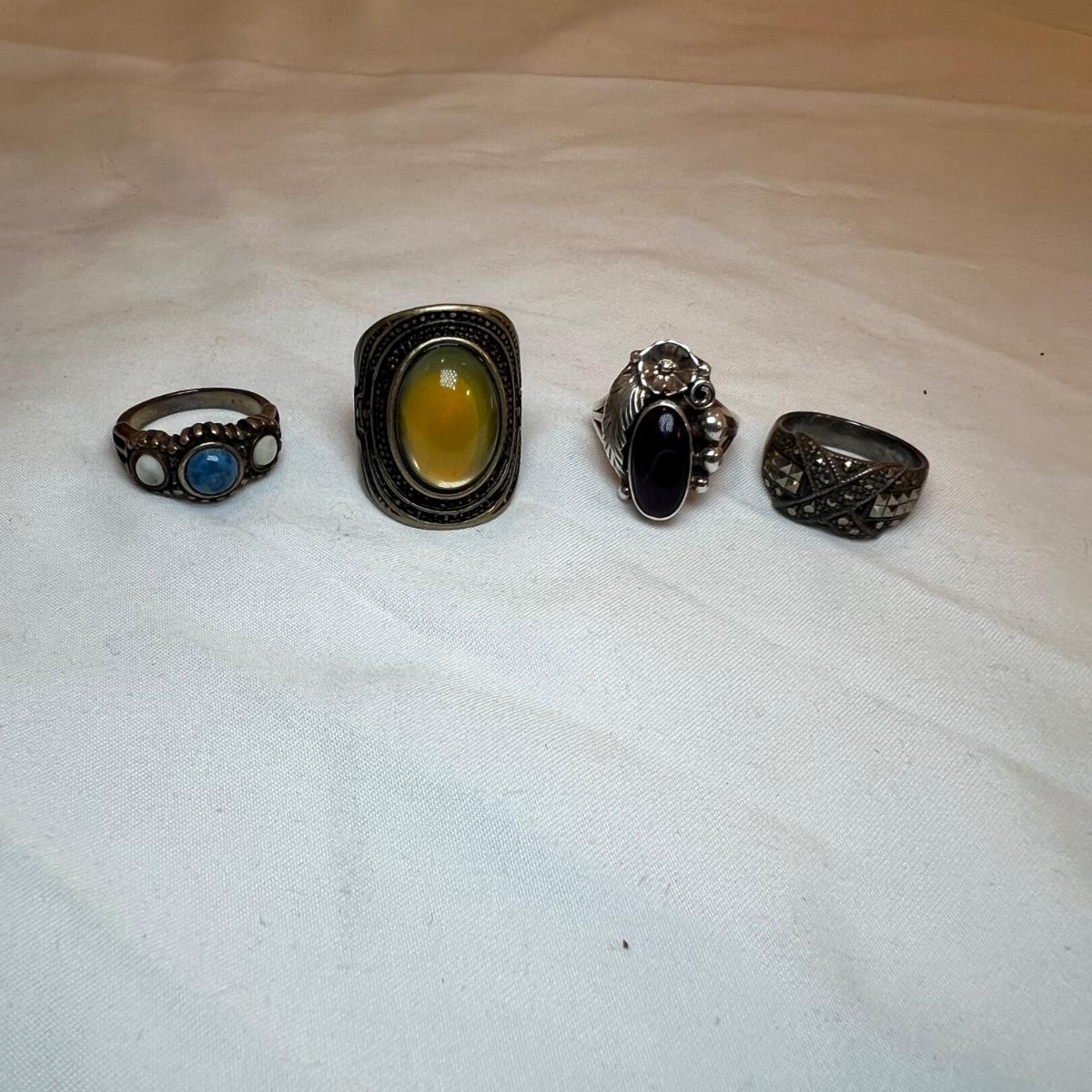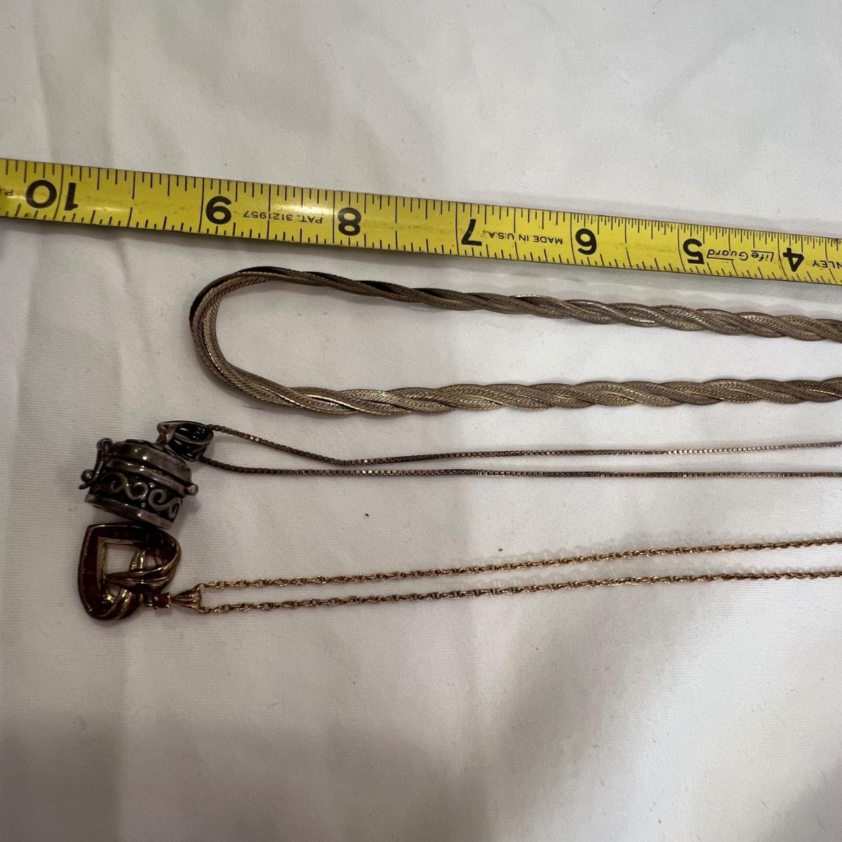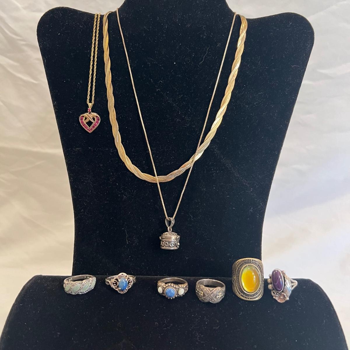 Three necklaces and 6 rings; four rings are unmarked, all other pieces have 925 stamps. The silver prayer box pendant is stamped as well as the chain, as is the heart shaped pendant which also has ruby red colored stones. Of the two 925 rings, one has jade colored stones and the other a blue stone. The jade stone ring has matching post earrings. See images for sizes.