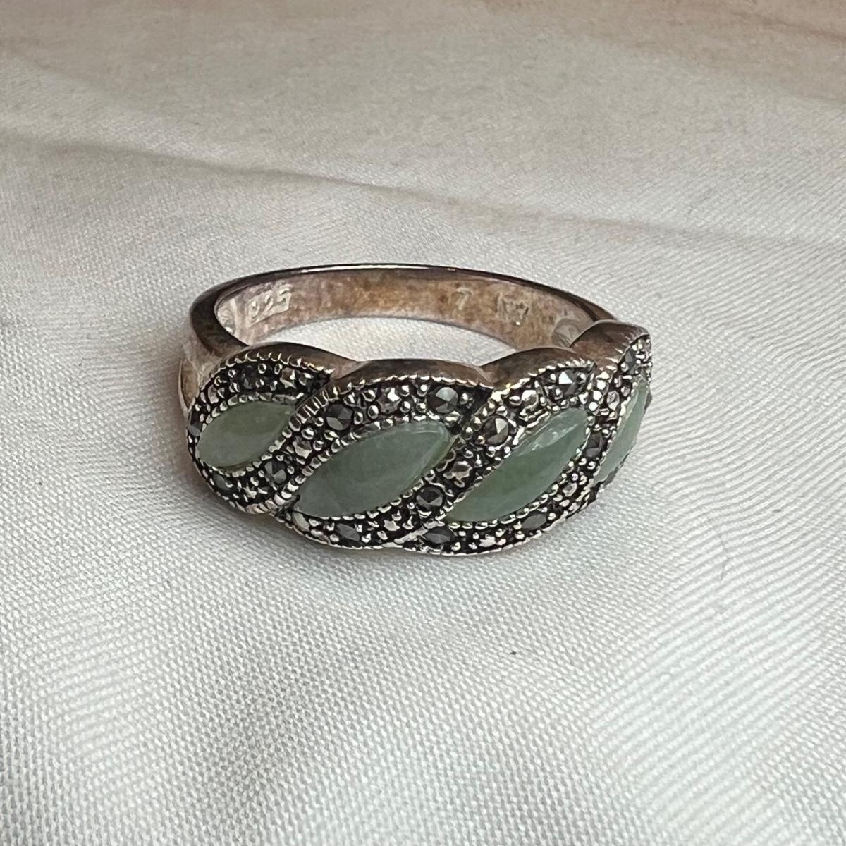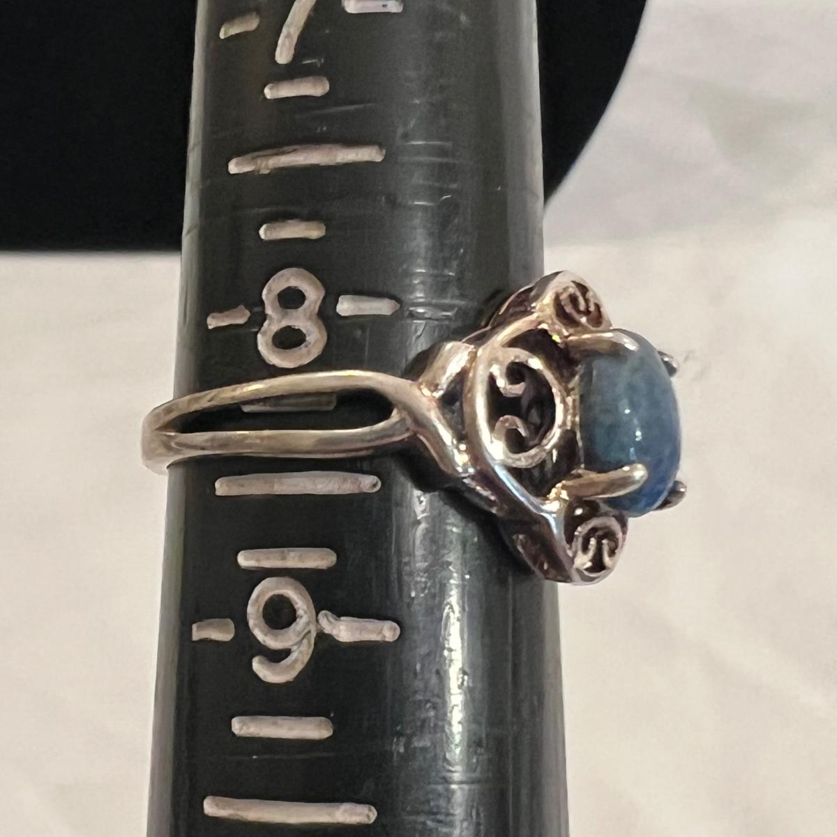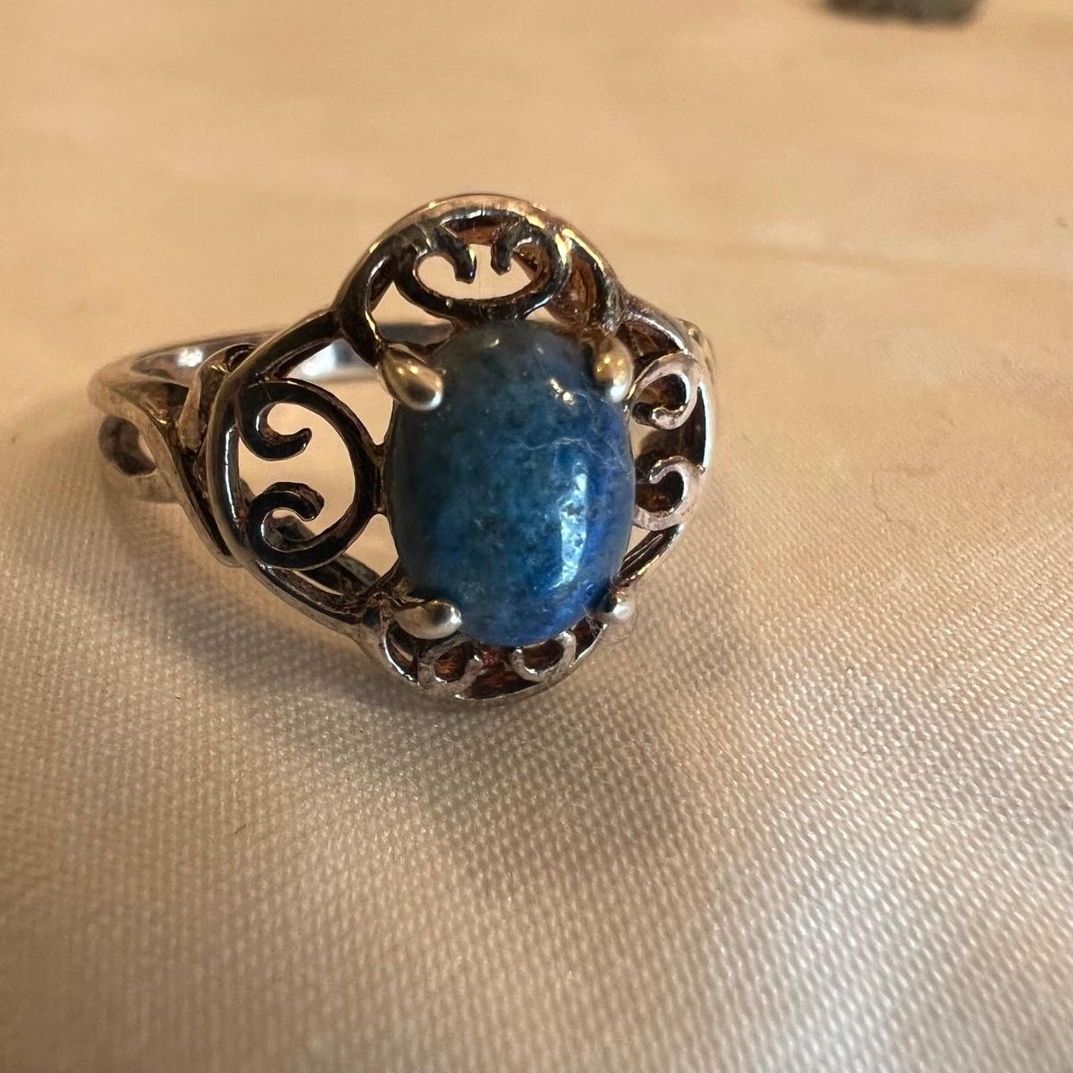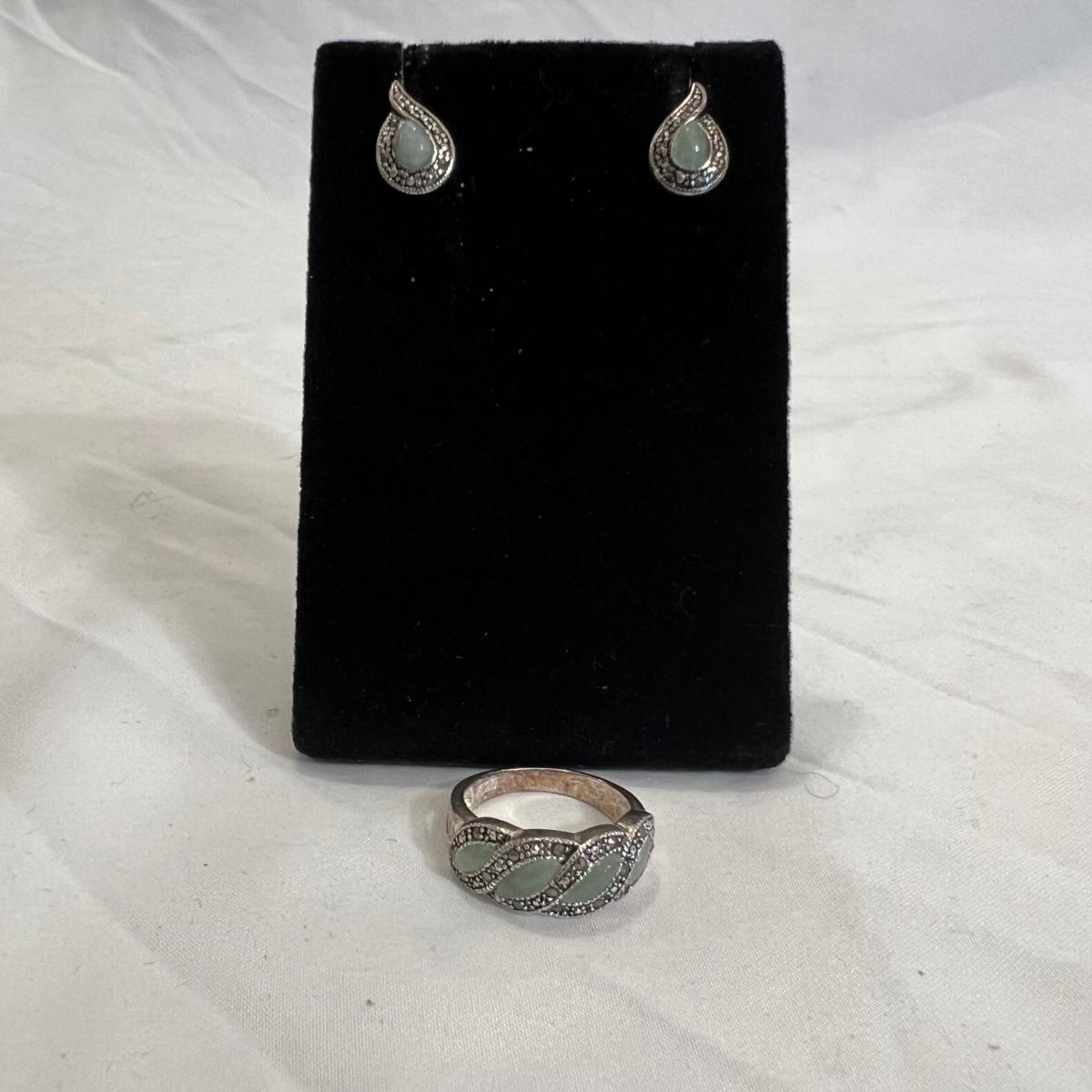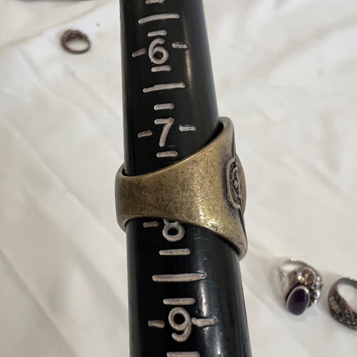 Three necklaces and 6 rings; four rings are unmarked, all other pieces have 925 stamps. The silver prayer box pendant is stamped as well as the chain, as is the heart shaped pendant which also has ruby red colored stones. Of the two 925 rings, one has jade colored stones and the other a blue stone. The jade stone ring has matching post earrings. See images for sizes.