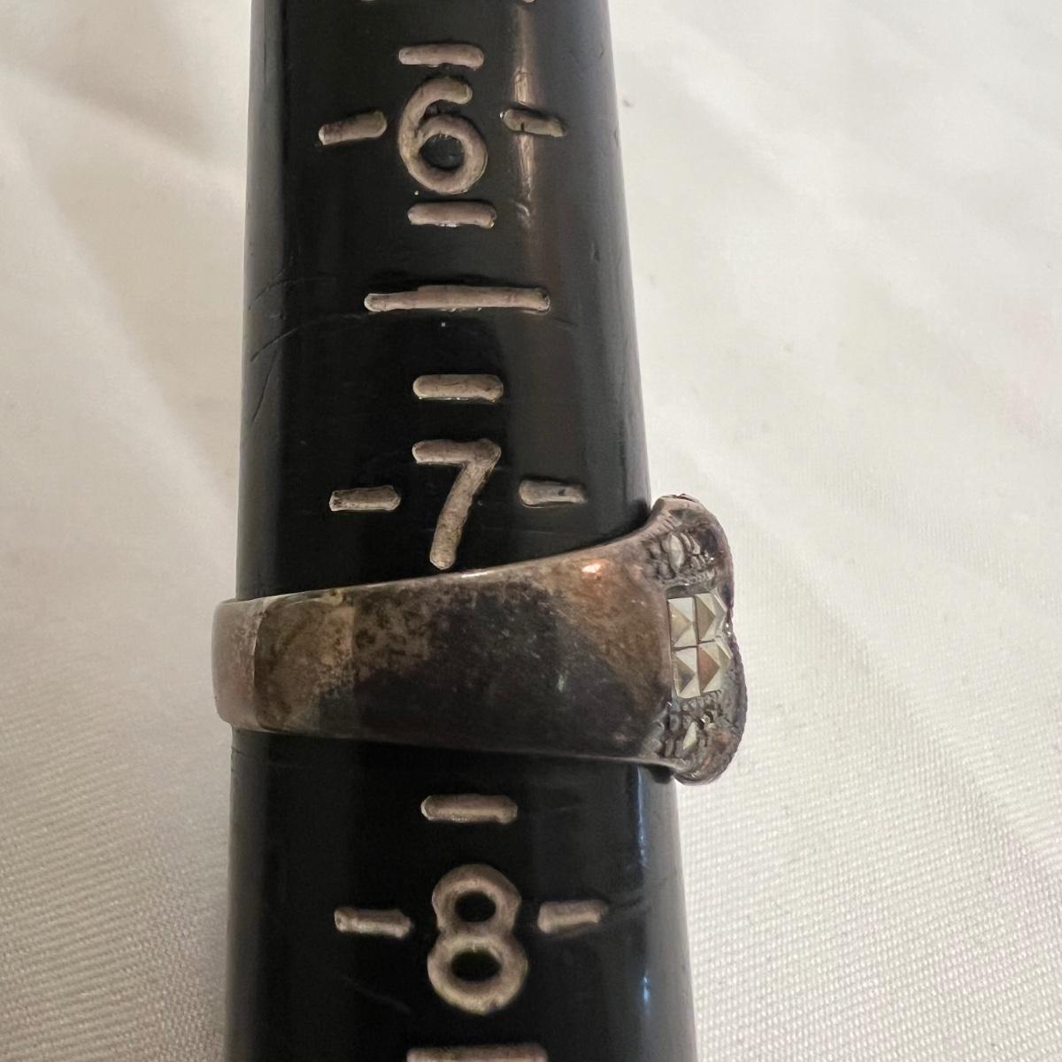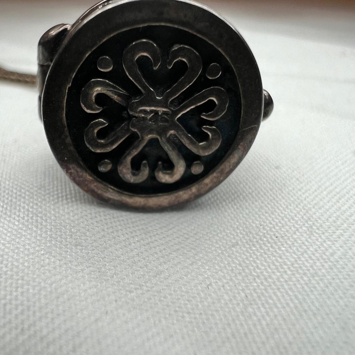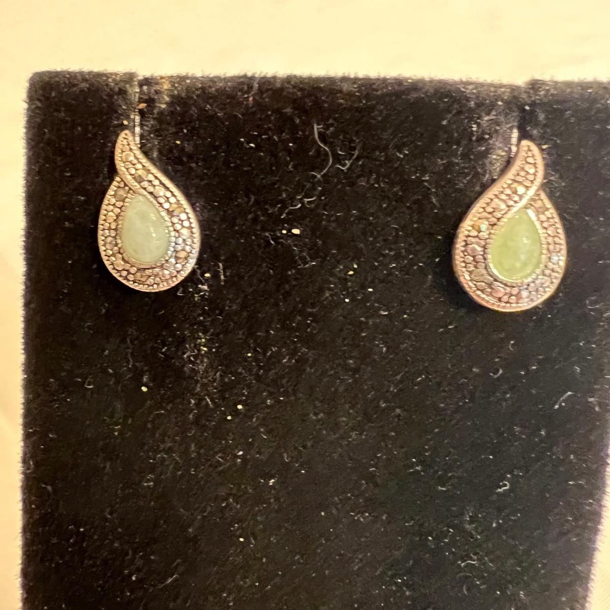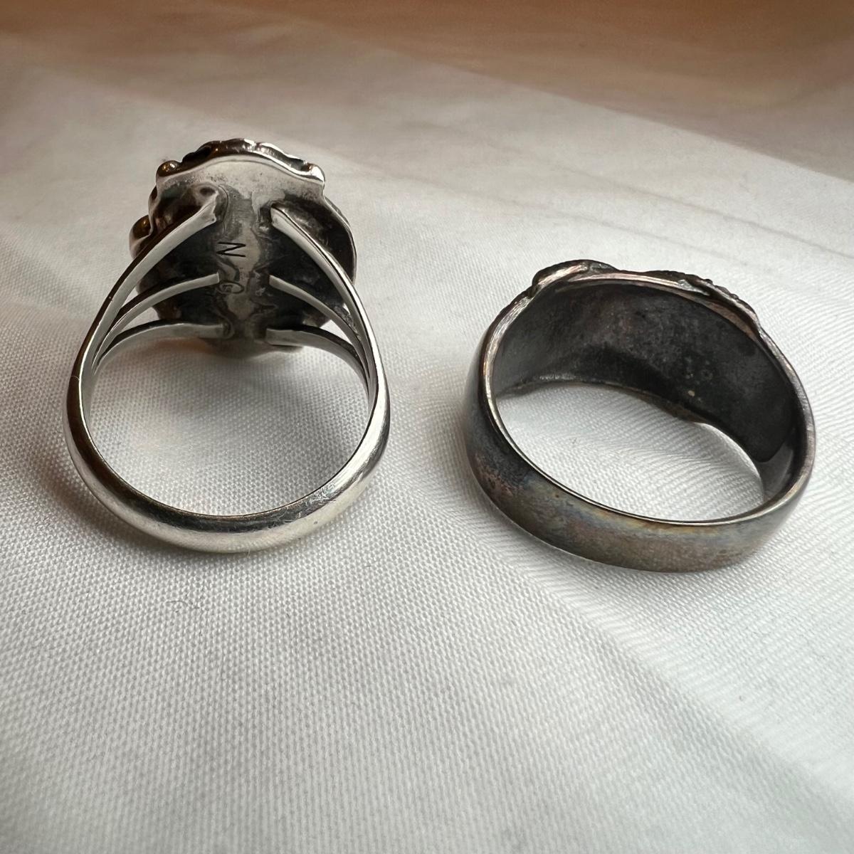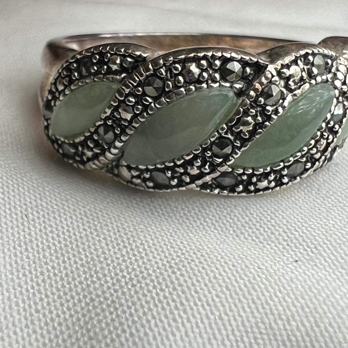 Three necklaces and 6 rings; four rings are unmarked, all other pieces have 925 stamps. The silver prayer box pendant is stamped as well as the chain, as is the heart shaped pendant which also has ruby red colored stones. Of the two 925 rings, one has jade colored stones and the other a blue stone. The jade stone ring has matching post earrings. See images for sizes.