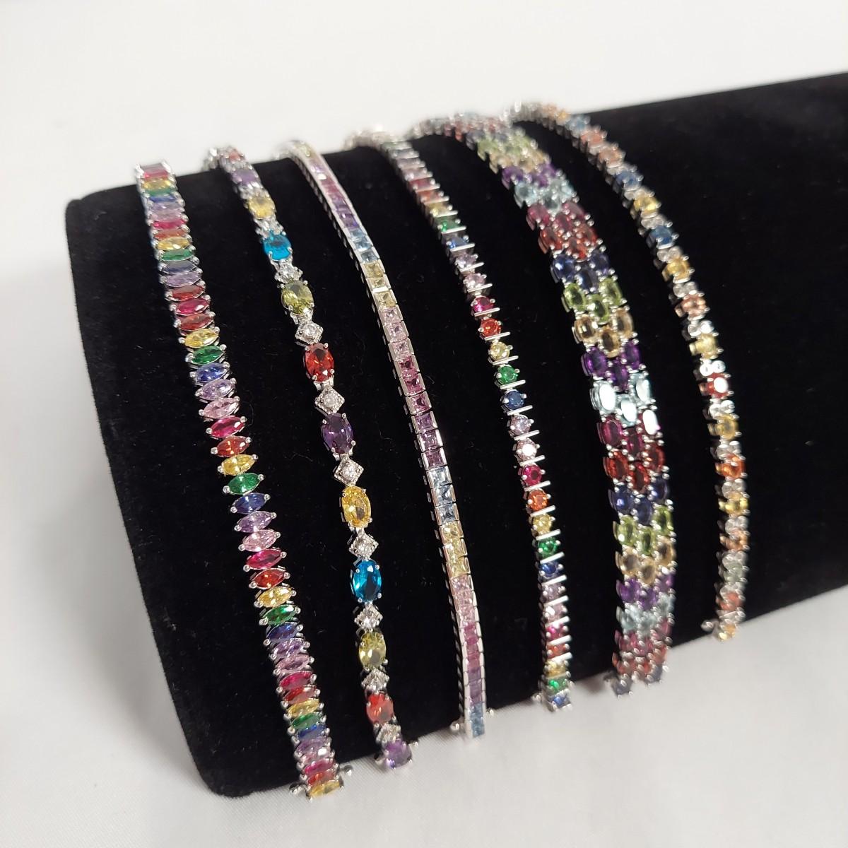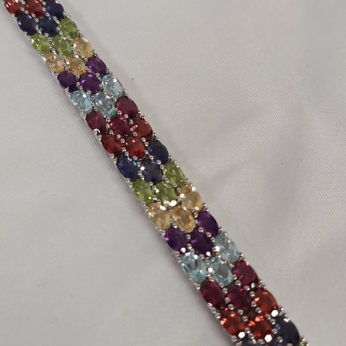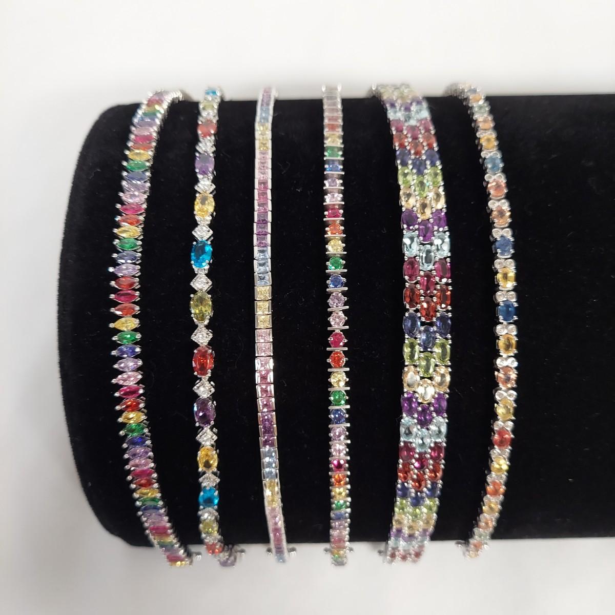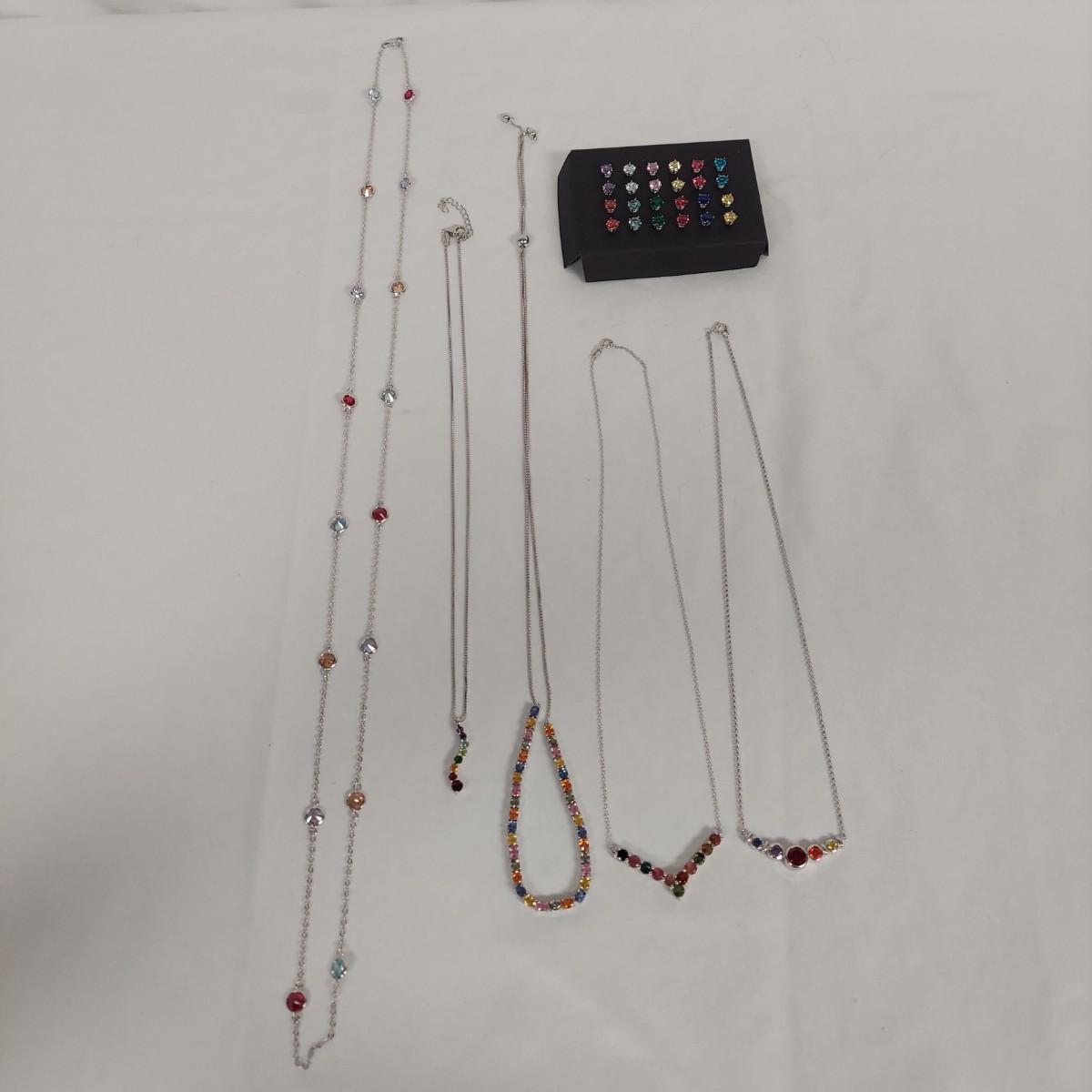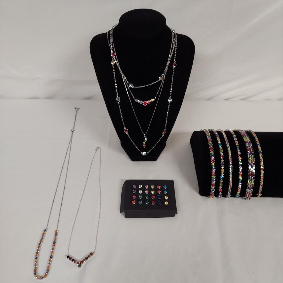 Several pieces of silver jewelry with rainbow colored gemstones. Lot includes five necklaces, six bracelets and 12 pairs of earrings for pierced ears. Some items are stamped .925. Some stones appear to be glass simulants while others may be semi precious stones. The shortest necklace has an 18" chain. The longest necklace has a 36" chain. Please see photos for all markings found. We cannot guarantee the authenticity of the gemstones. All sales are final. No returns or refunds. Please bid accordingly.
