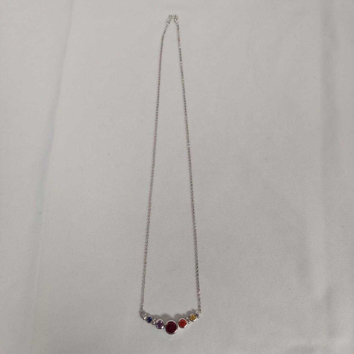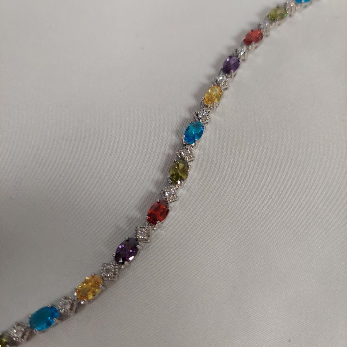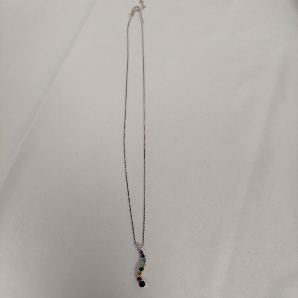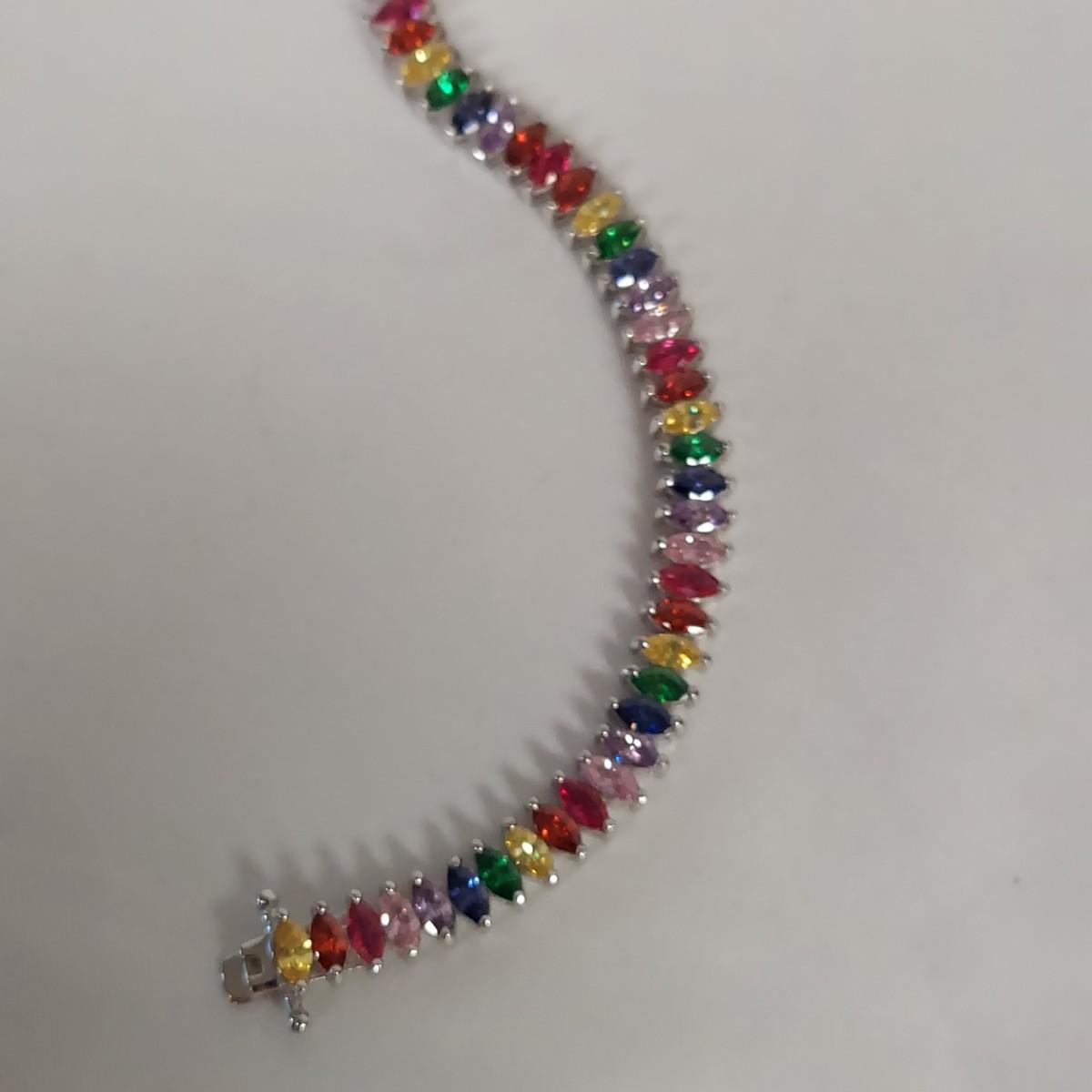 Several pieces of silver jewelry with rainbow colored gemstones. Lot includes five necklaces, six bracelets and 12 pairs of earrings for pierced ears. Some items are stamped .925. Some stones appear to be glass simulants while others may be semi precious stones. The shortest necklace has an 18" chain. The longest necklace has a 36" chain. Please see photos for all markings found. We cannot guarantee the authenticity of the gemstones. All sales are final. No returns or refunds. Please bid accordingly.