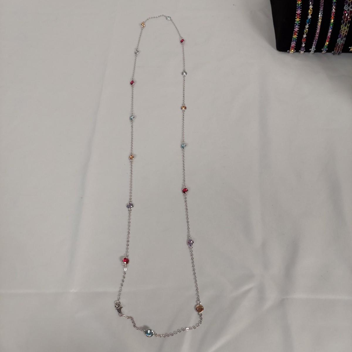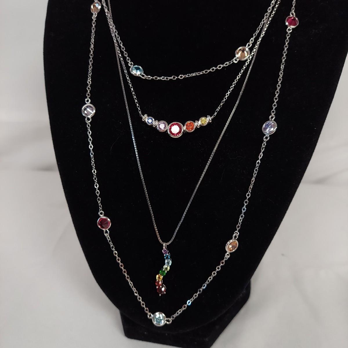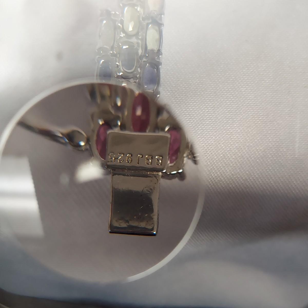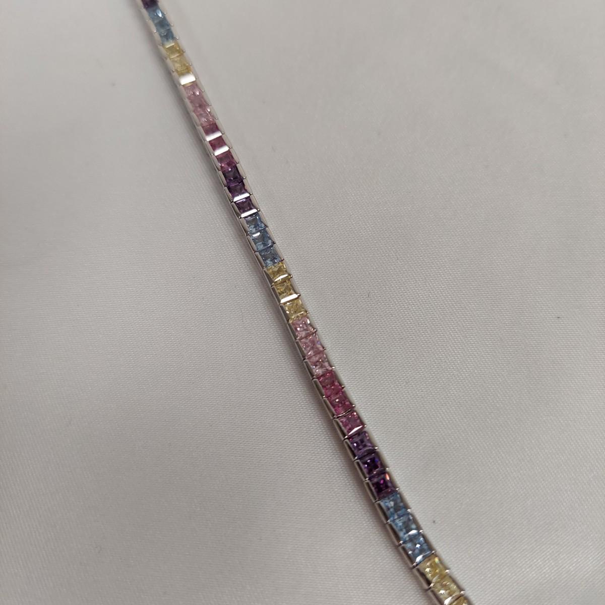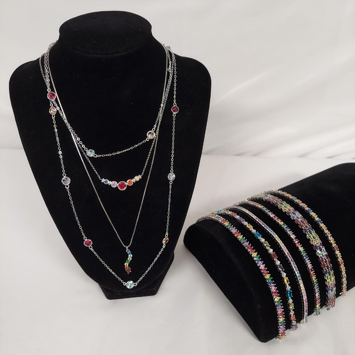 Several pieces of silver jewelry with rainbow colored gemstones. Lot includes five necklaces, six bracelets and 12 pairs of earrings for pierced ears. Some items are stamped .925. Some stones appear to be glass simulants while others may be semi precious stones. The shortest necklace has an 18" chain. The longest necklace has a 36" chain. Please see photos for all markings found. We cannot guarantee the authenticity of the gemstones. All sales are final. No returns or refunds. Please bid accordingly.