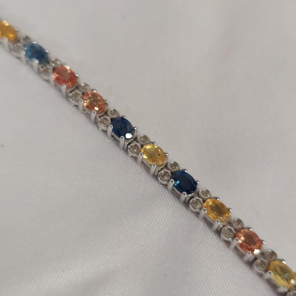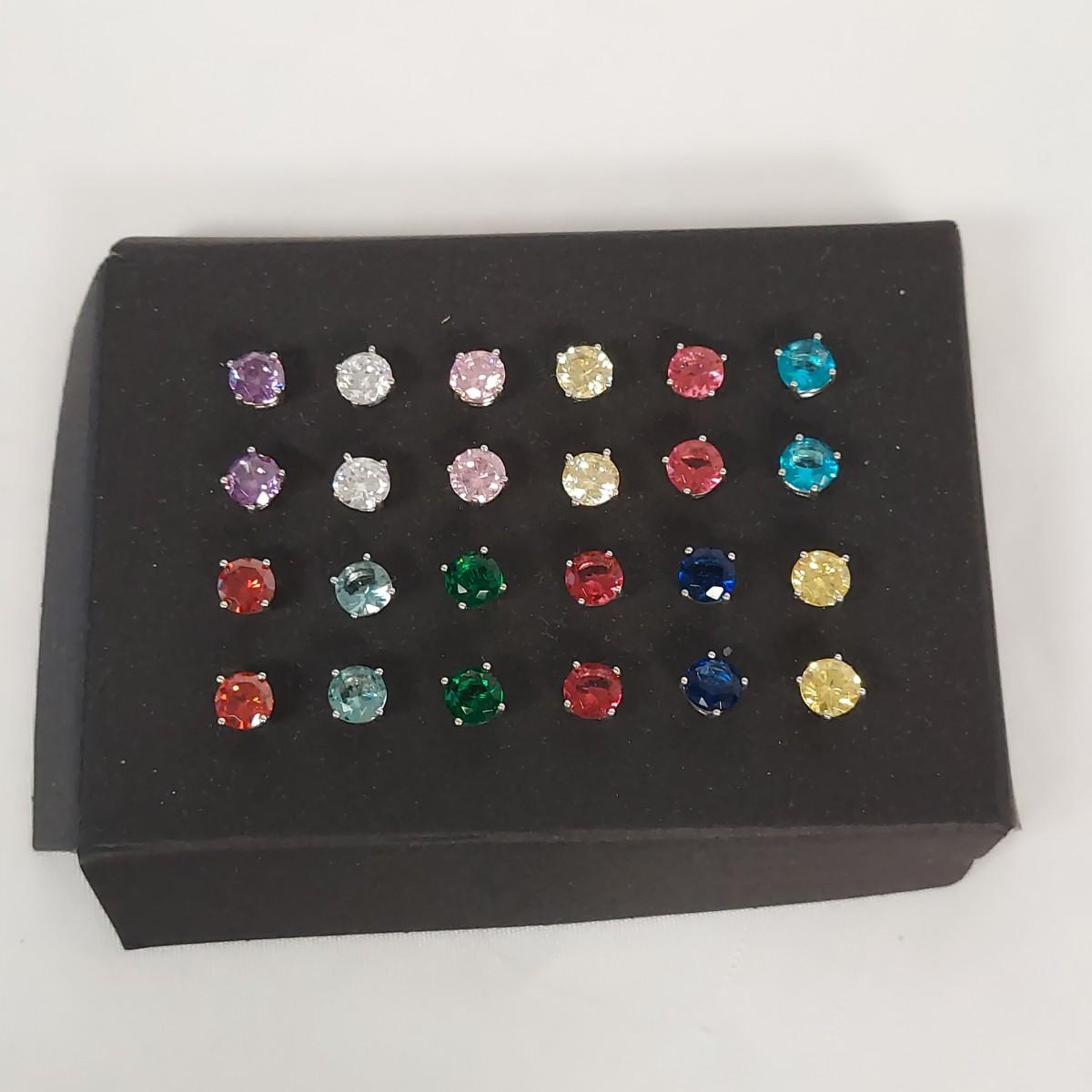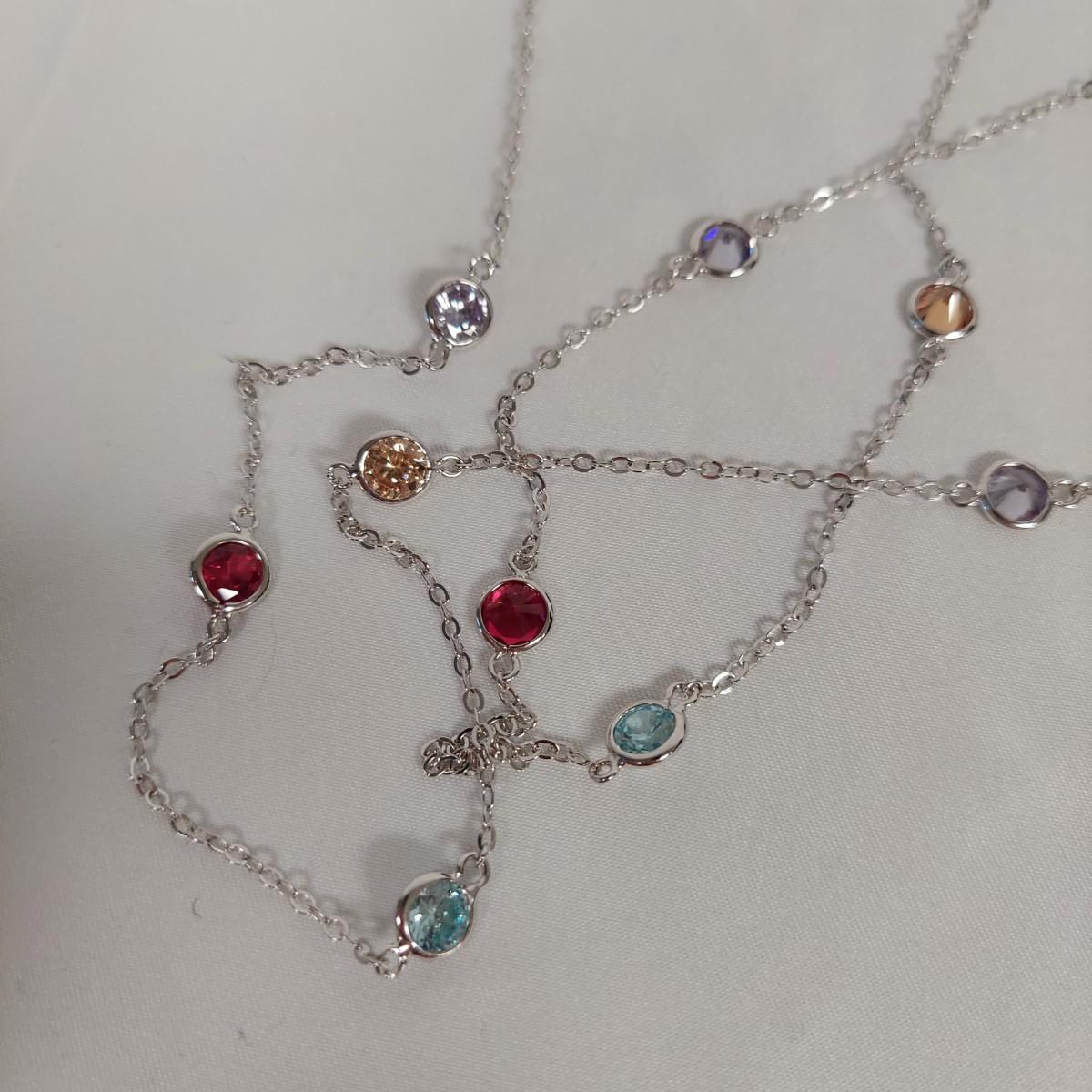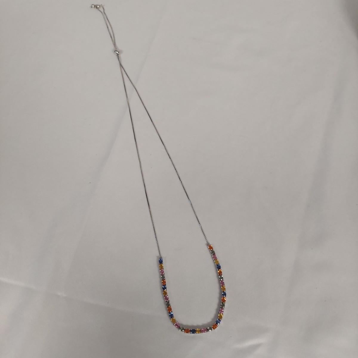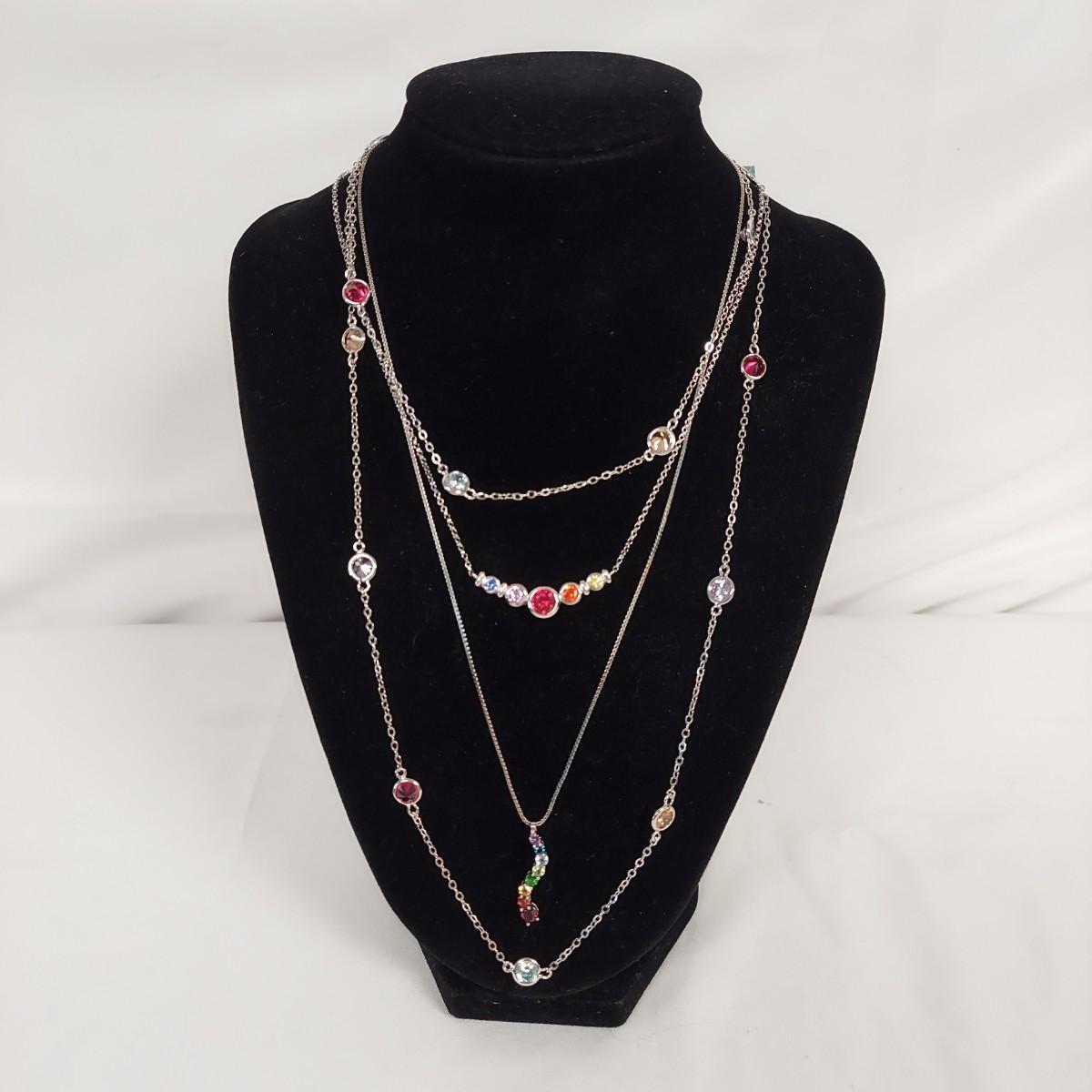 Several pieces of silver jewelry with rainbow colored gemstones. Lot includes five necklaces, six bracelets and 12 pairs of earrings for pierced ears. Some items are stamped .925. Some stones appear to be glass simulants while others may be semi precious stones. The shortest necklace has an 18" chain. The longest necklace has a 36" chain. Please see photos for all markings found. We cannot guarantee the authenticity of the gemstones. All sales are final. No returns or refunds. Please bid accordingly.