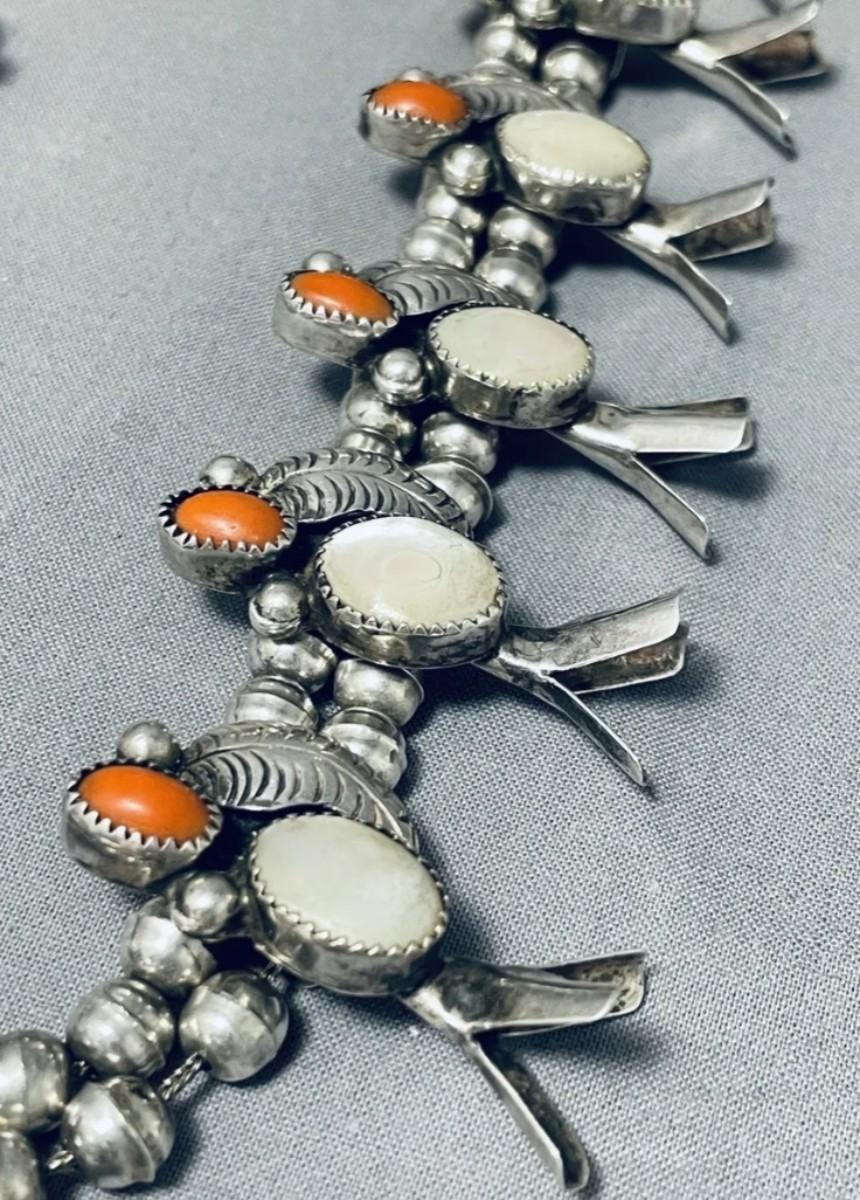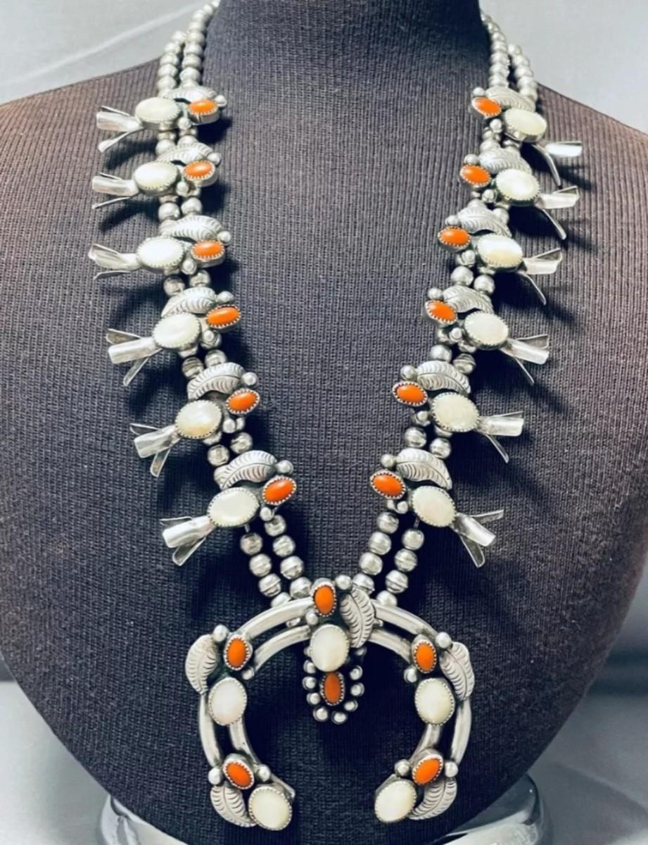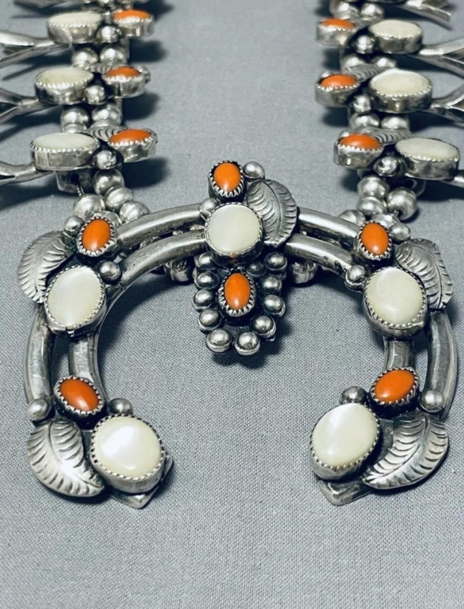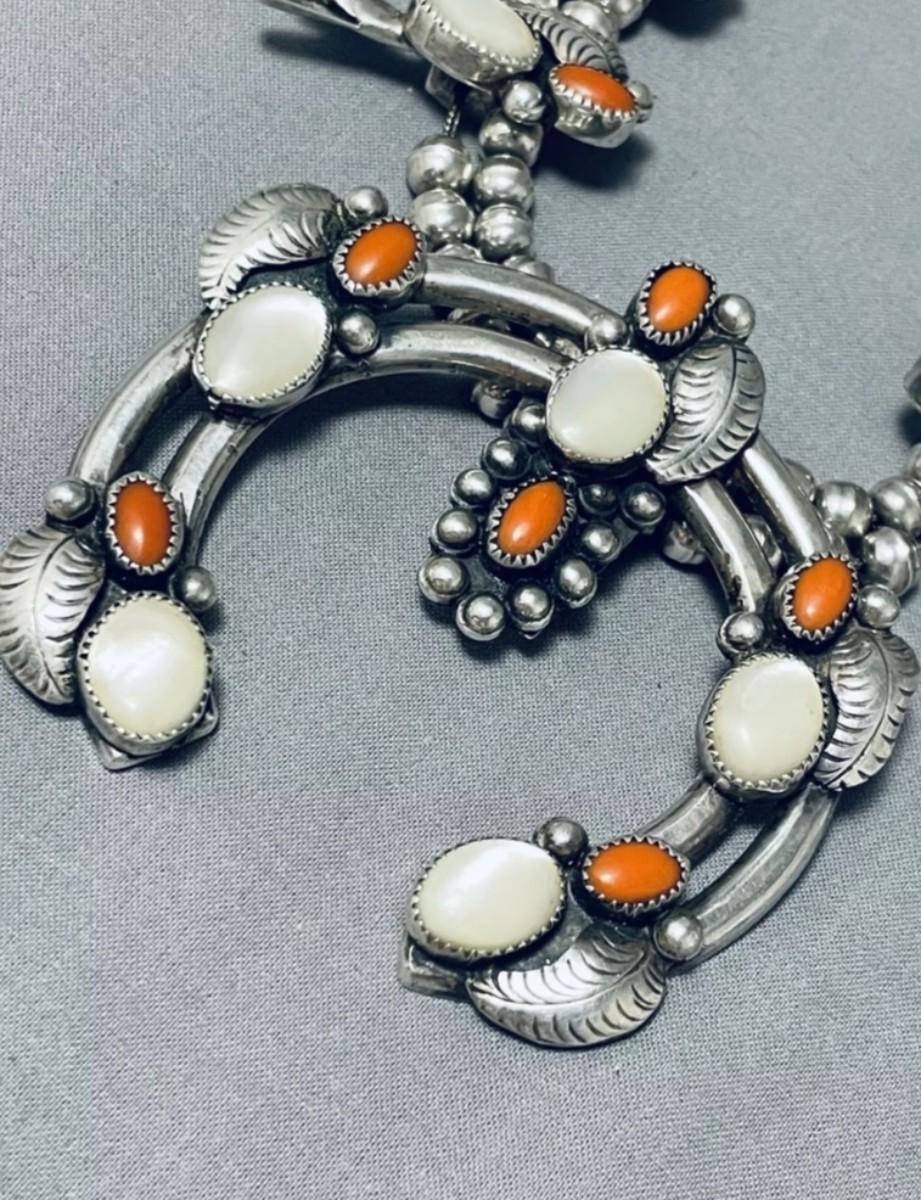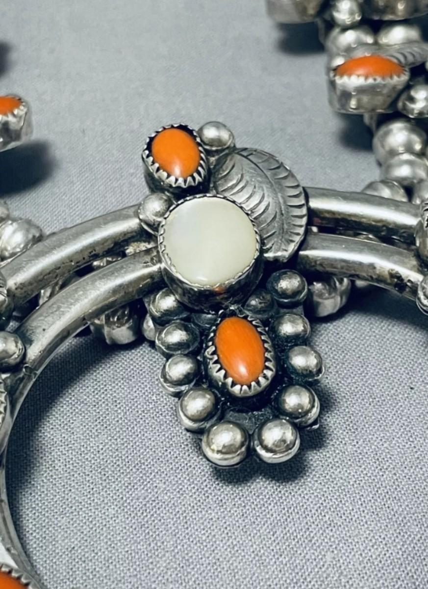 Sterling silver Red coral mother of pearl squash blossom necklace Reserve set