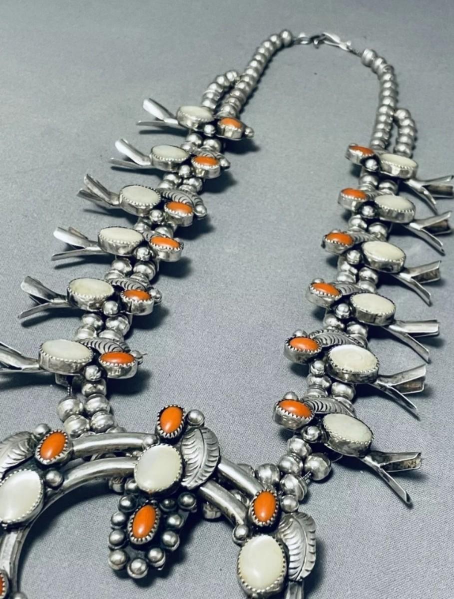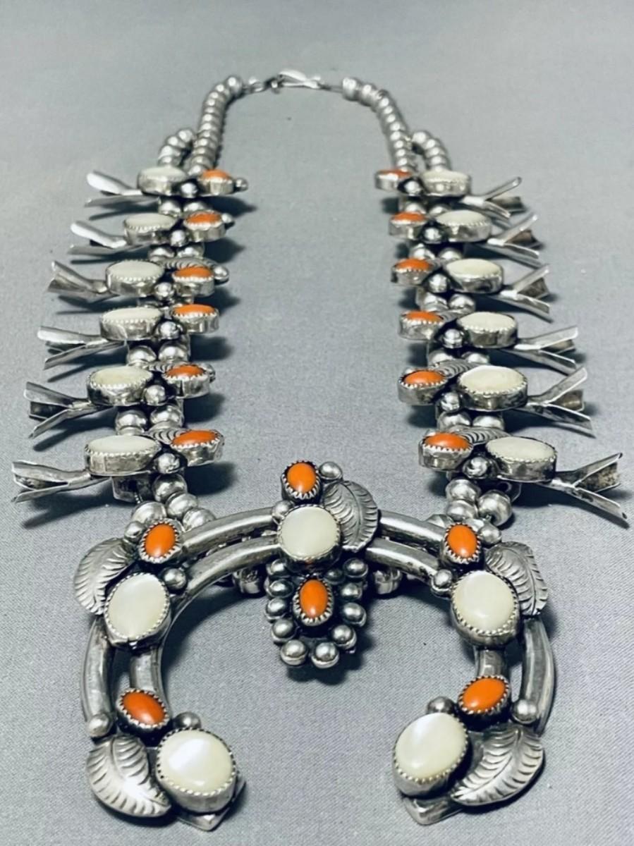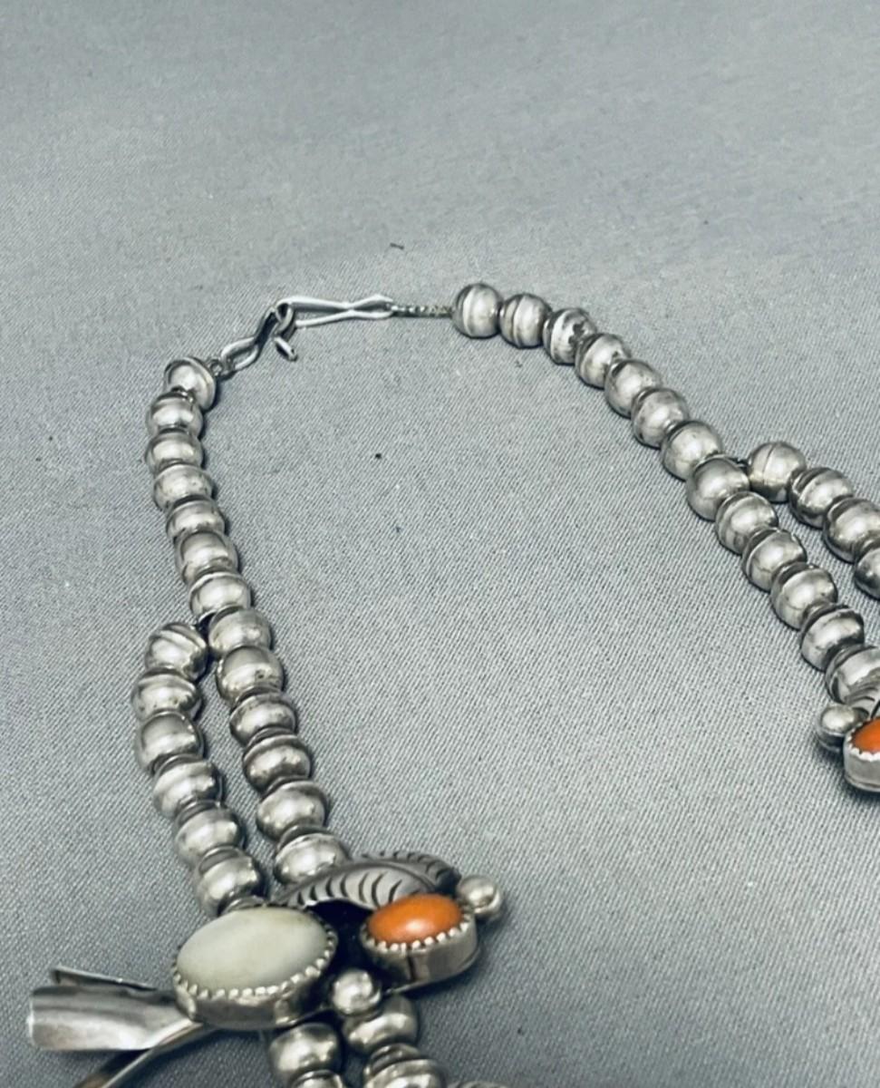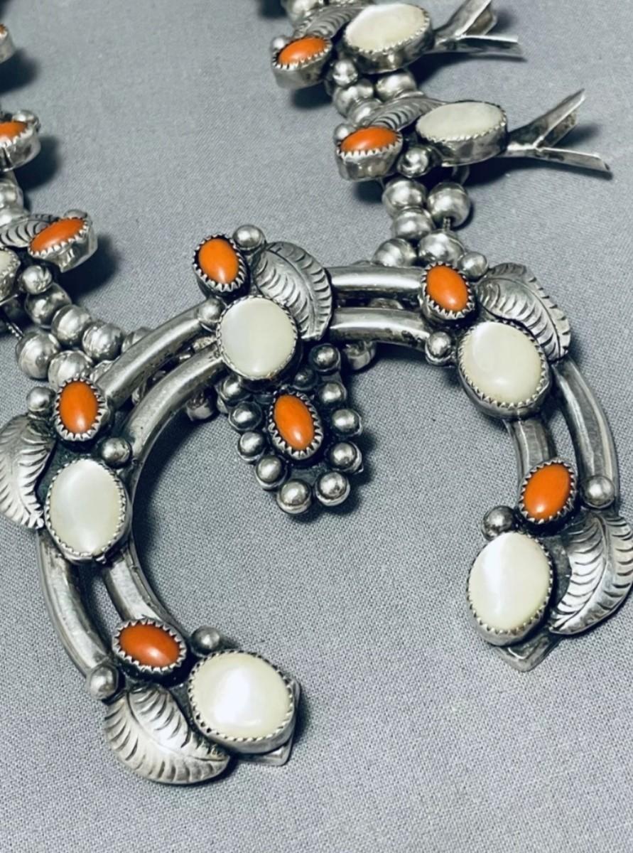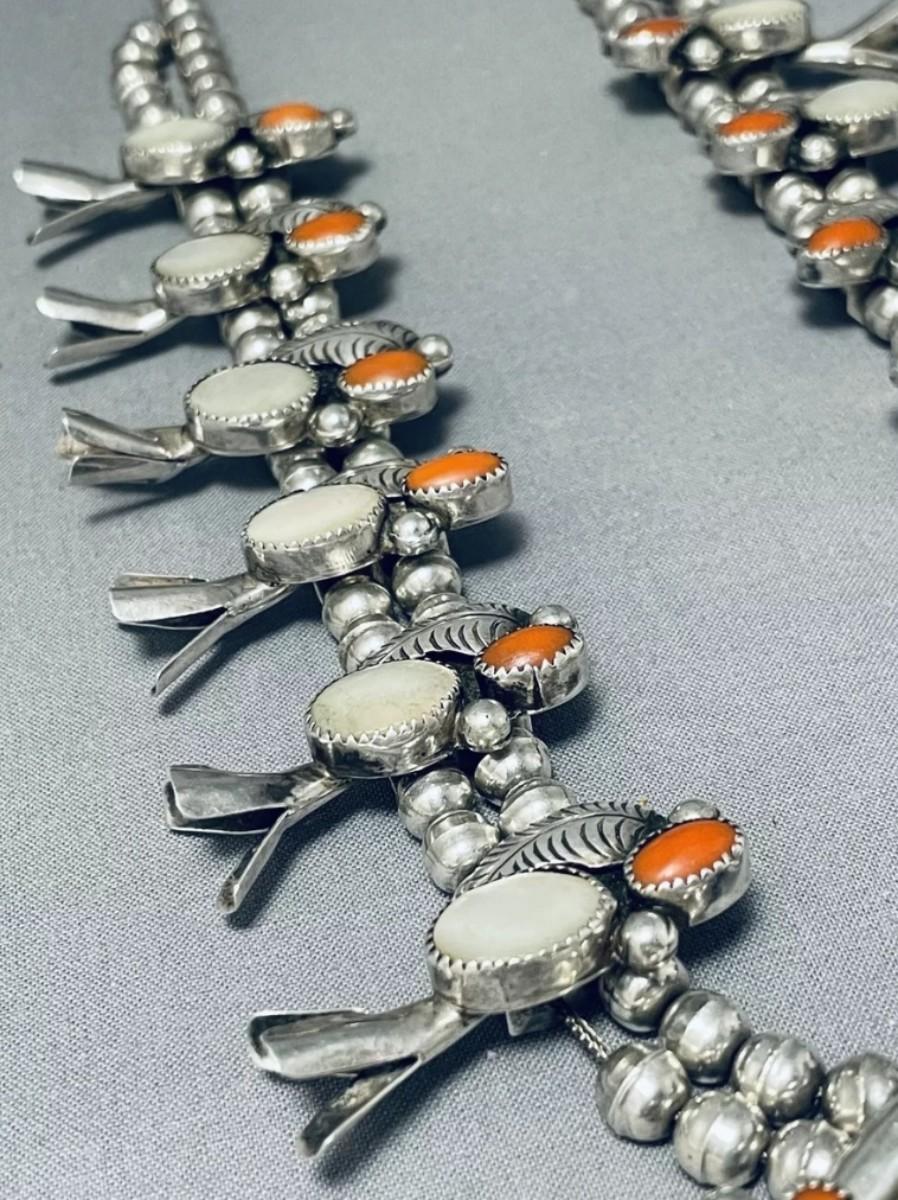 Sterling silver Red coral mother of pearl squash blossom necklace Reserve set