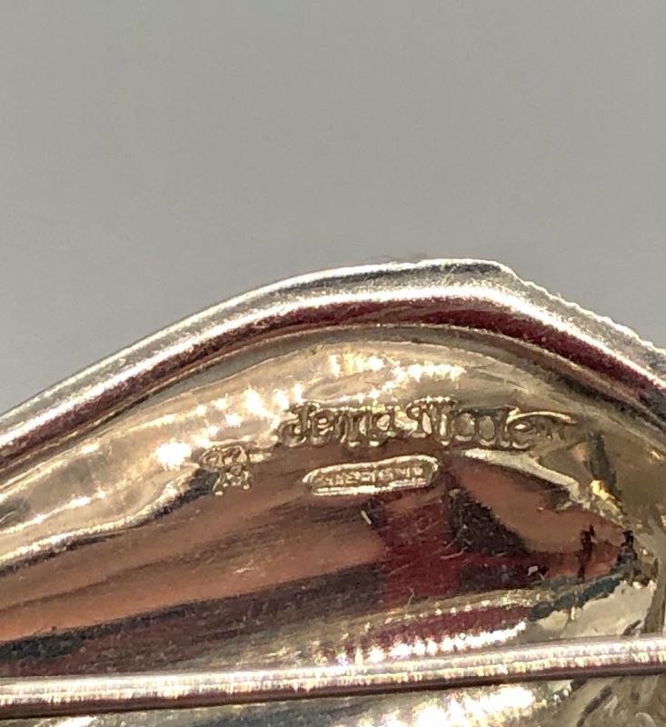 Vintage sterling silver parrot brooch by Jenna Nicole. Rhinestone body, enameled wing and tail, ruby eyes. About 2.5" length. No missing stones. Stamped on the back.