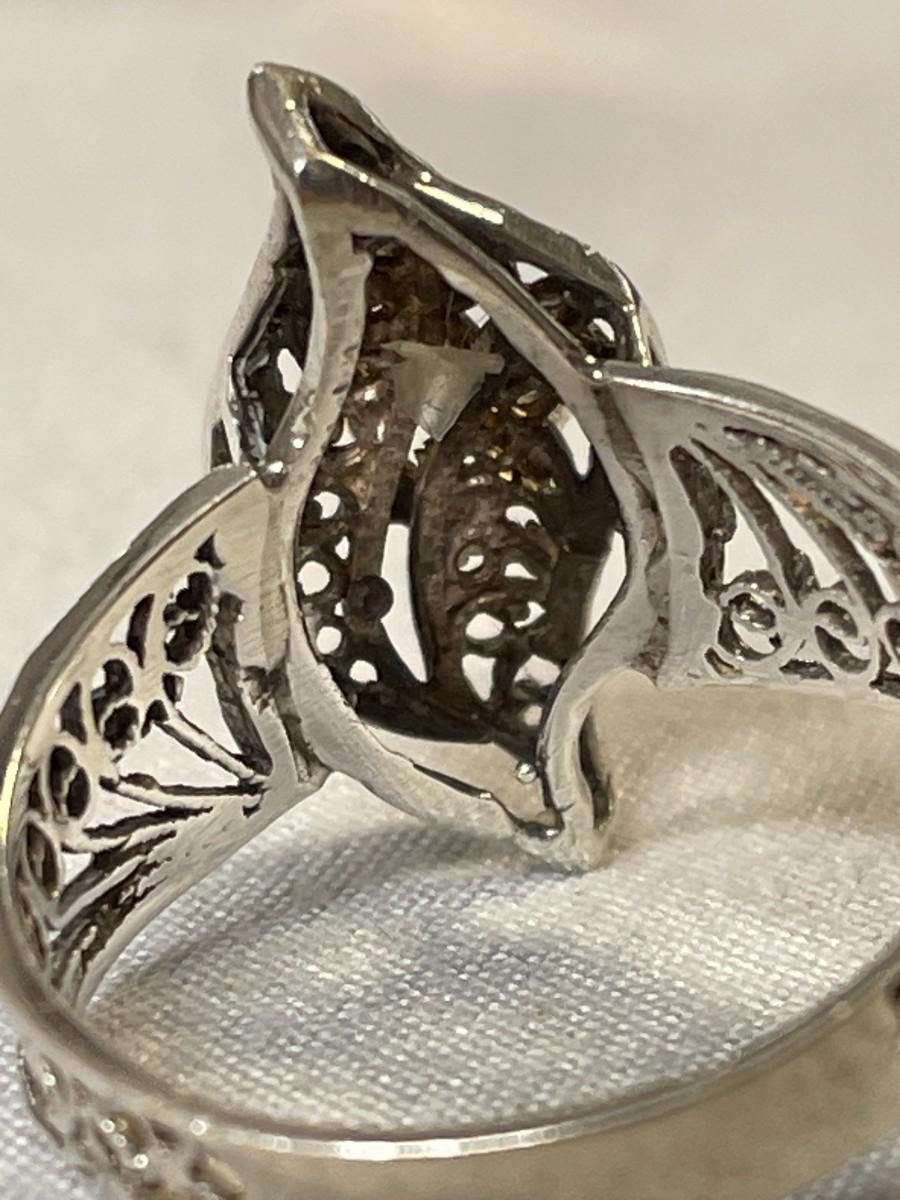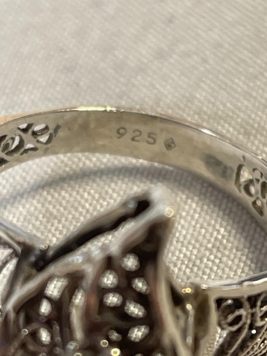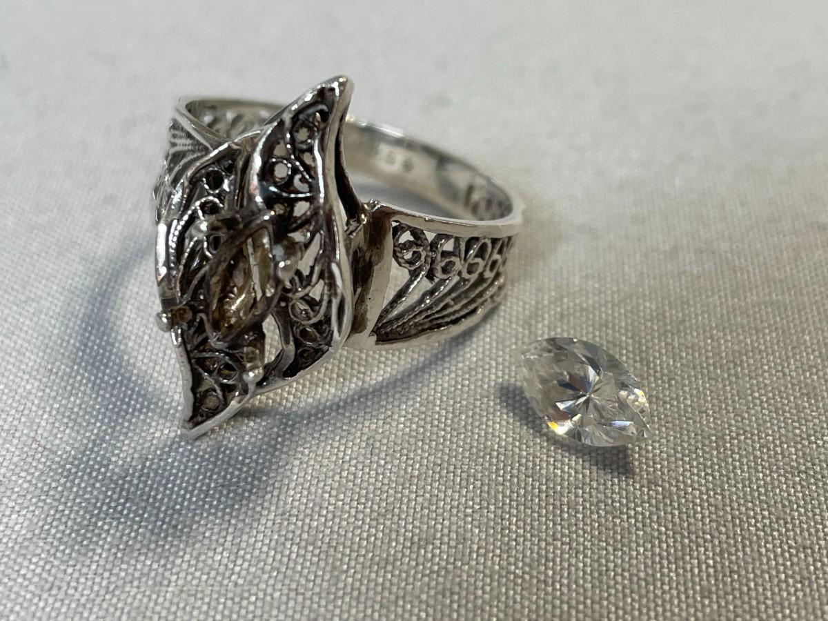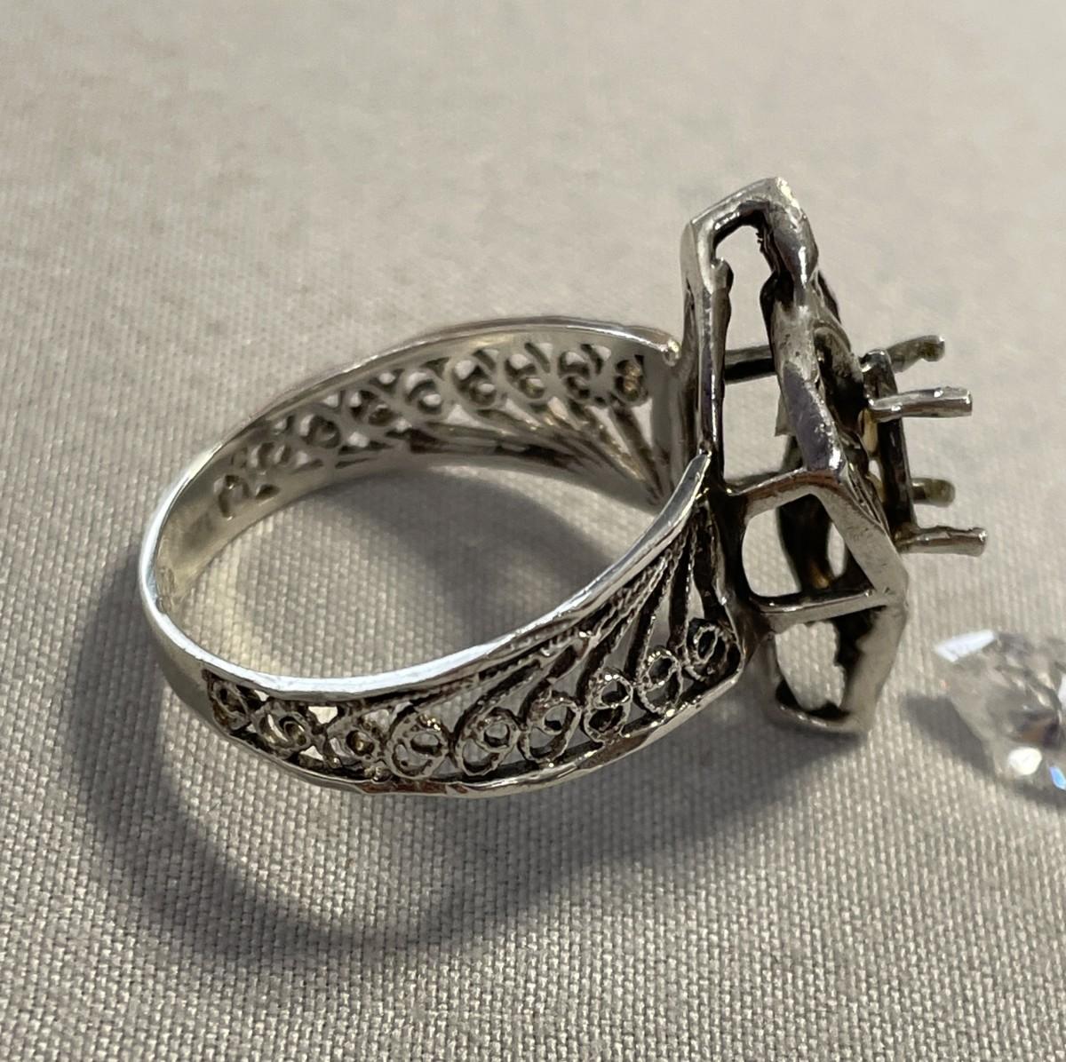 The prongs are just a little loose so the rhinestone won't stay in, but that should be an easy fix. The ring is marked 925 and is a filigree design. It is an approximate size 8.5-9.