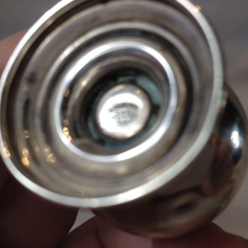 This lot is for a pair of sterling silver Salt & Pepper Shakers - they do not have weighted bottoms Together the pair weight 1.112ozt. They both have a small dents as shown in the picture but overall in very good condition. There is a makers mark on the bottom that we cannot make out. Looks like a W with an arrow. The starting bid is $10.00.