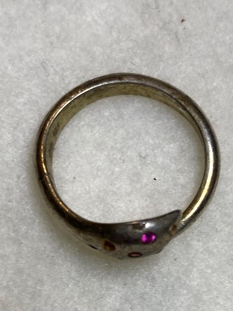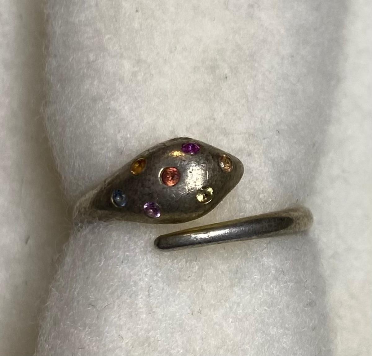 Sterling silver serpent ring with seven multicolored stones. Size 6