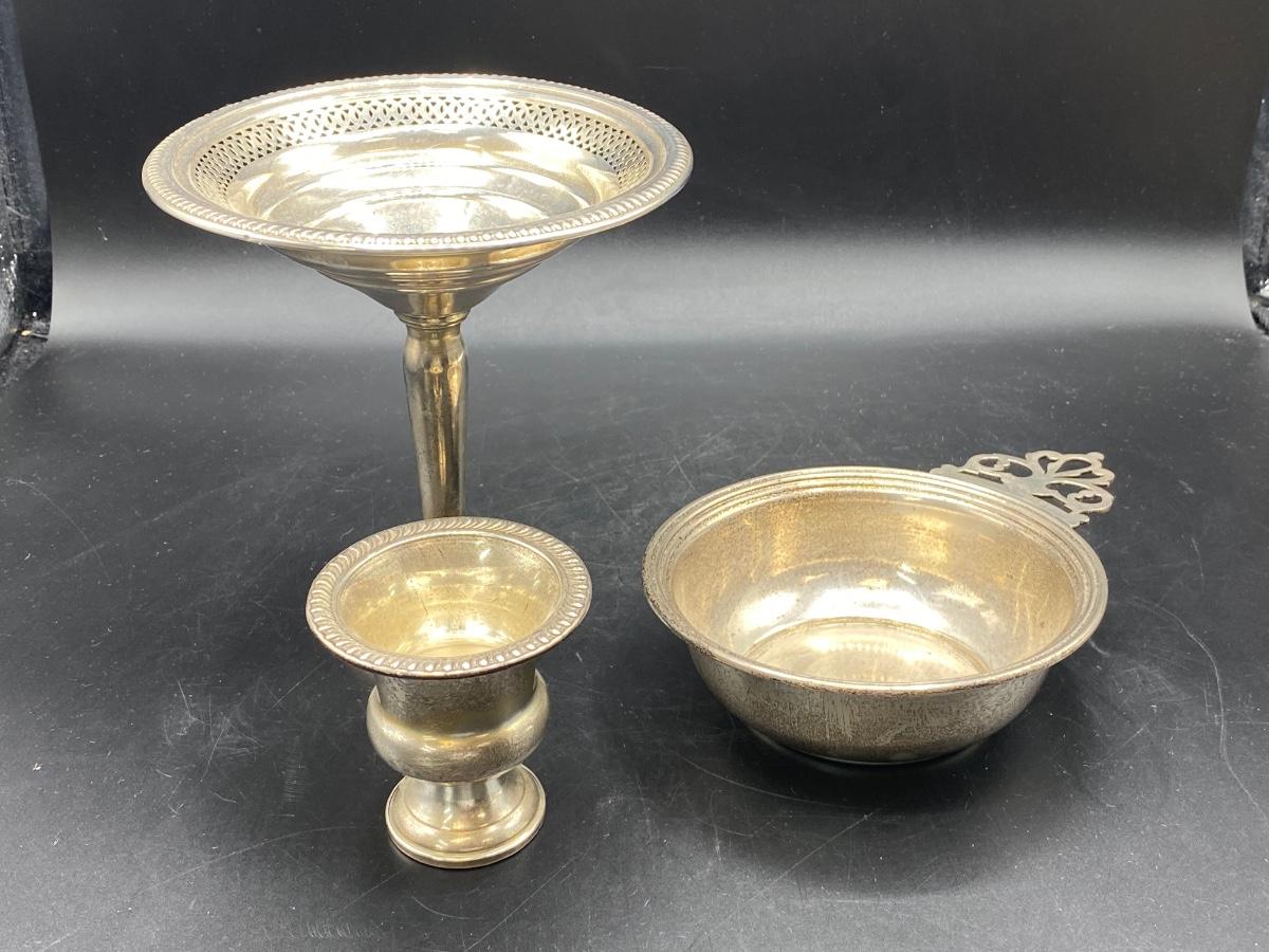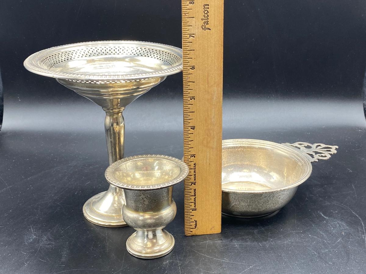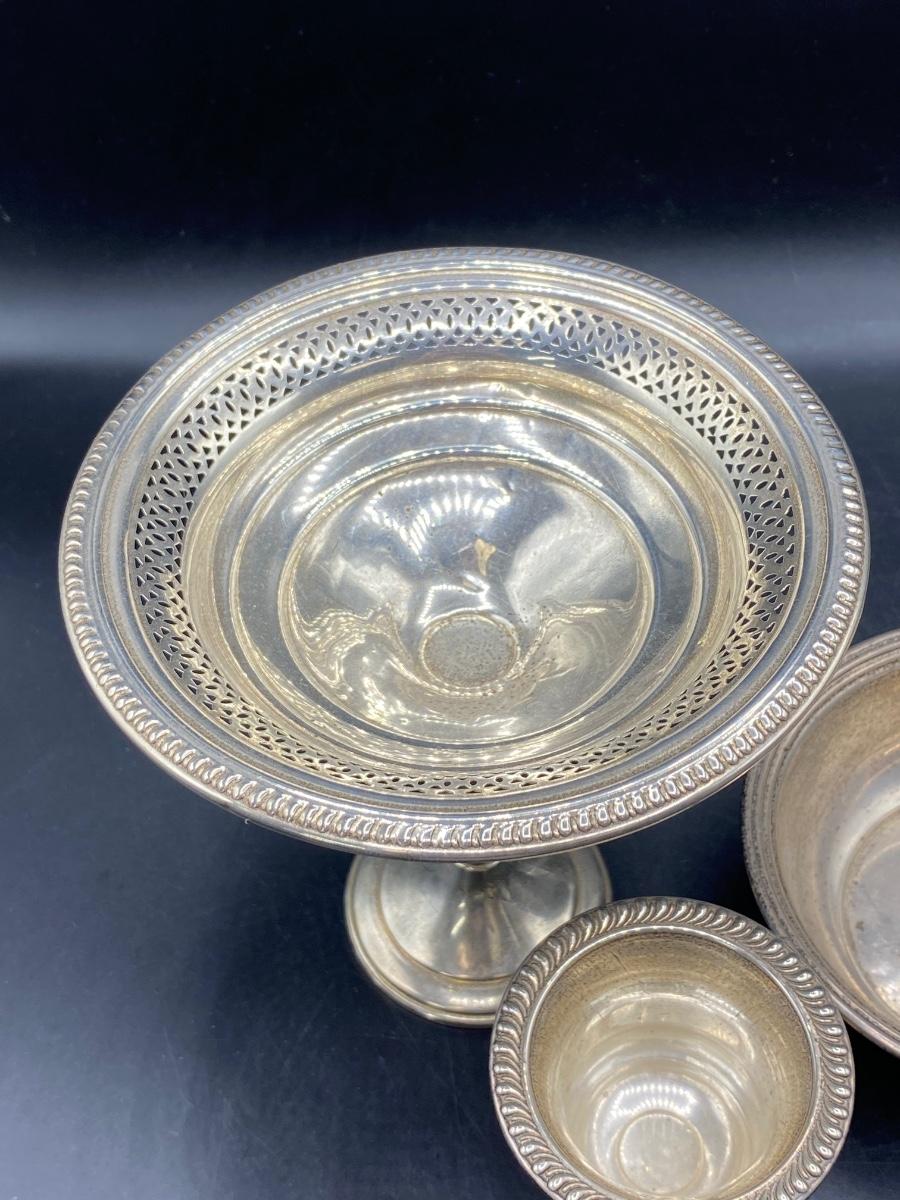 Set of 3 sterling silver serving pieces. Pedestal compote with lattice edge, a small toothpick holder cup, and a single handle bowl. All in good condition. Marked pieces from Empire and Lord Saybrook International.