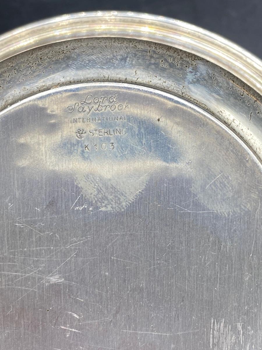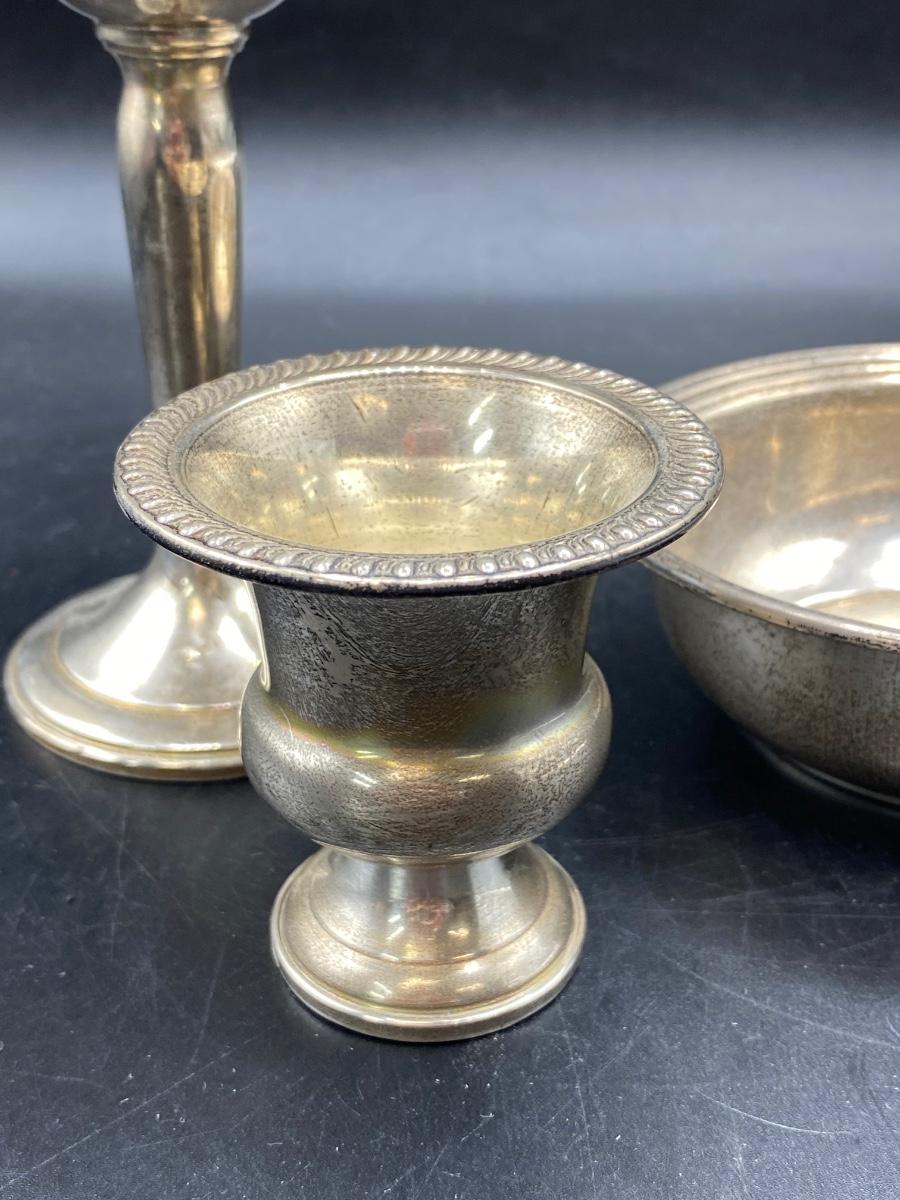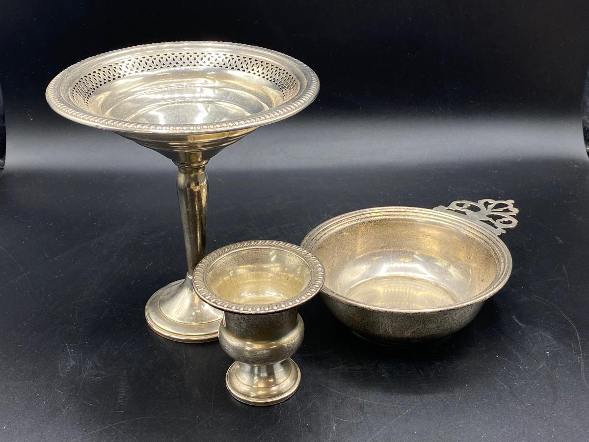 Set of 3 sterling silver serving pieces. Pedestal compote with lattice edge, a small toothpick holder cup, and a single handle bowl. All in good condition. Marked pieces from Empire and Lord Saybrook International.