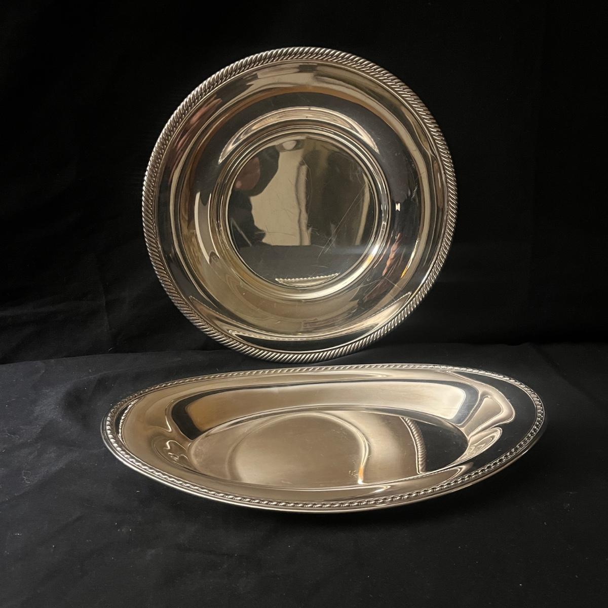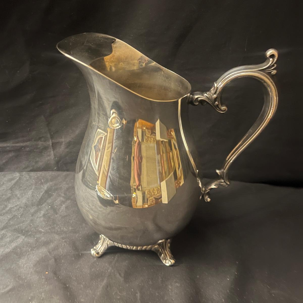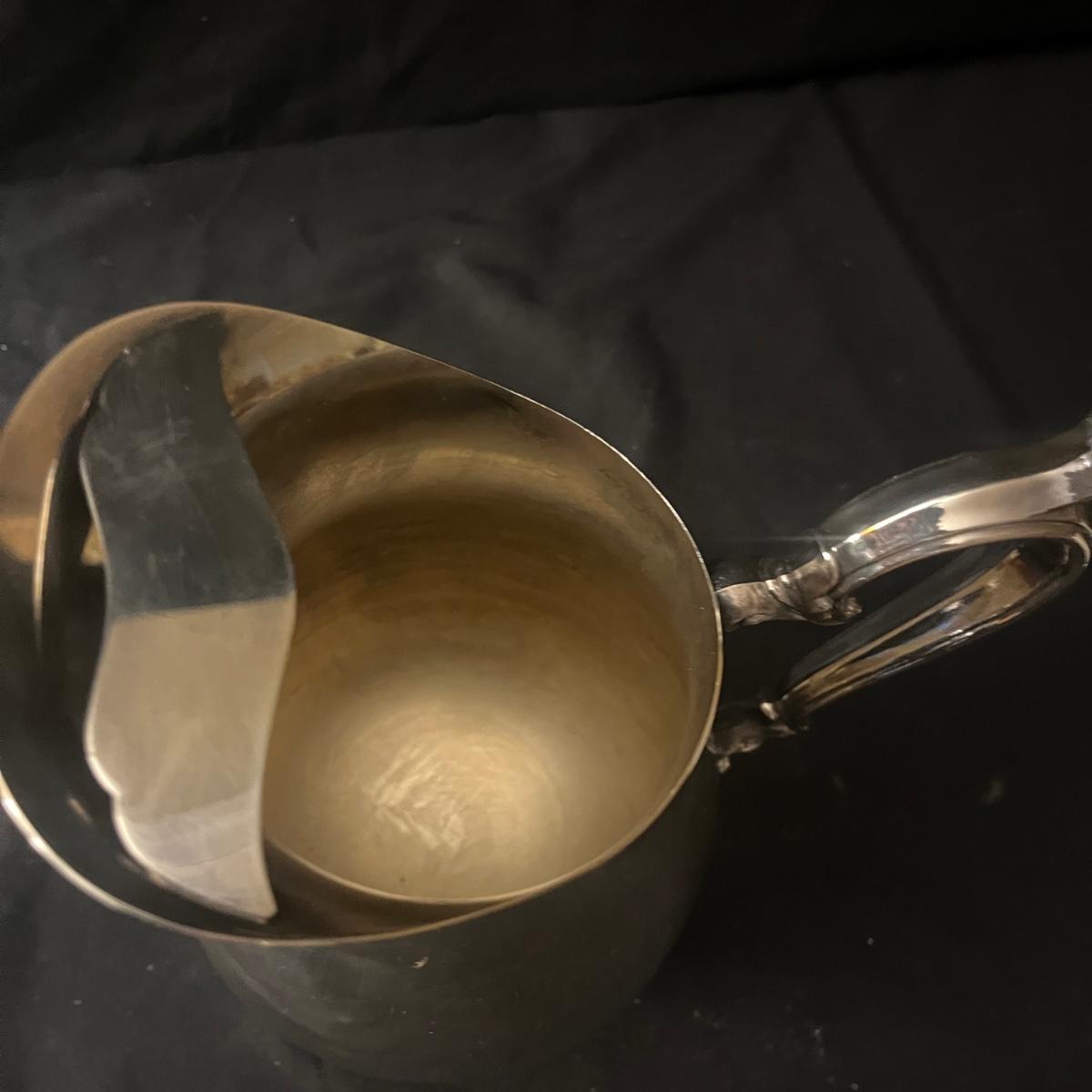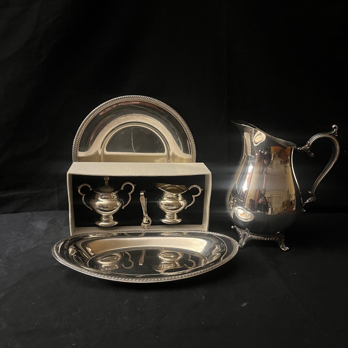 Lot includes two Castleton International Silver plates (one round, one oval), as well as a Wm Rogers silverplate pitcher. There is a cream and sugar set with a small pitcher, a lidded bowl and tongs, all marked Sterling. They have a brand marking that is illegible. Wm. Rogers pitcher measures 8” x 5.5” x 9”H.