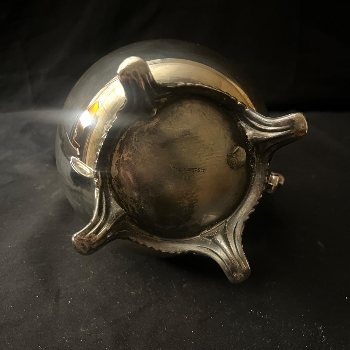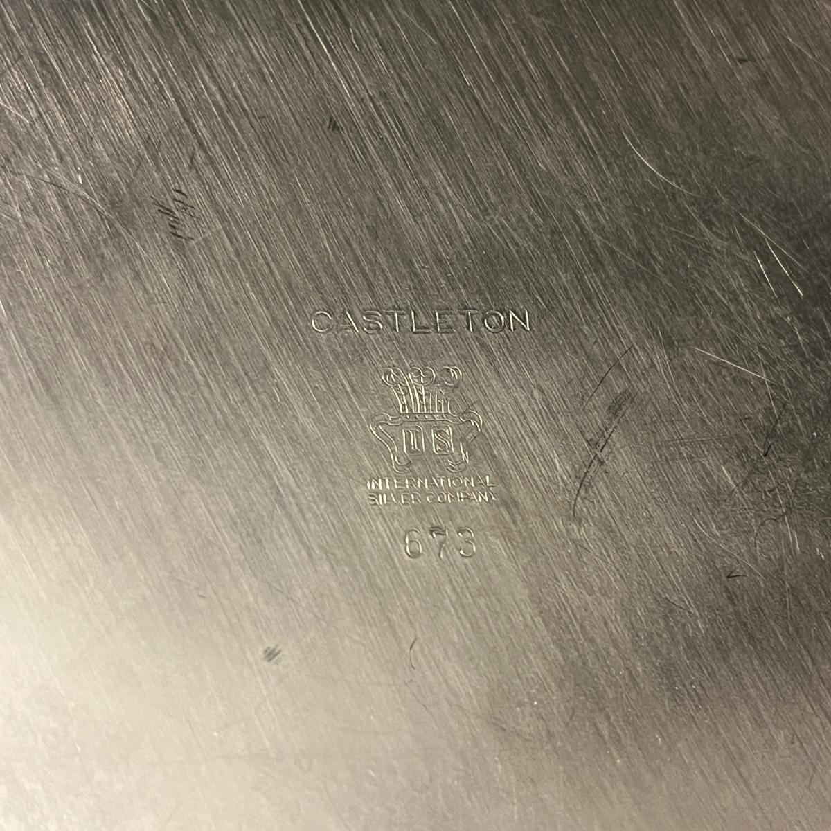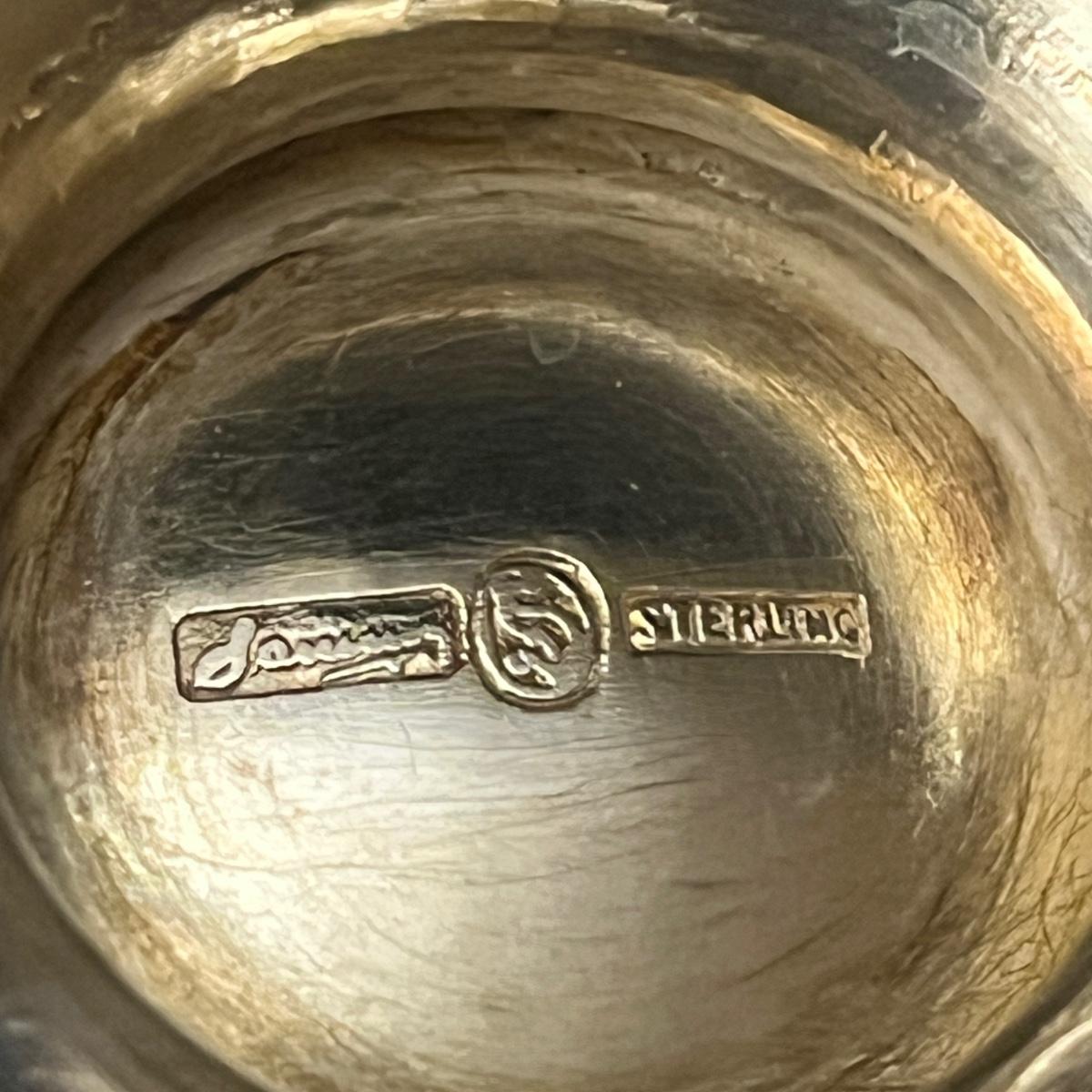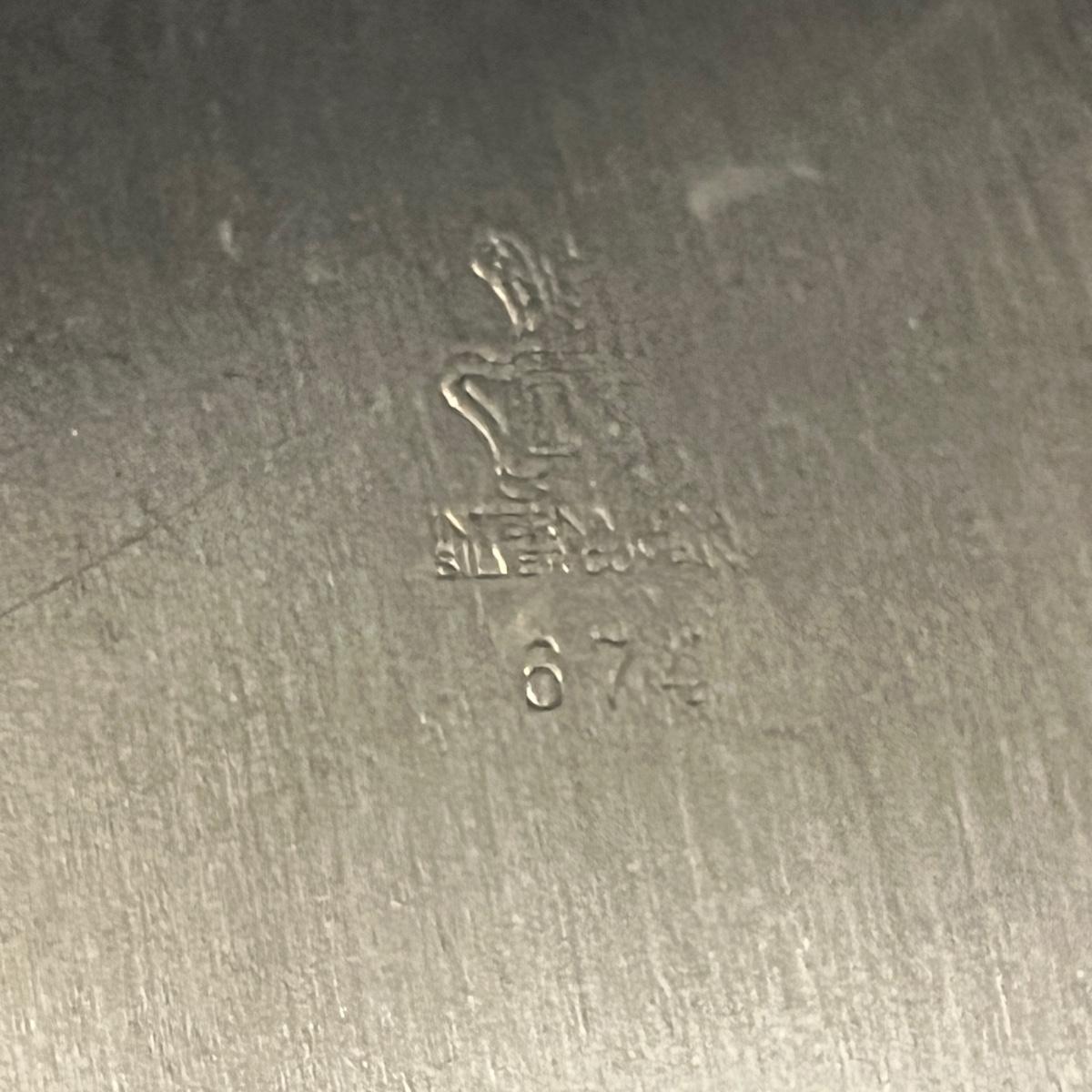 Lot includes two Castleton International Silver plates (one round, one oval), as well as a Wm Rogers silverplate pitcher. There is a cream and sugar set with a small pitcher, a lidded bowl and tongs, all marked Sterling. They have a brand marking that is illegible. Wm. Rogers pitcher measures 8” x 5.5” x 9”H.