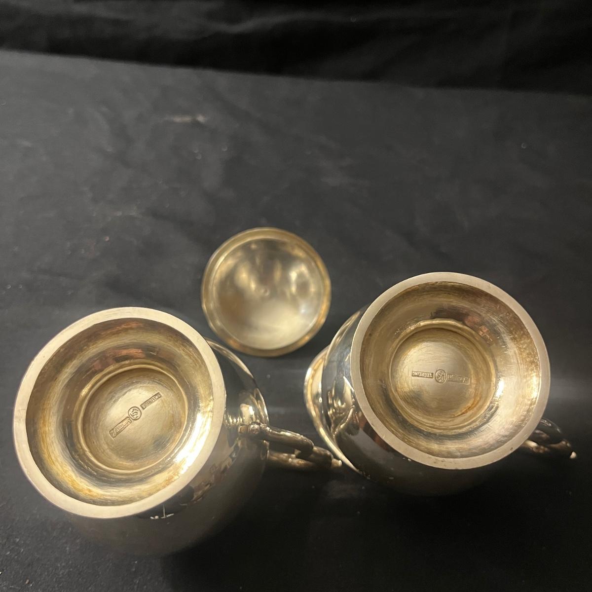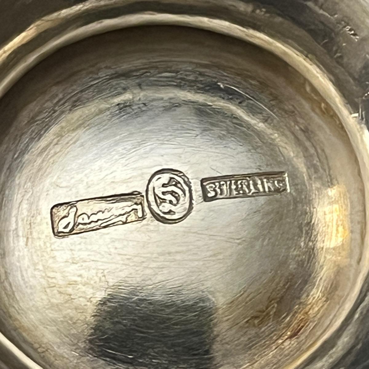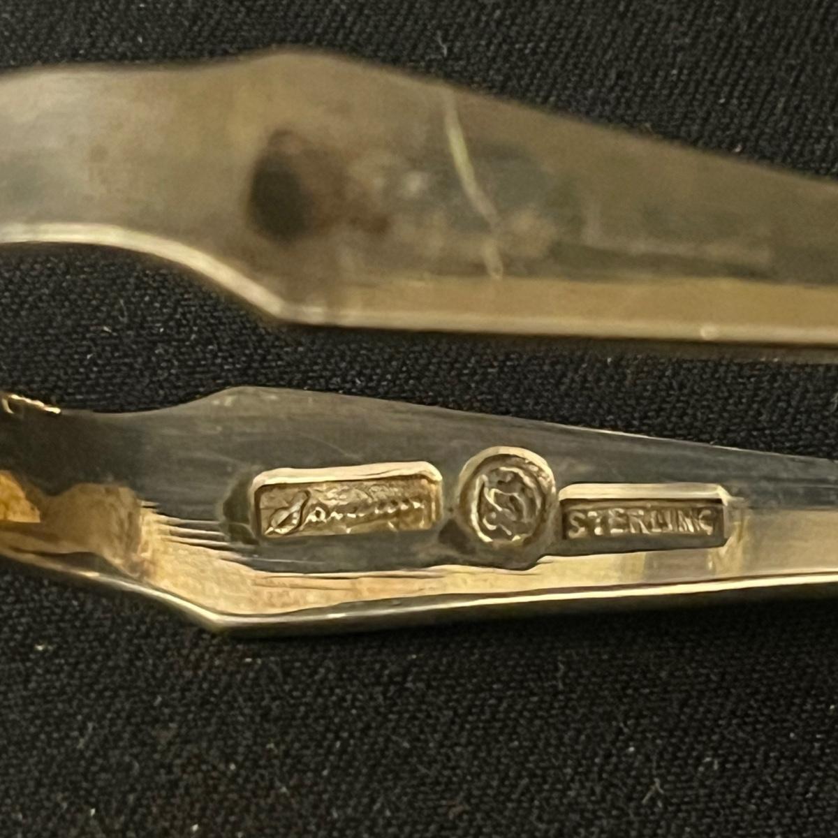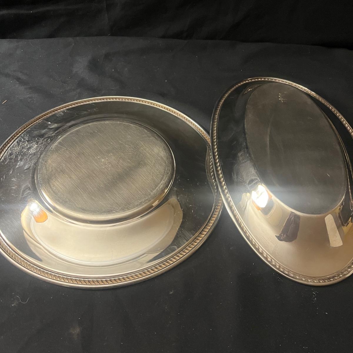 Lot includes two Castleton International Silver plates (one round, one oval), as well as a Wm Rogers silverplate pitcher. There is a cream and sugar set with a small pitcher, a lidded bowl and tongs, all marked Sterling. They have a brand marking that is illegible. Wm. Rogers pitcher measures 8” x 5.5” x 9”H.