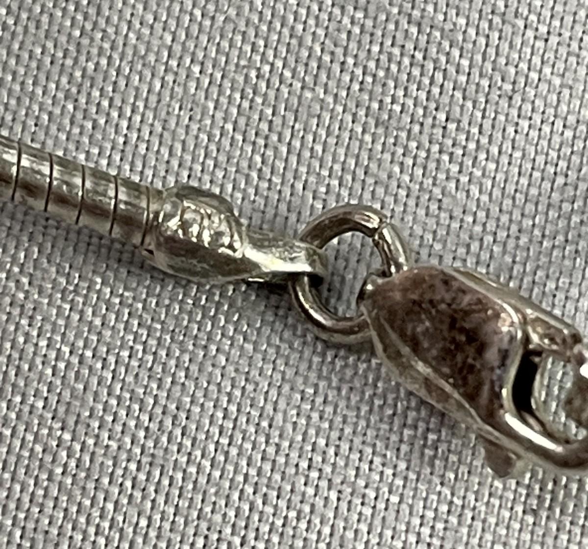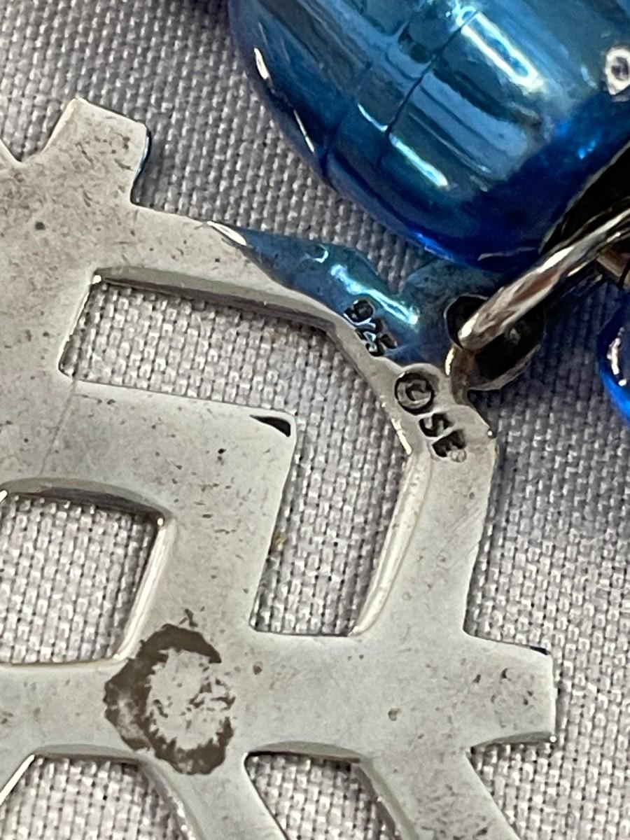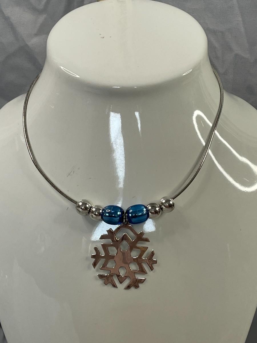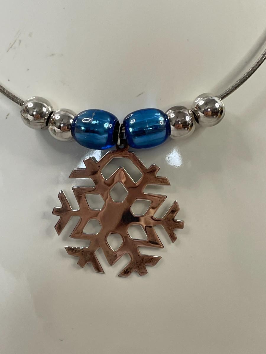 The snowflake is about 1.75 inches long and marked 925 SE at the top. The chain is about 18 inches long and marked 925 at the clasp.
