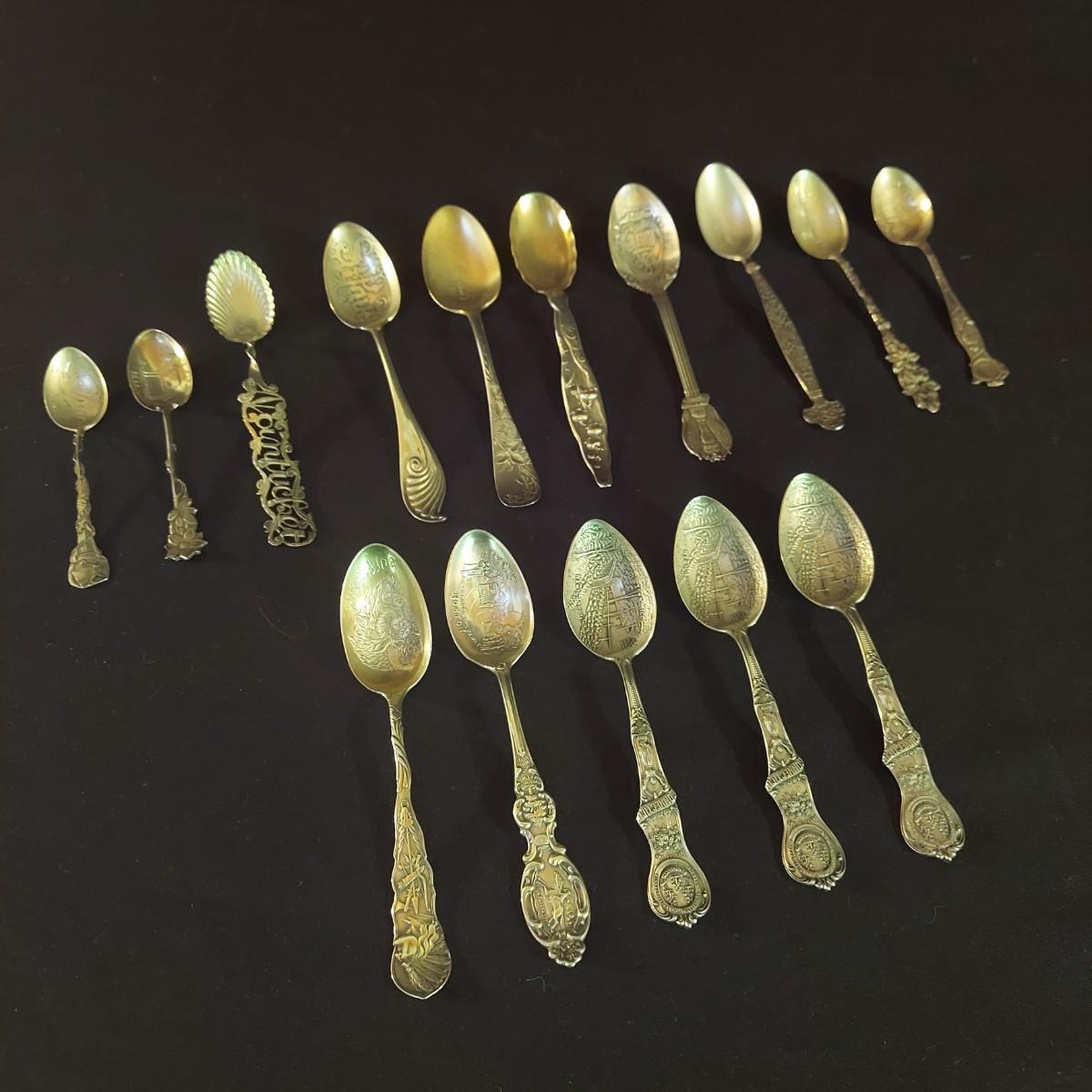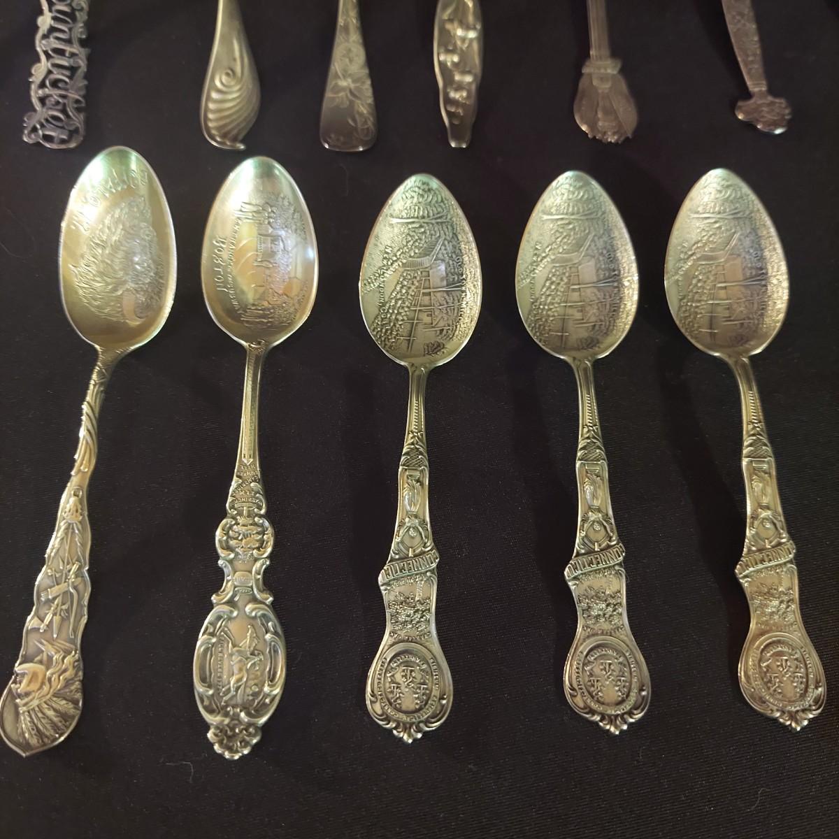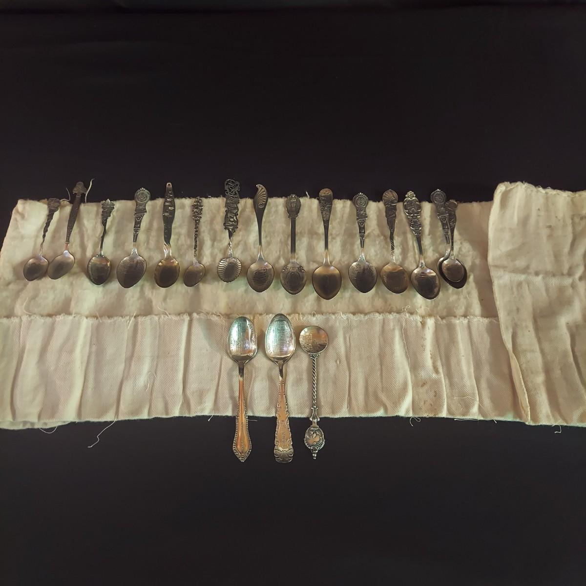 Lot includes 15 collectible souvenir spoons from various travels that are marked sterling silver. Also includes three spoons that are not marked sterling with an anti tarnish wrap for storage. Please see photos for details. Shipping available
