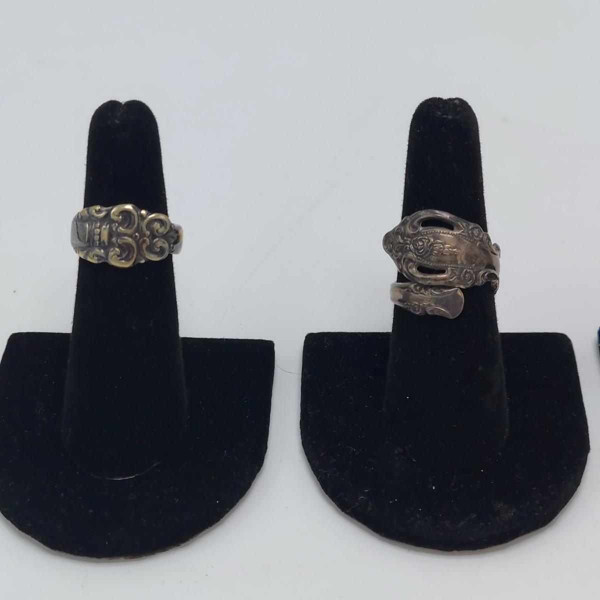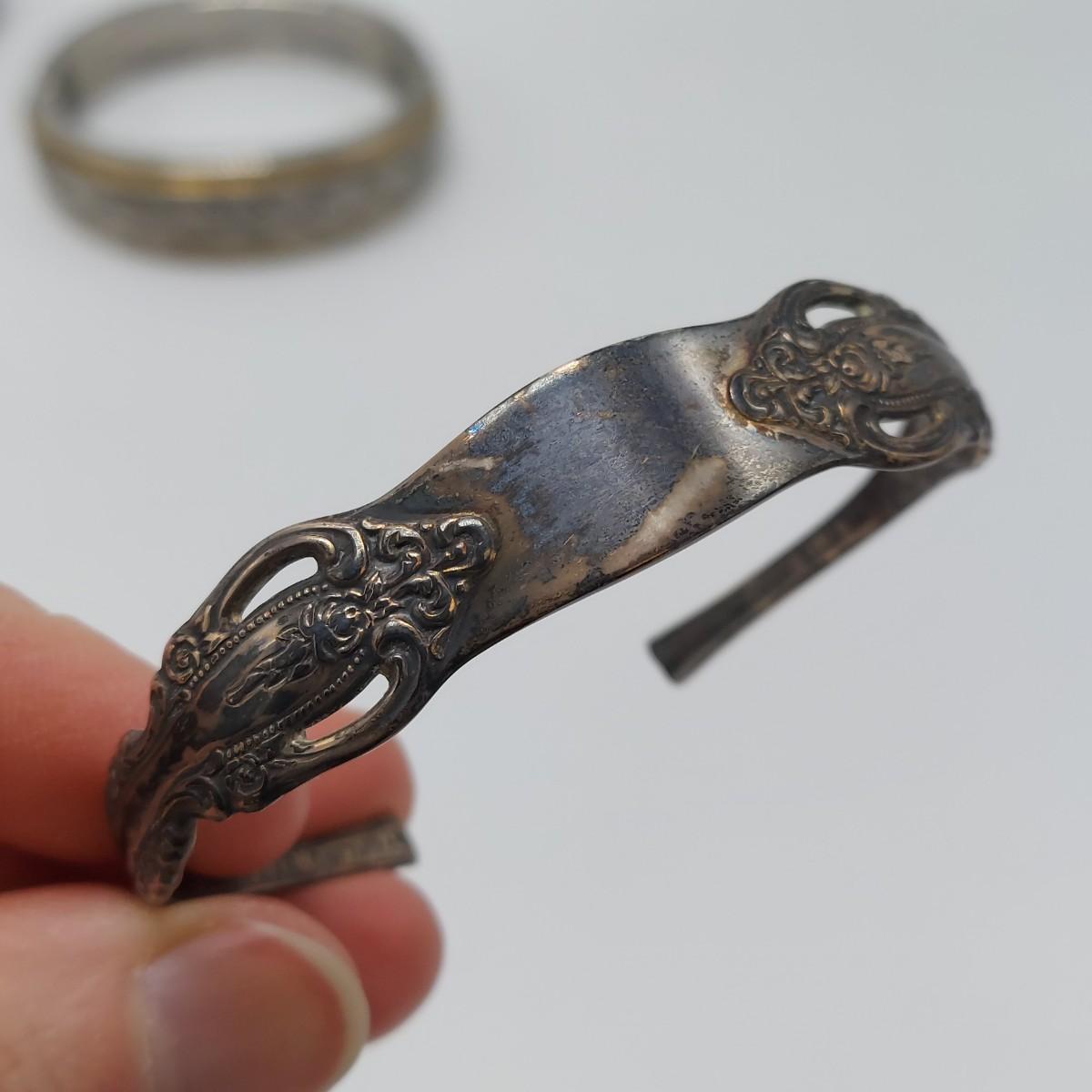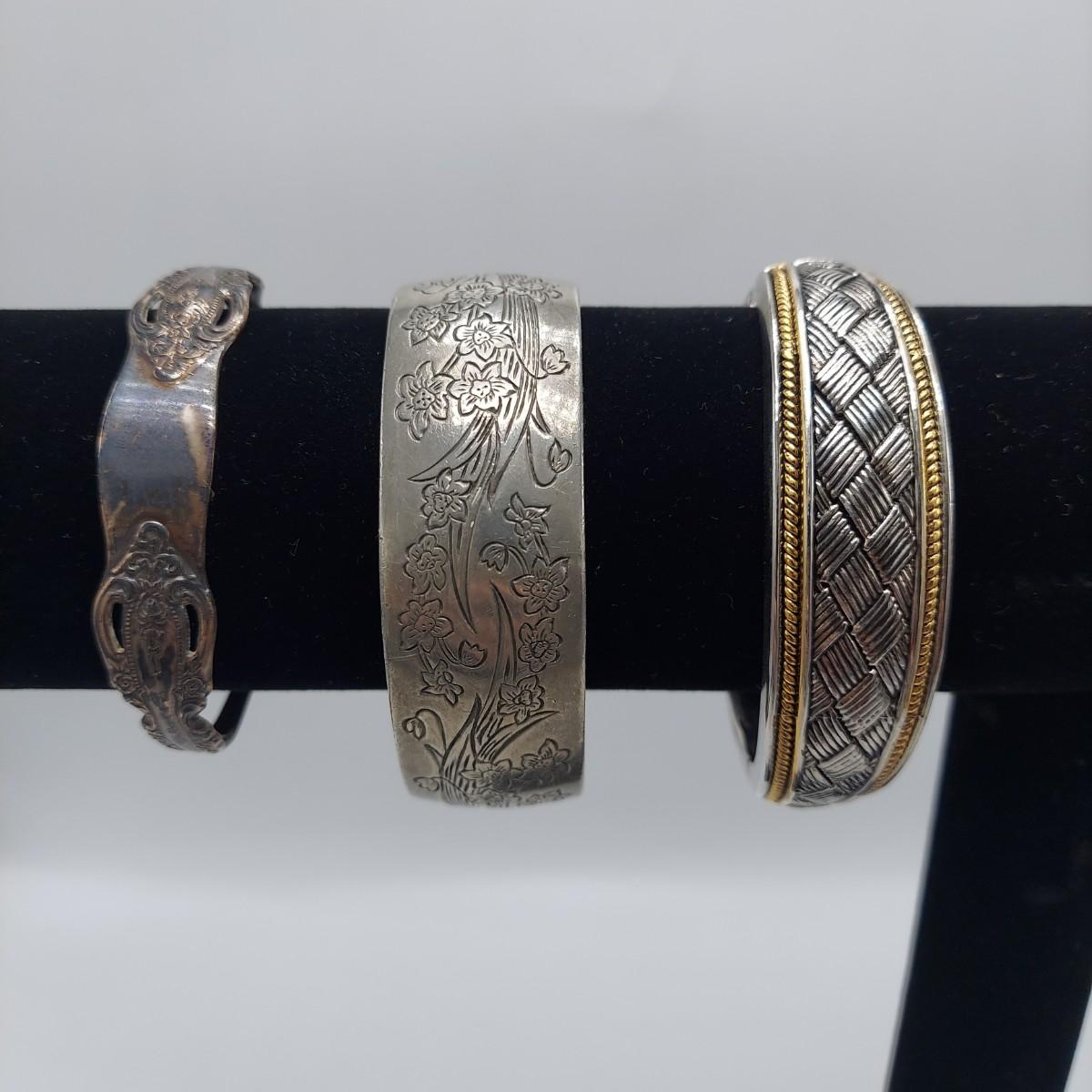 Seven cuff or bangle style bracelets with four rings. One bracelet is marked pewter and one is marked sterling. One cuff appears to be a brass and copper mix but is not marked. Three of the four rings are spoon rings. All appear to be sterling but not all are marked. The five items believed to be sterling are photographed together at the end of the carousel. Please see photos for details. All sales are final. No returns or refunds. Please bid accordingly. Shipping available