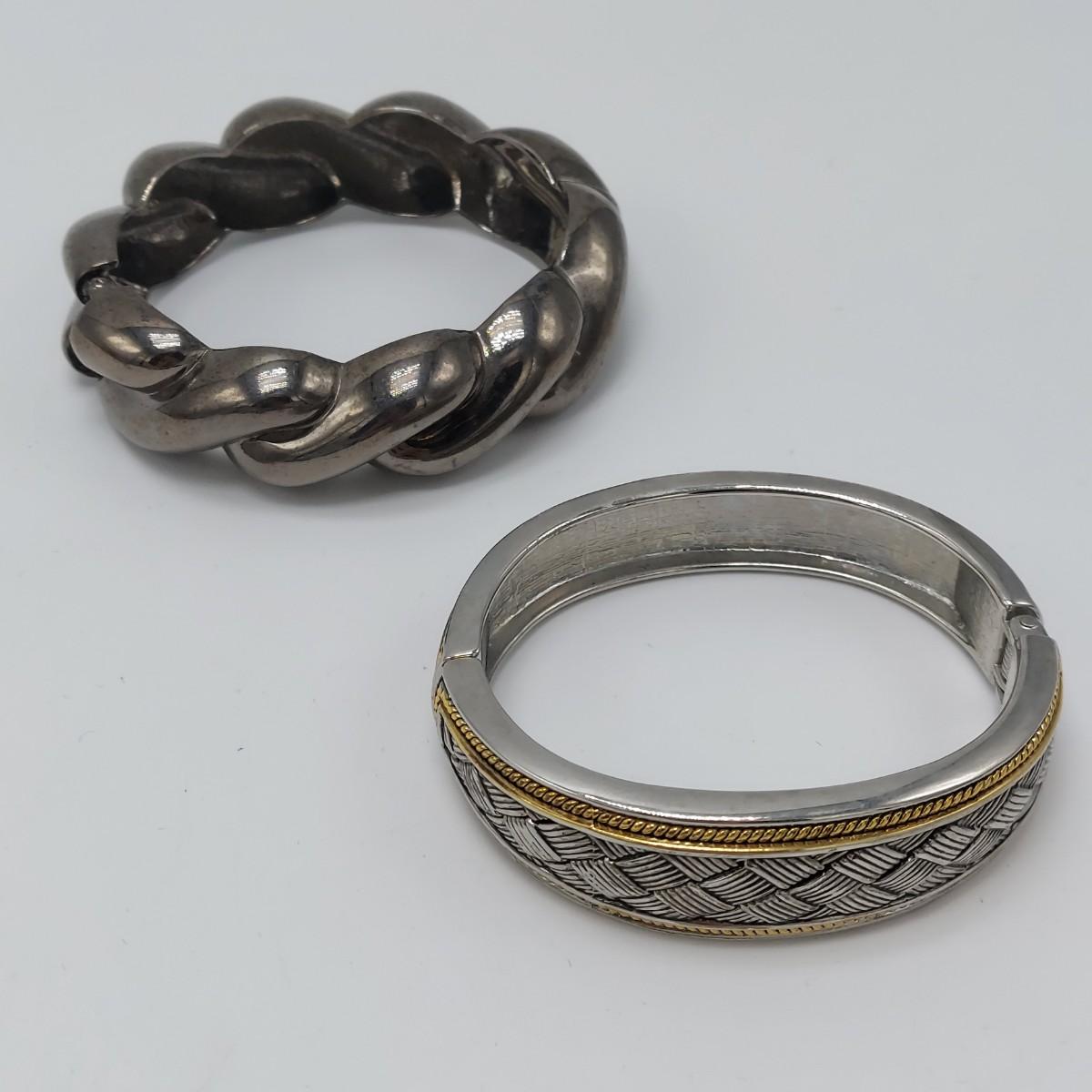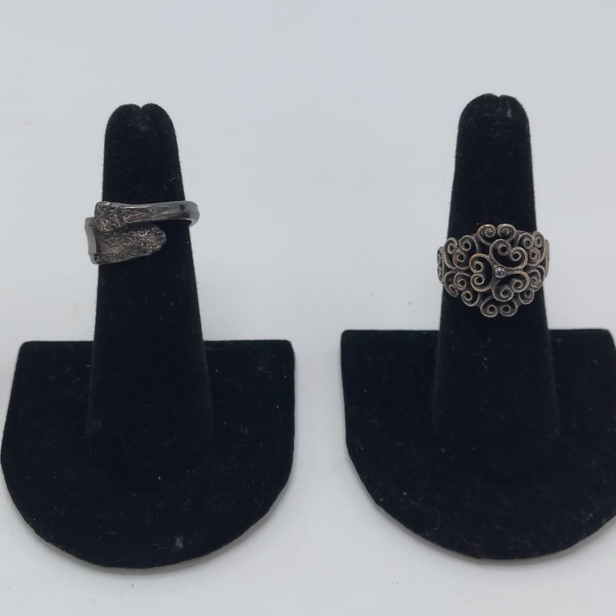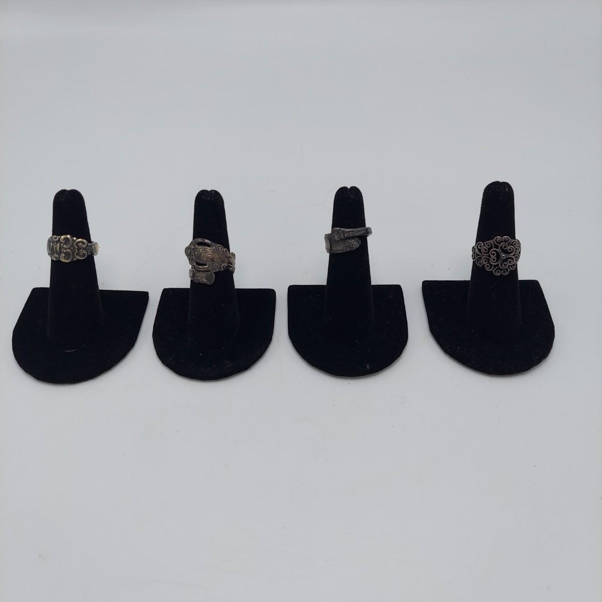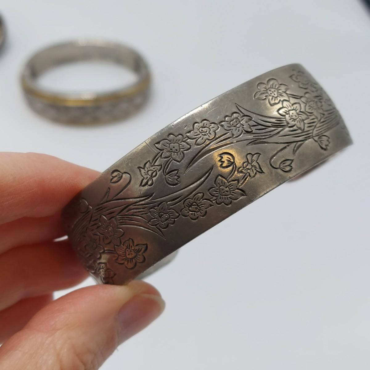 Seven cuff or bangle style bracelets with four rings. One bracelet is marked pewter and one is marked sterling. One cuff appears to be a brass and copper mix but is not marked. Three of the four rings are spoon rings. All appear to be sterling but not all are marked. The five items believed to be sterling are photographed together at the end of the carousel. Please see photos for details. All sales are final. No returns or refunds. Please bid accordingly. Shipping available