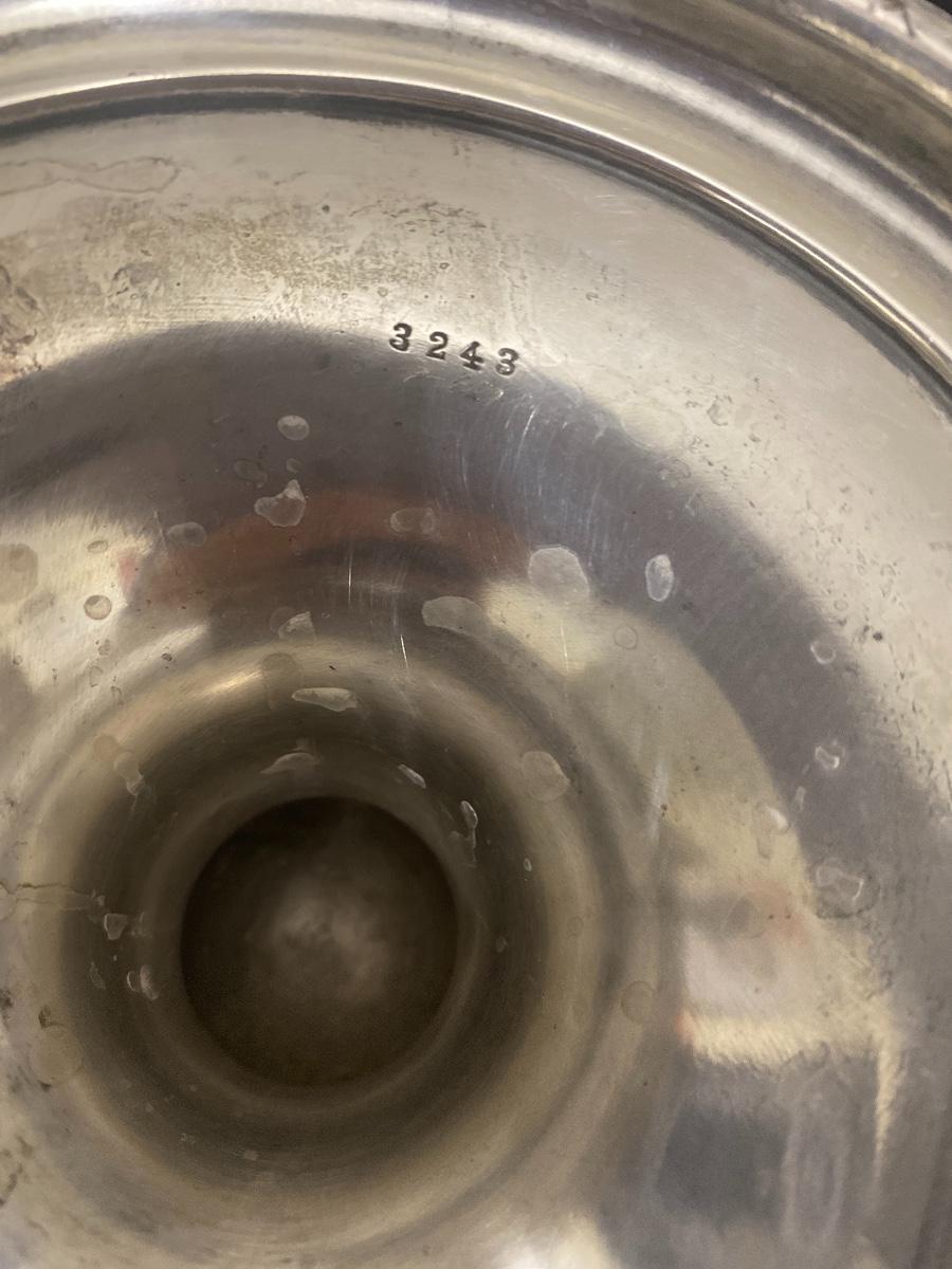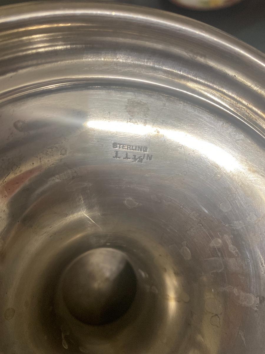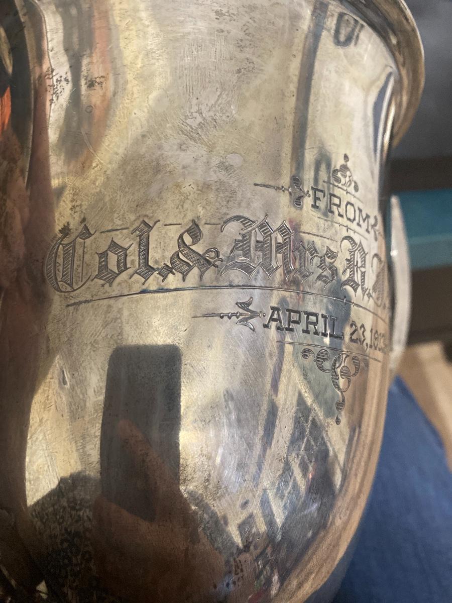 1008.9 grams, 32.44 ounces. 14”high. One side of the cup is monogrammed. Another side of the cup is in scribed From Col. & Mrs. N J Lowry April 23, 1913. The cup is stamped underneath STERLING 11 1/2 In 3243. There are a few dents to this cup. See the photos. As is.