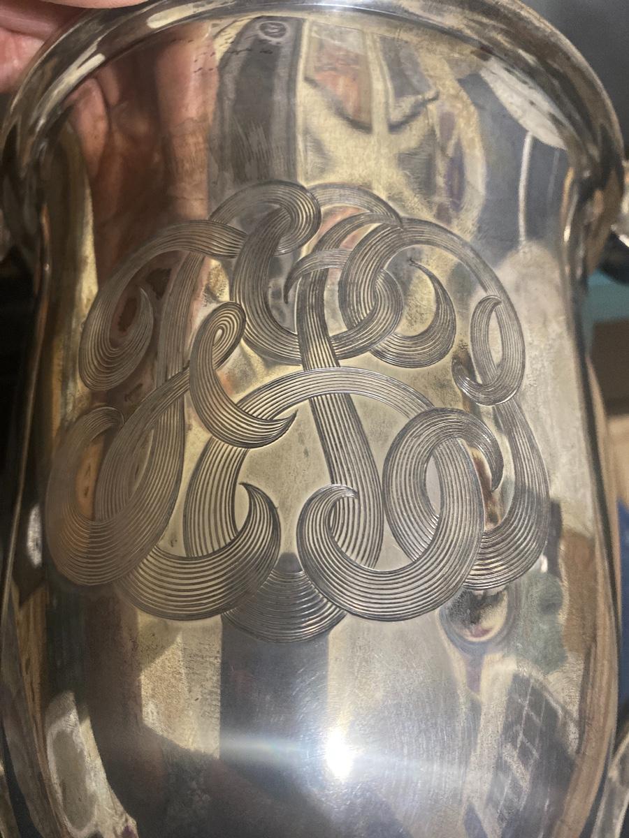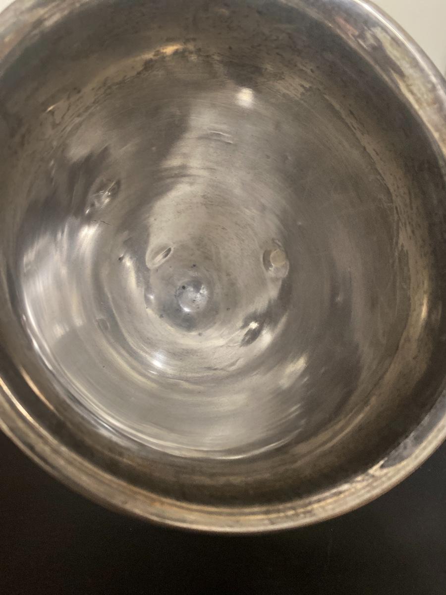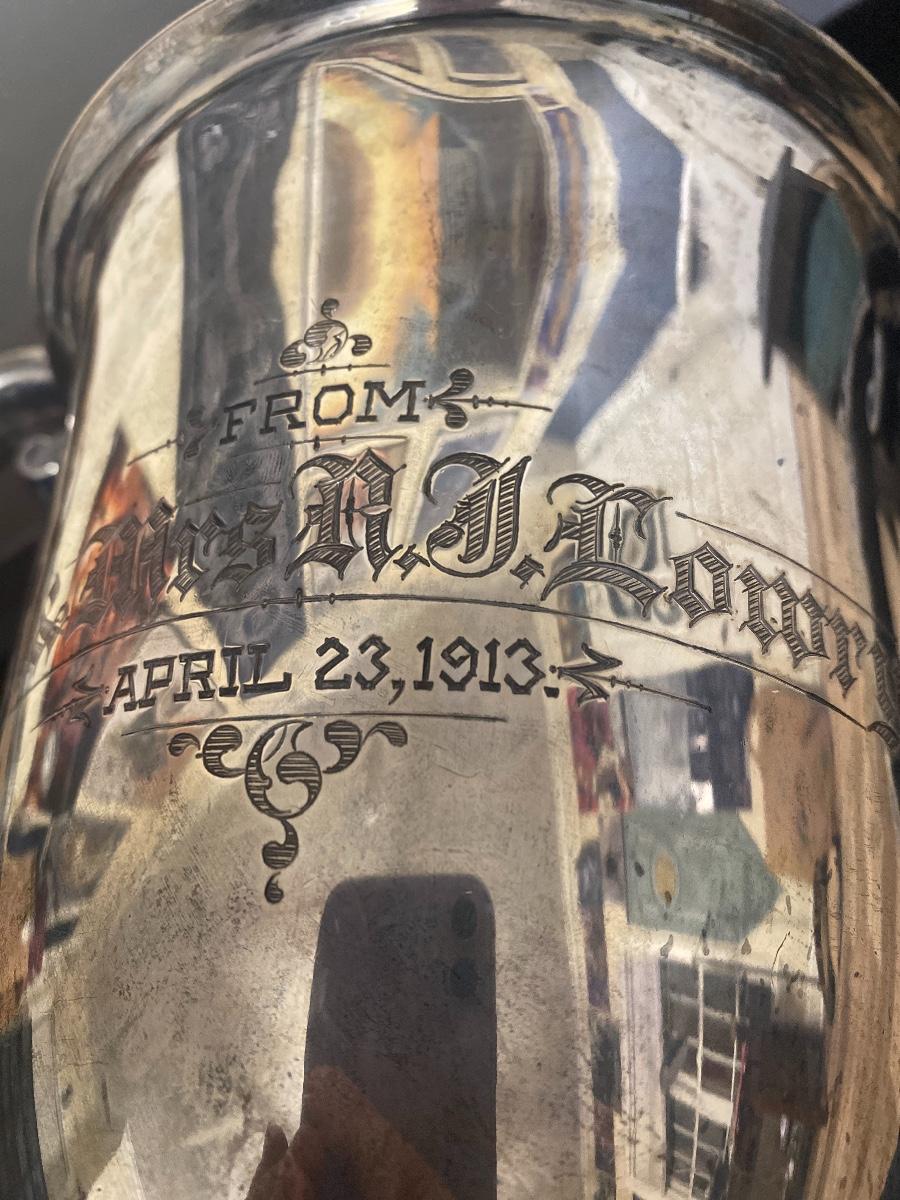 1008.9 grams, 32.44 ounces. 14”high. One side of the cup is monogrammed. Another side of the cup is in scribed From Col. & Mrs. N J Lowry April 23, 1913. The cup is stamped underneath STERLING 11 1/2 In 3243. There are a few dents to this cup. See the photos. As is.