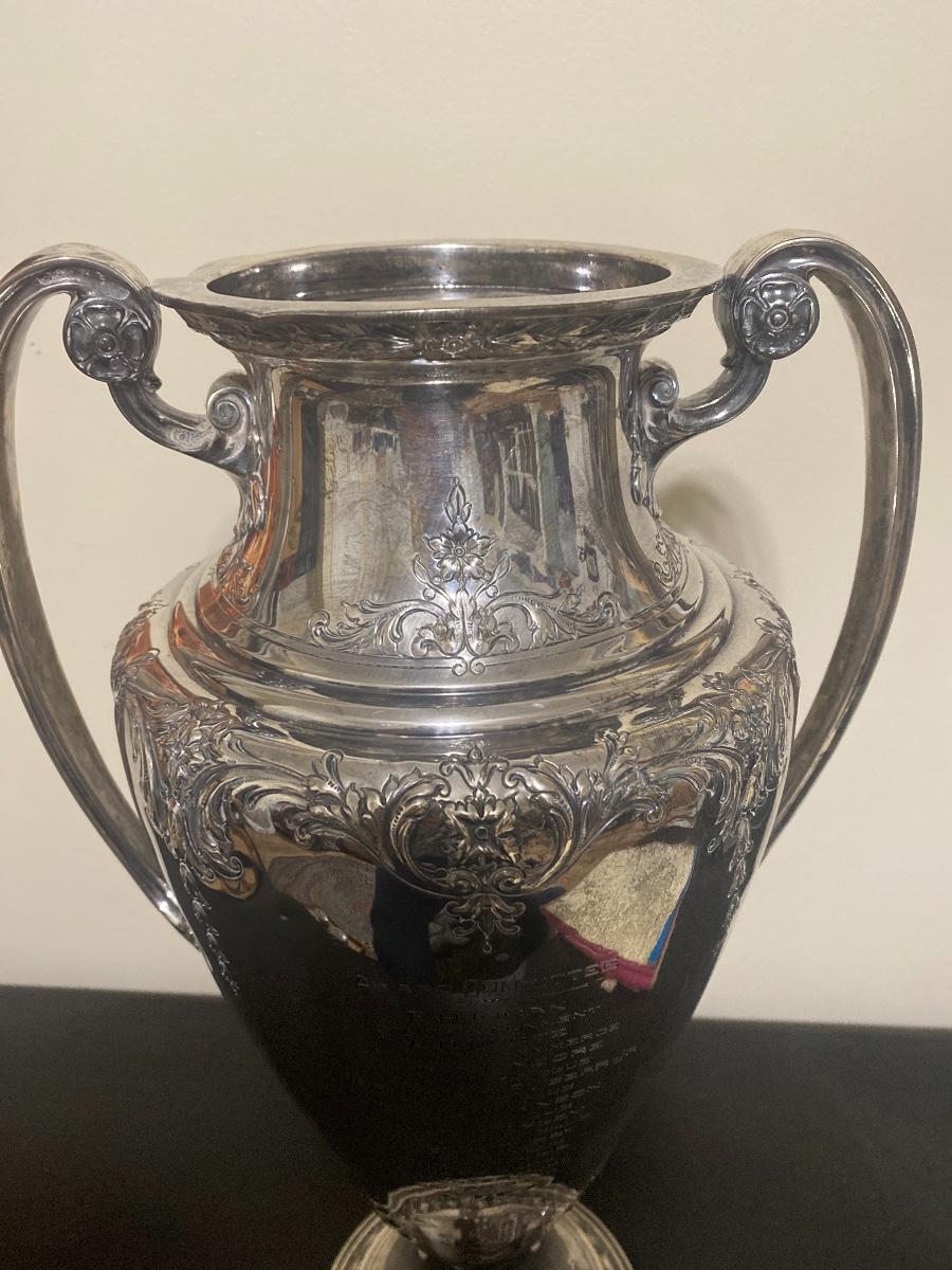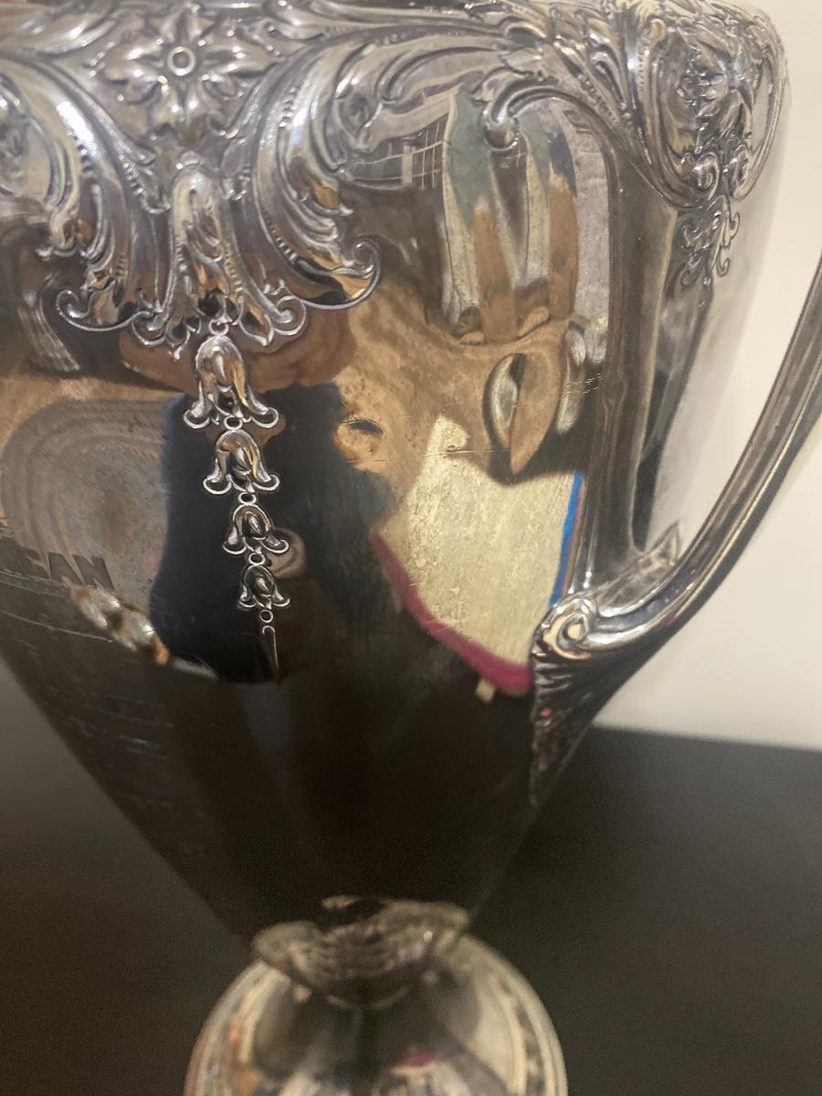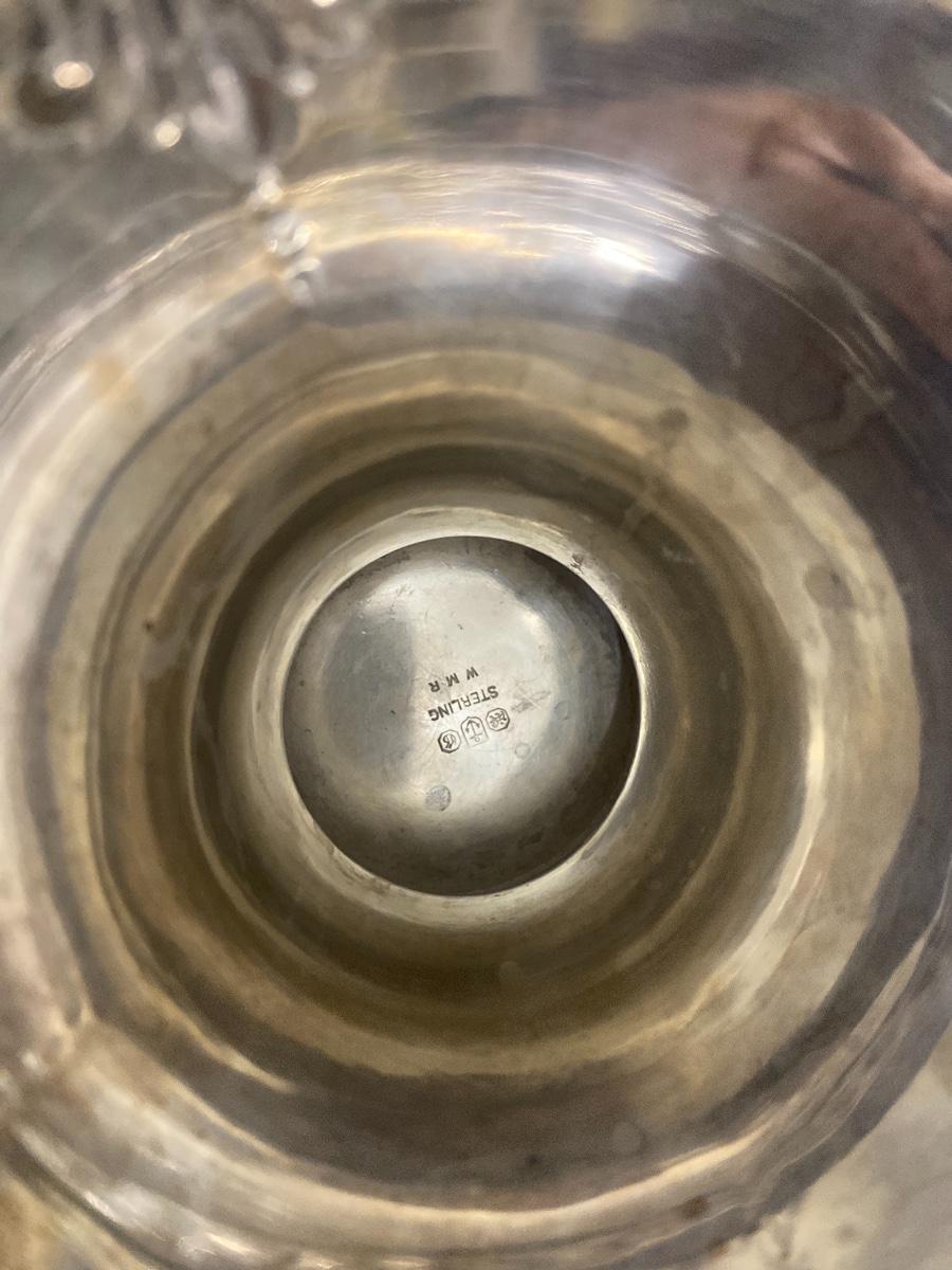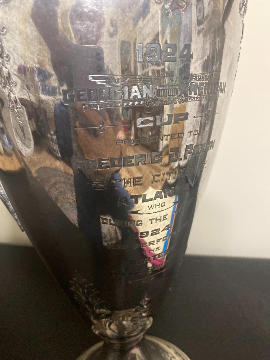 A sterling silver early 20th century large trophy cup. One side is engraved saying “1924 Georgian Daily Sunday American cup presented to Frederick Paxon the citizen of Atlanta who during the year 1924 has performed the greatest public service”. The other side of the cup is in graved award committee and it lists the names of the people on the award committee. The cup is stamped on the bottom STERLING WMR. Also there are three hallmarks including a lion, anchor and G on the bottom of the cup..There are a few small dents to the sterling silver. See all photos. As is.