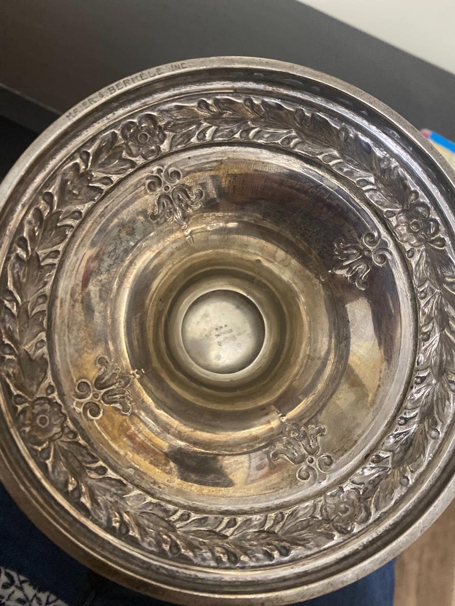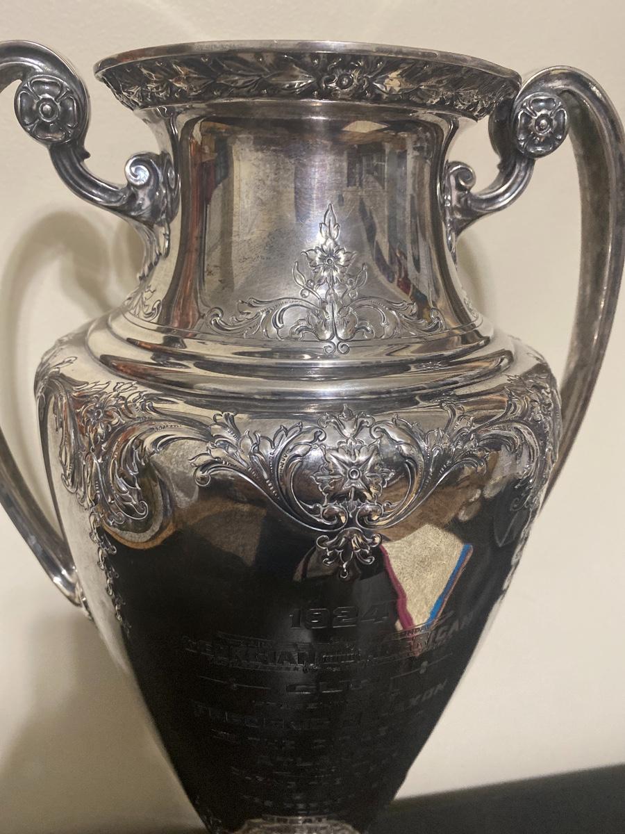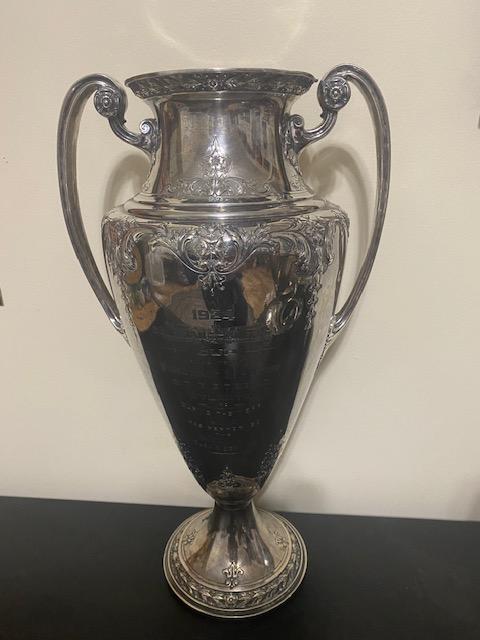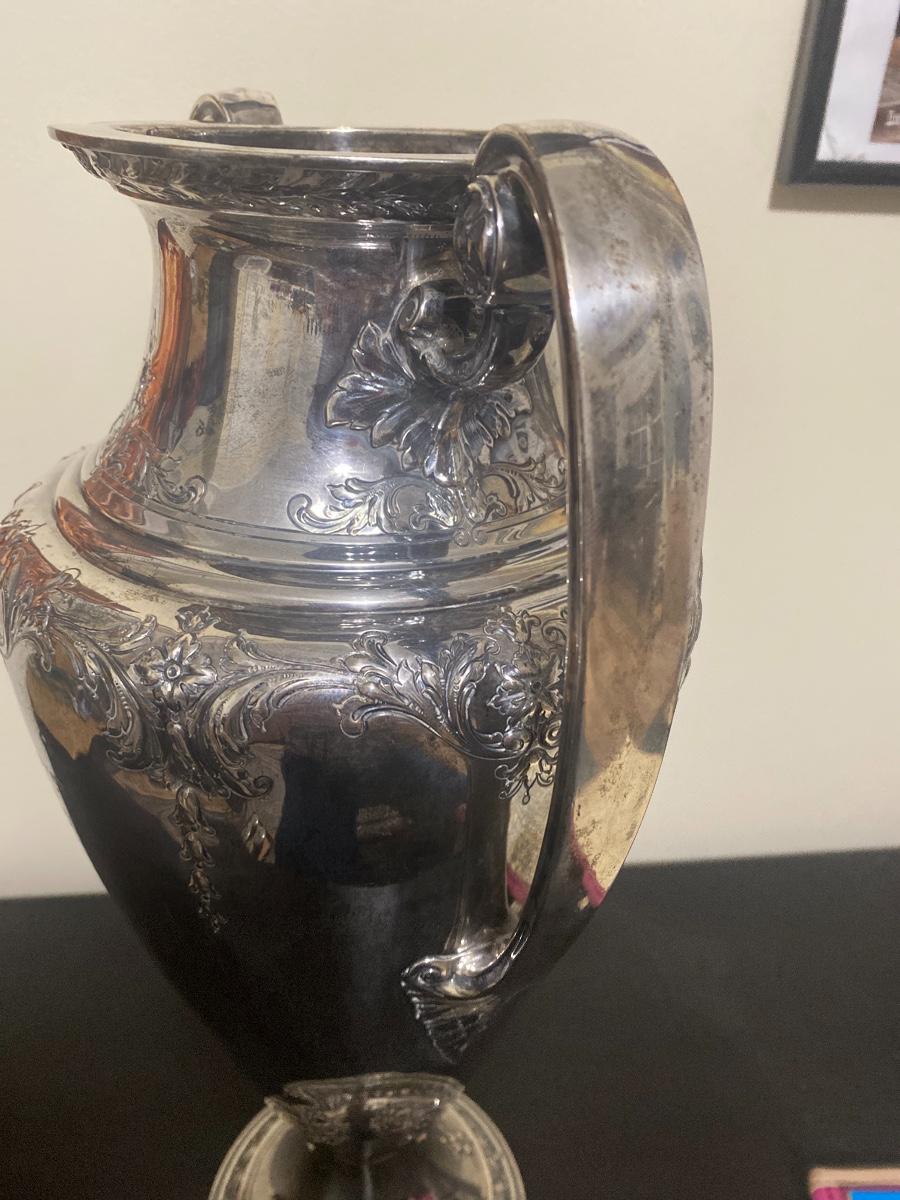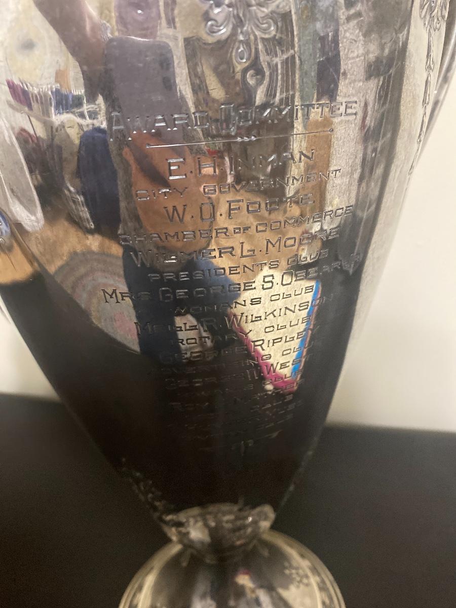 A sterling silver early 20th century large trophy cup. One side is engraved saying “1924 Georgian Daily Sunday American cup presented to Frederick Paxon the citizen of Atlanta who during the year 1924 has performed the greatest public service”. The other side of the cup is in graved award committee and it lists the names of the people on the award committee. The cup is stamped on the bottom STERLING WMR. Also there are three hallmarks including a lion, anchor and G on the bottom of the cup..There are a few small dents to the sterling silver. See all photos. As is.