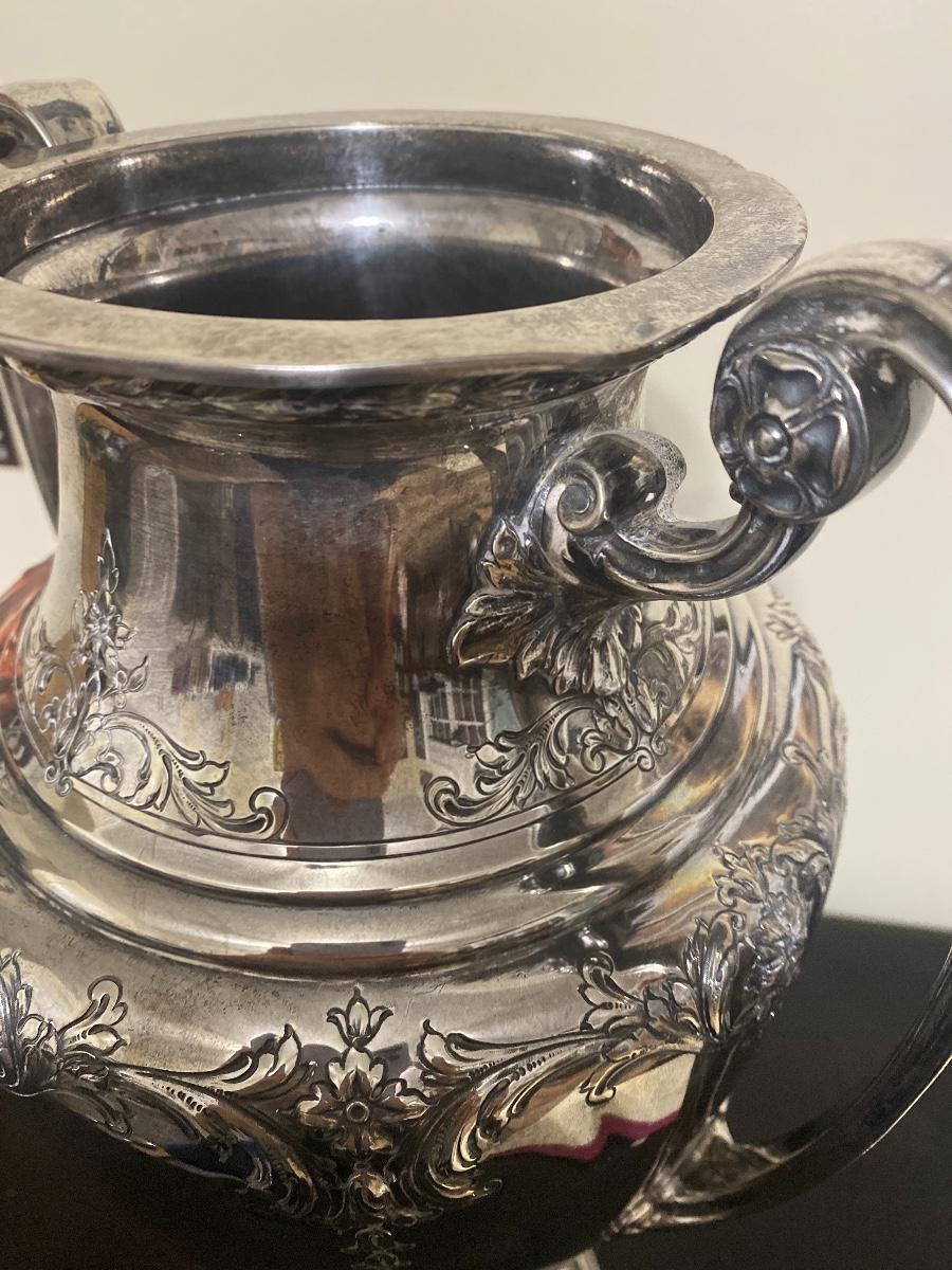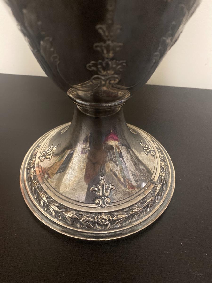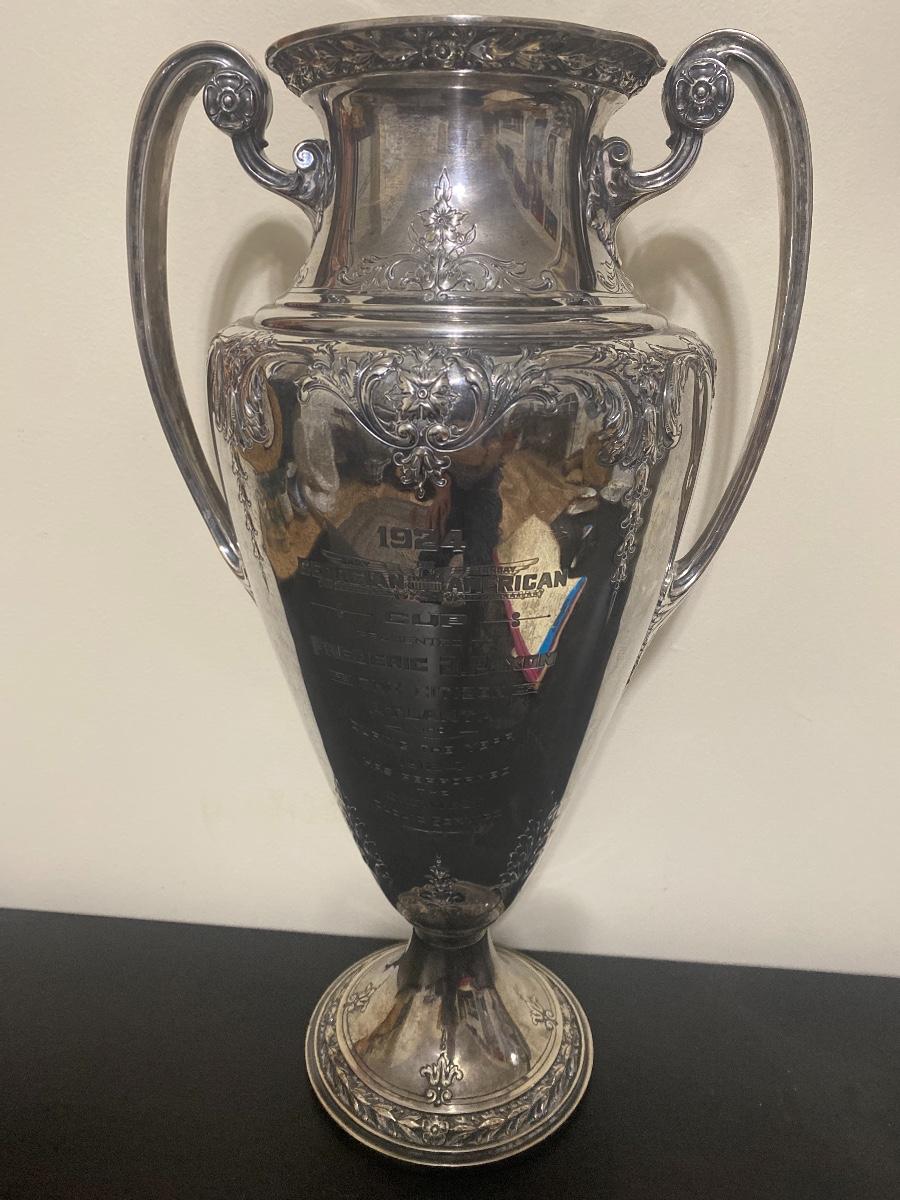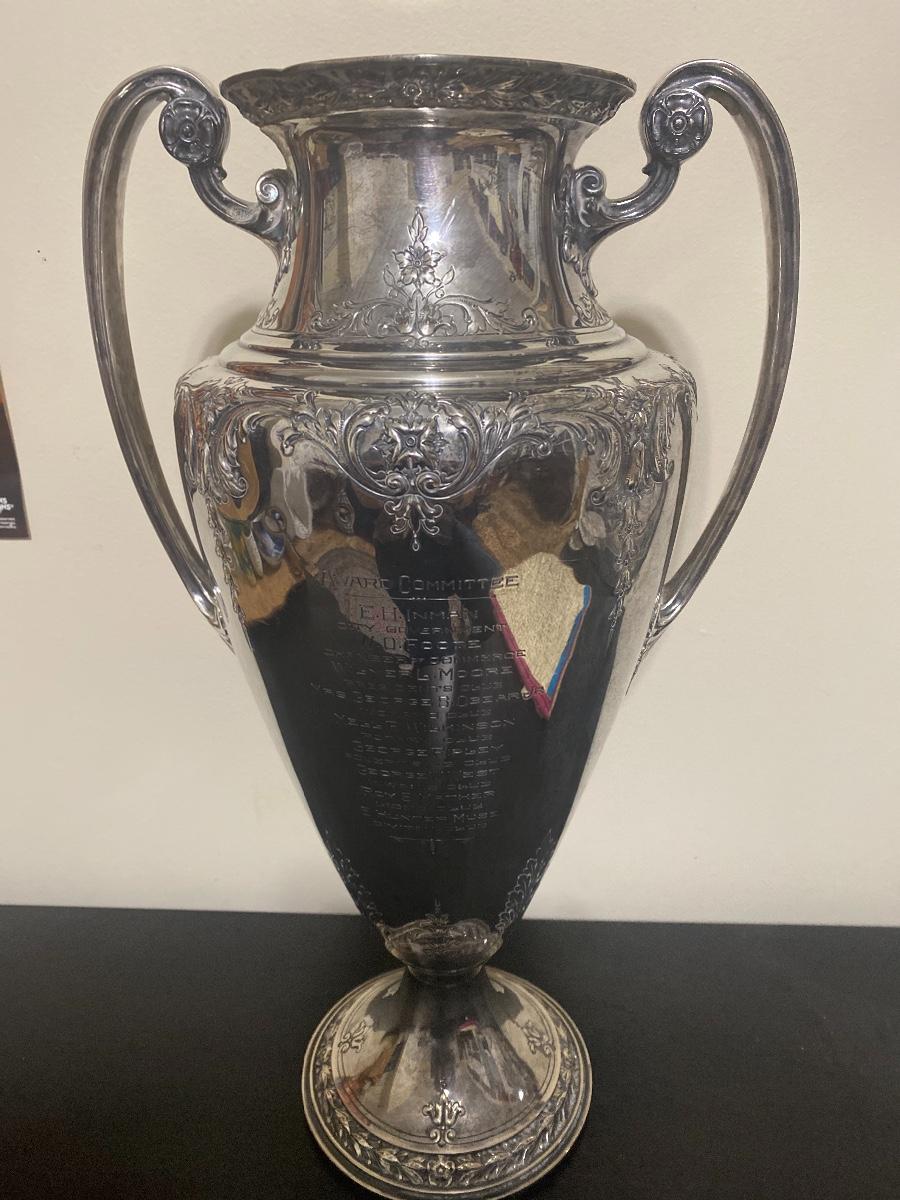 A sterling silver early 20th century large trophy cup. One side is engraved saying “1924 Georgian Daily Sunday American cup presented to Frederick Paxon the citizen of Atlanta who during the year 1924 has performed the greatest public service”. The other side of the cup is in graved award committee and it lists the names of the people on the award committee. The cup is stamped on the bottom STERLING WMR. Also there are three hallmarks including a lion, anchor and G on the bottom of the cup..There are a few small dents to the sterling silver. See all photos. As is.