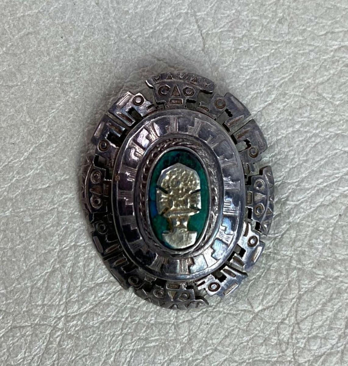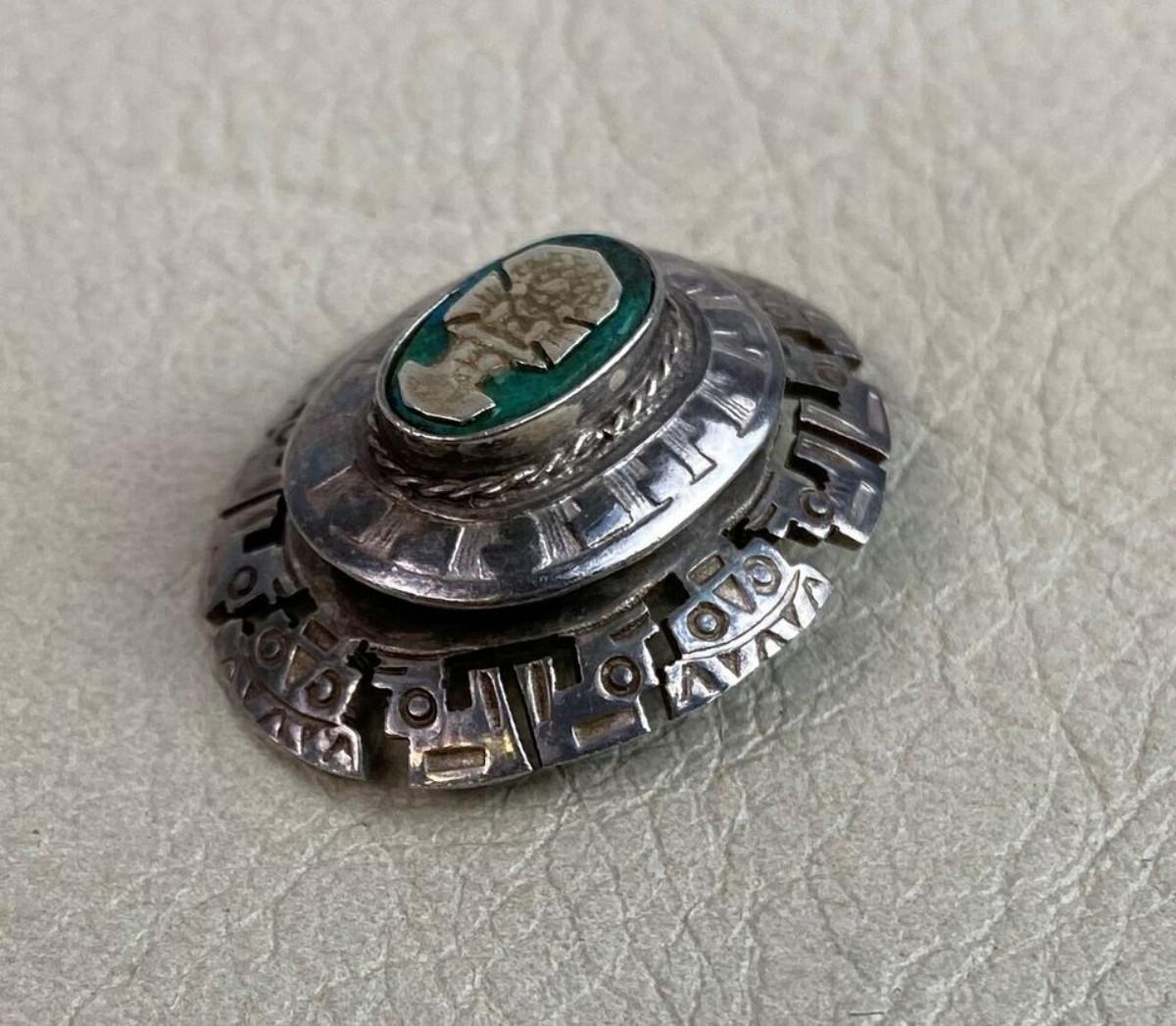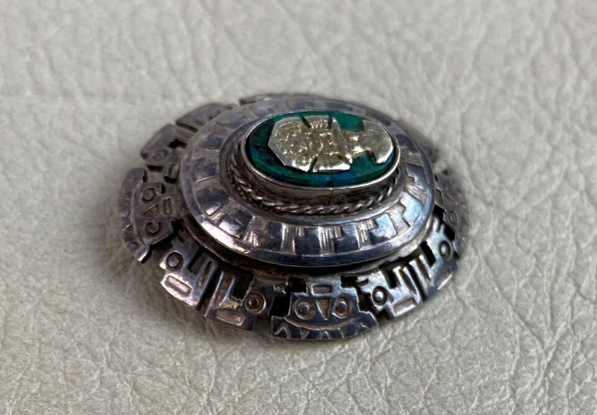 STERLING SILVER & TURQUOISE MESOAMERICAN STYLE PENDANT BROOCH