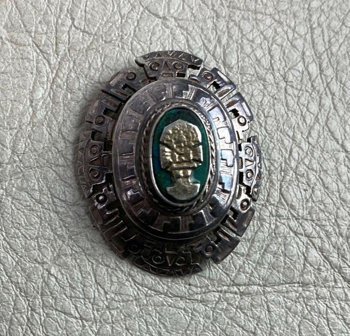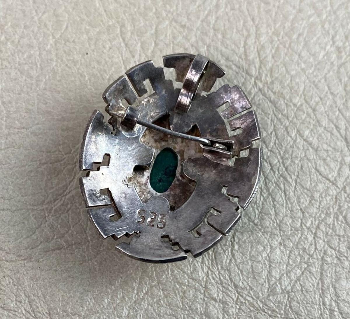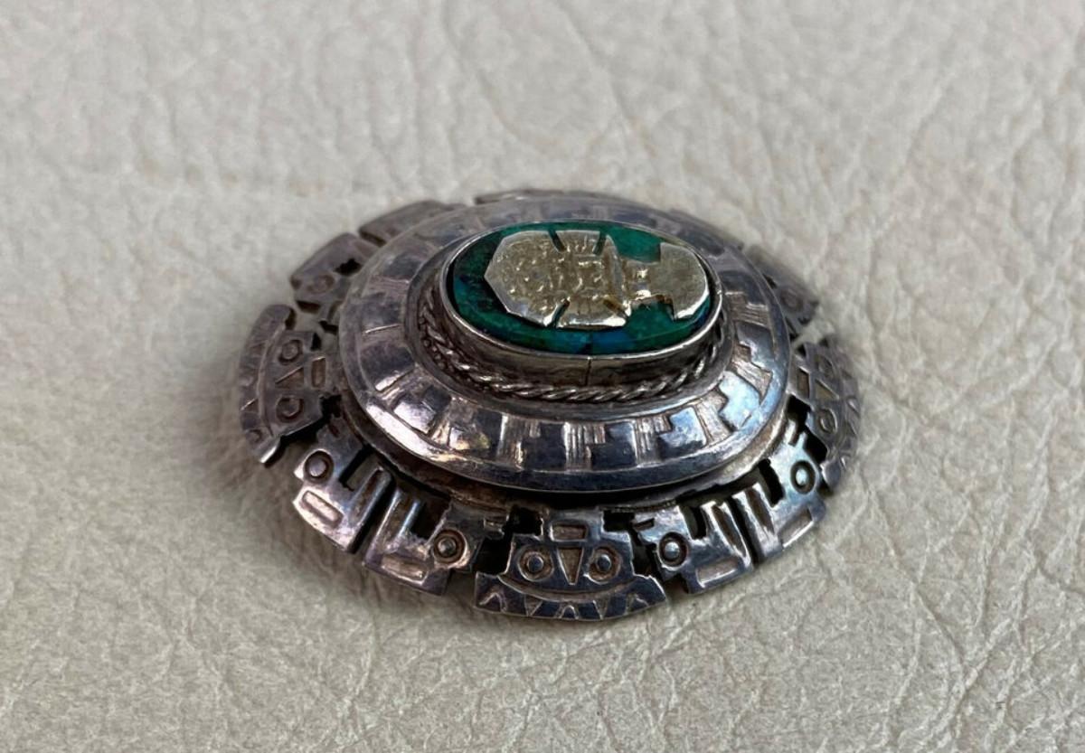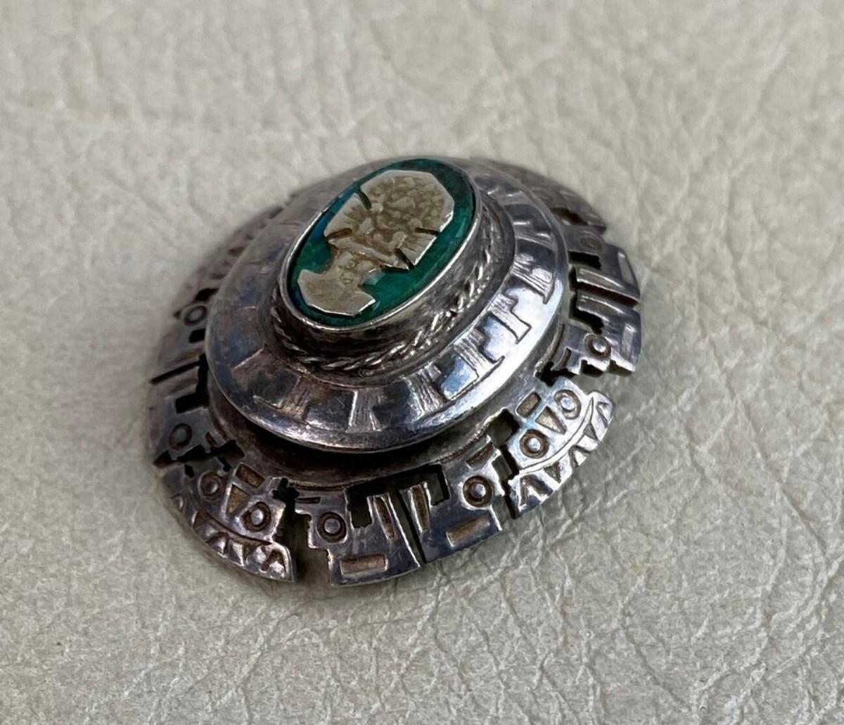 STERLING SILVER & TURQUOISE MESOAMERICAN STYLE PENDANT BROOCH
