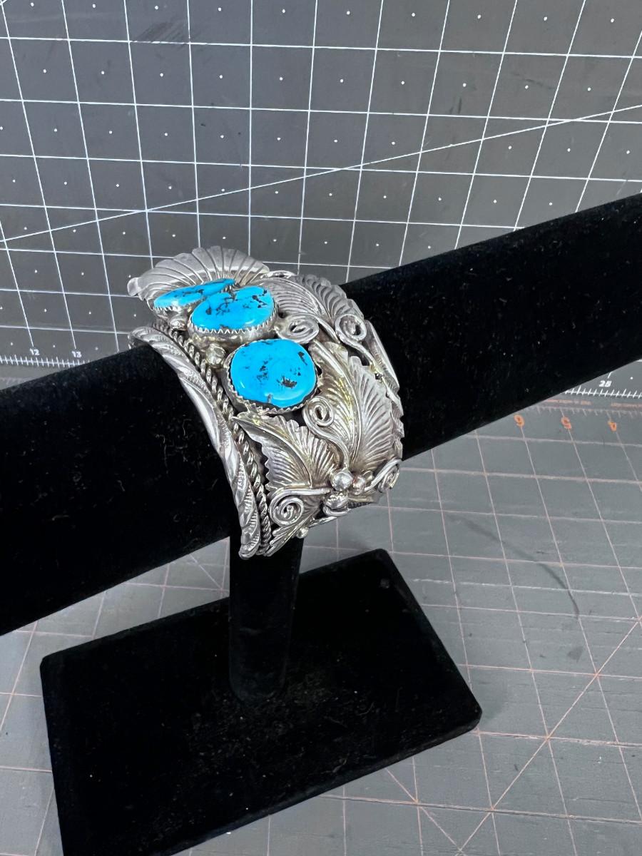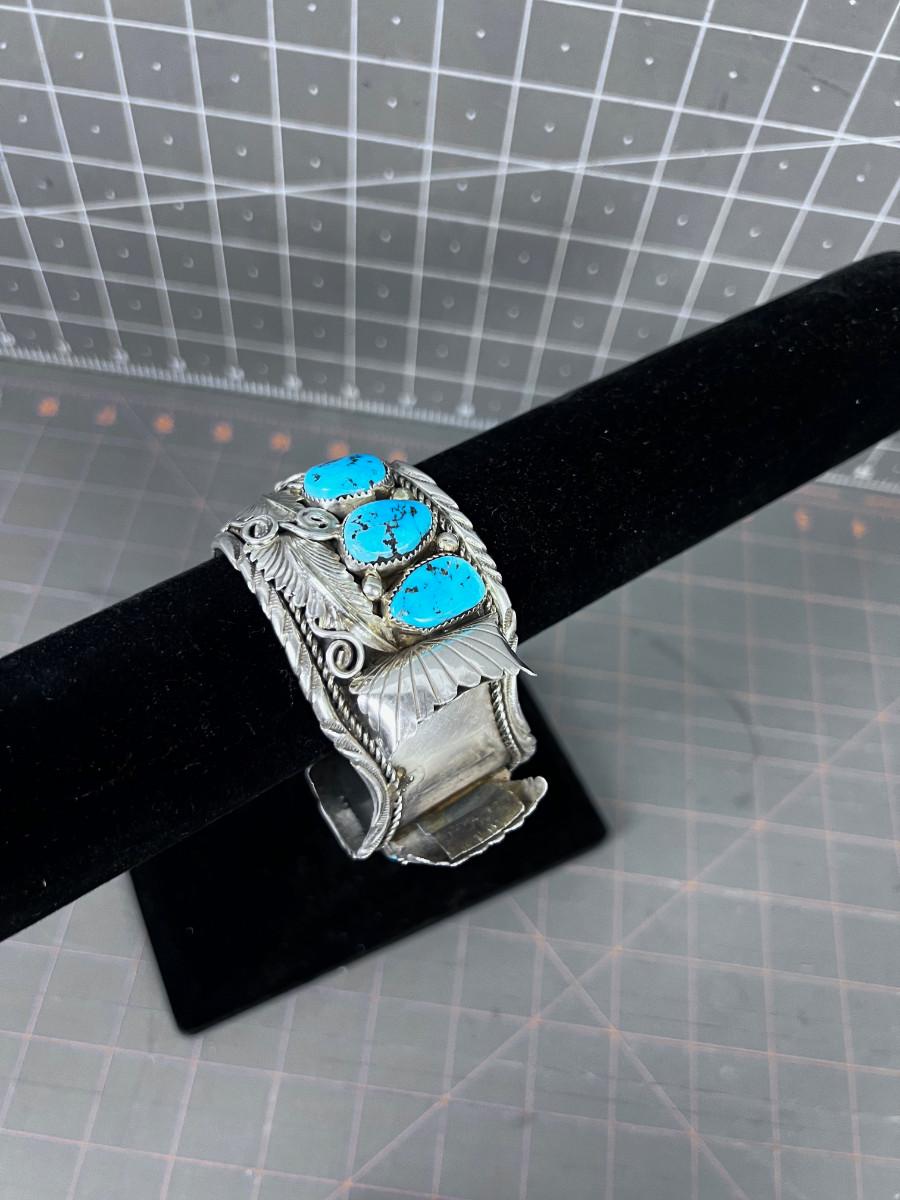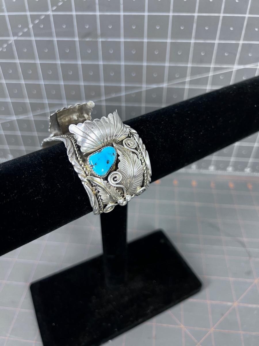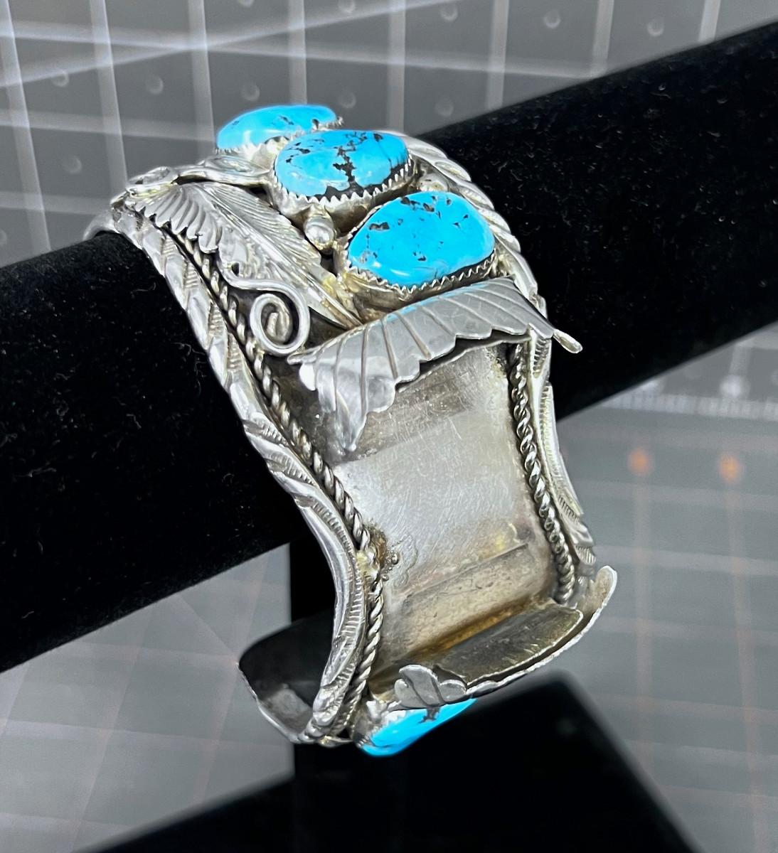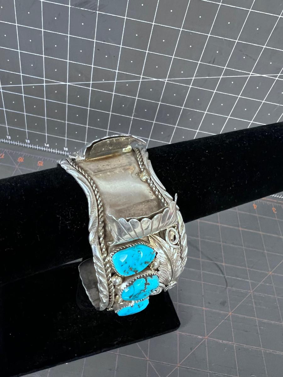 Sterling Silver & Turquoise Watch Cuff with Feather Scrolls, Old Pawn Navajo