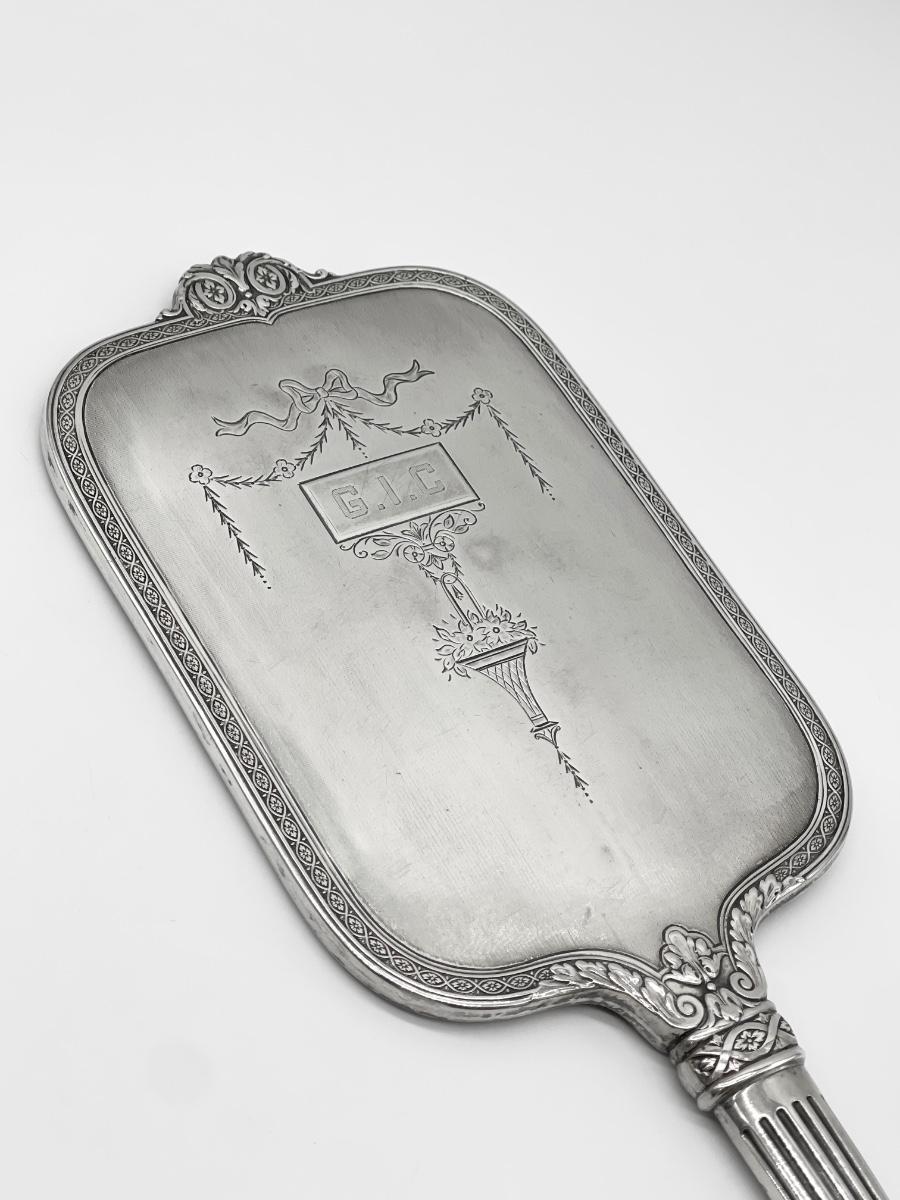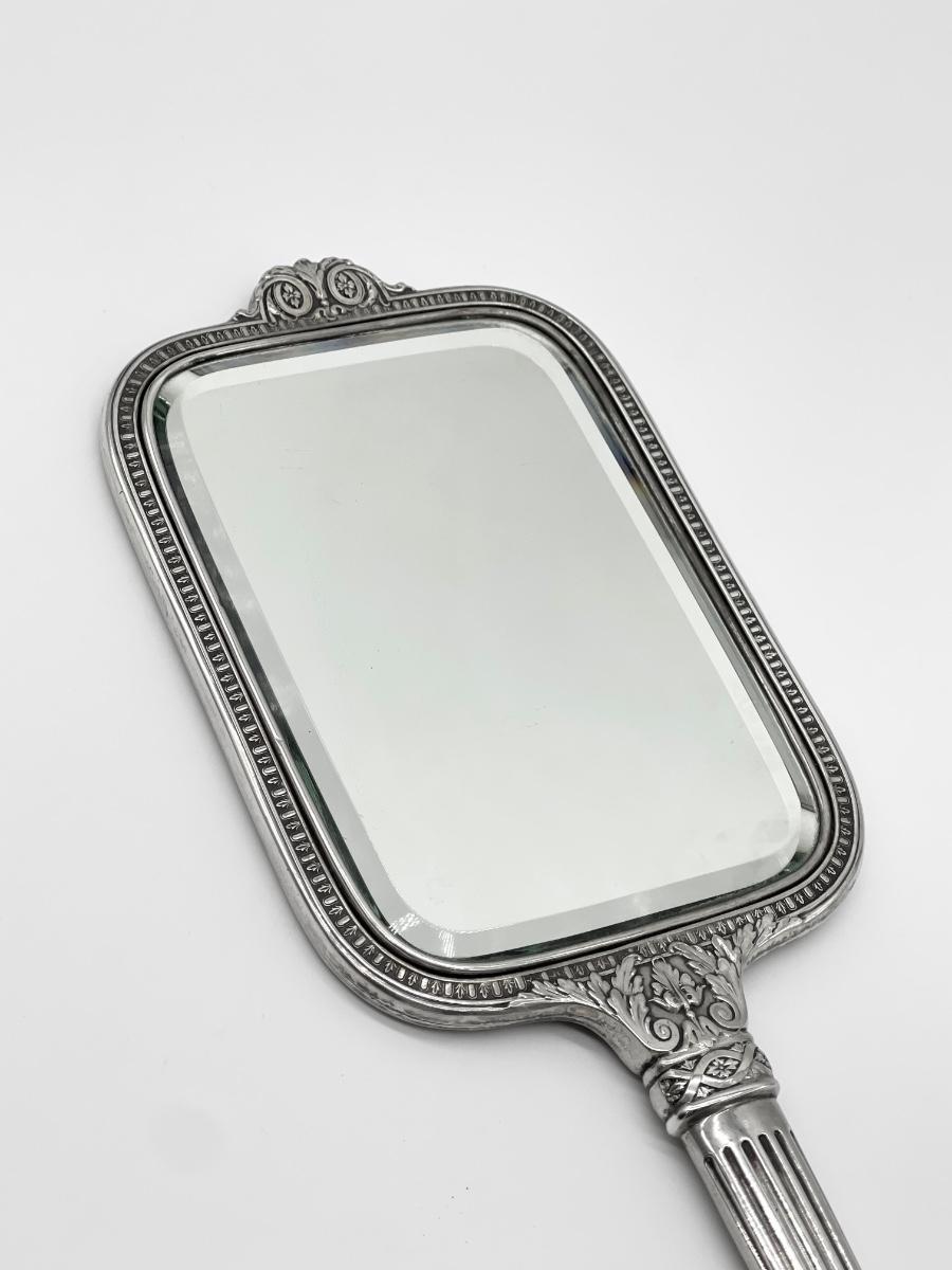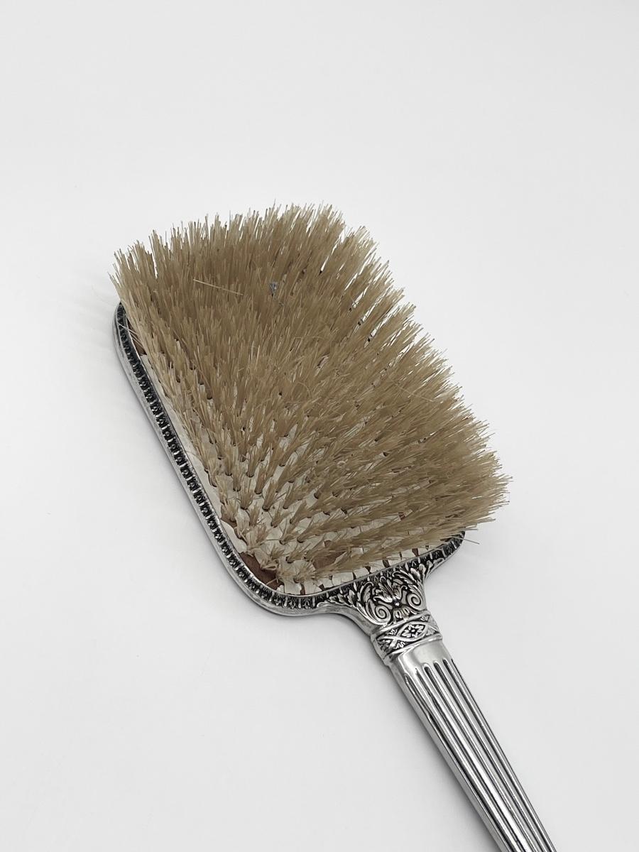 Mirror = 16” x 4.75” ~ Brush = 11” x 3” ~ Beveled Mirror is in excellent condition except for minor surface scratches from age ~ Some Bristles on brush fall out if handled roughly.