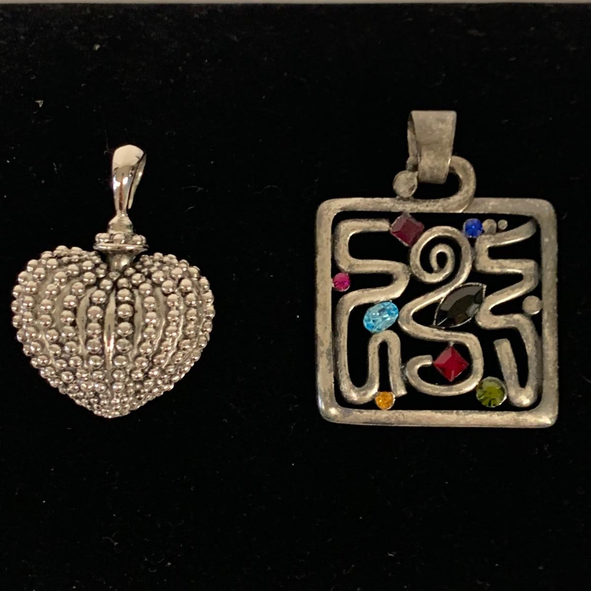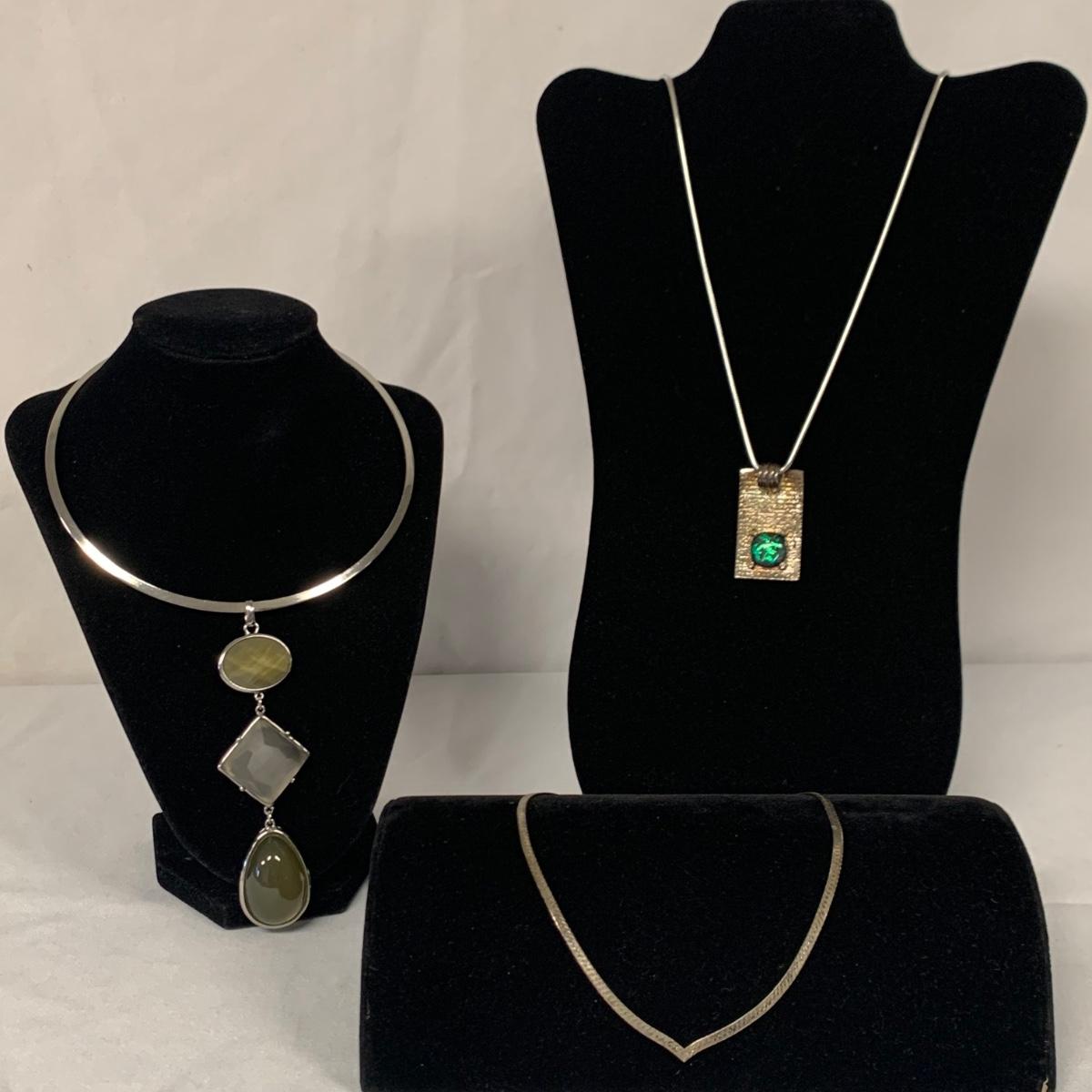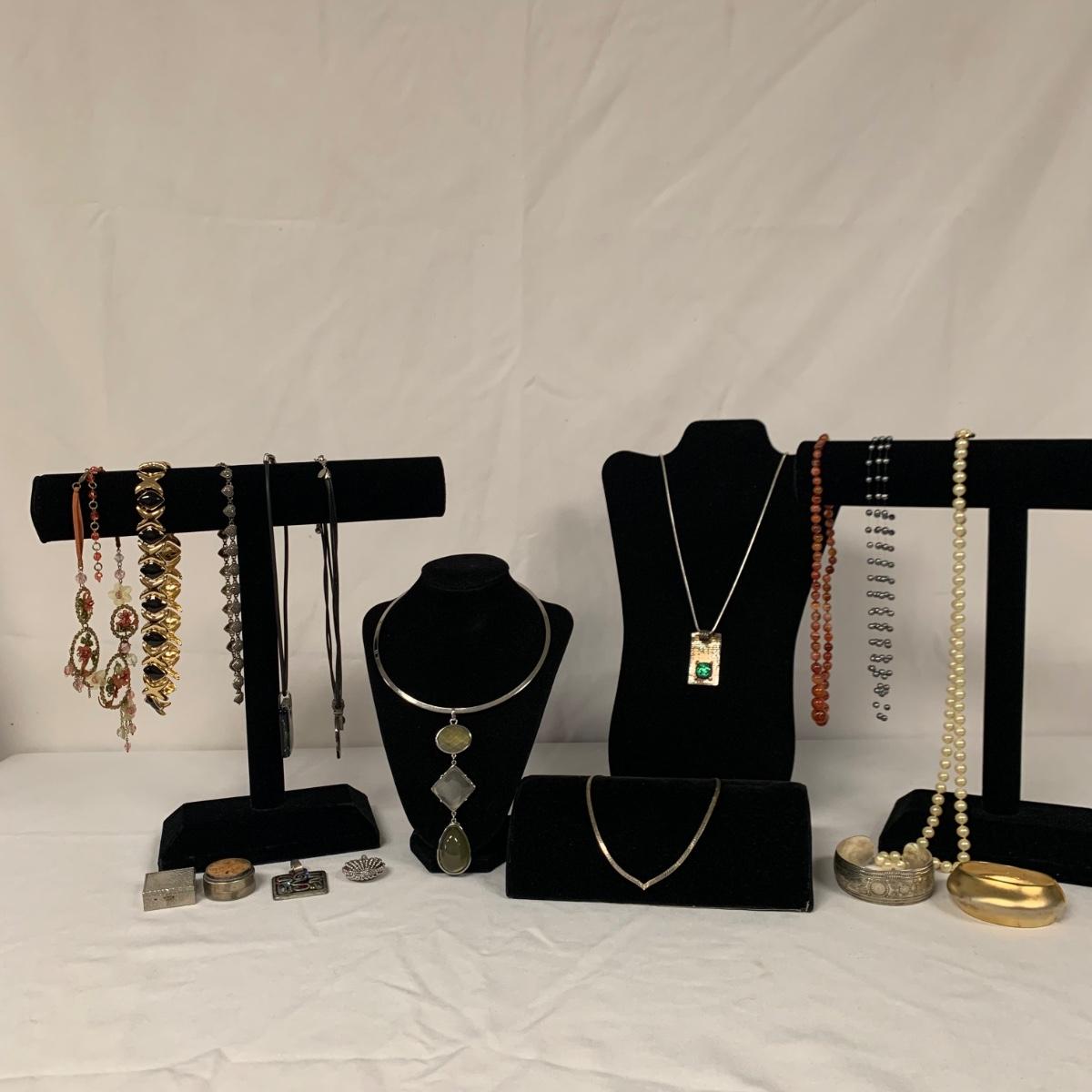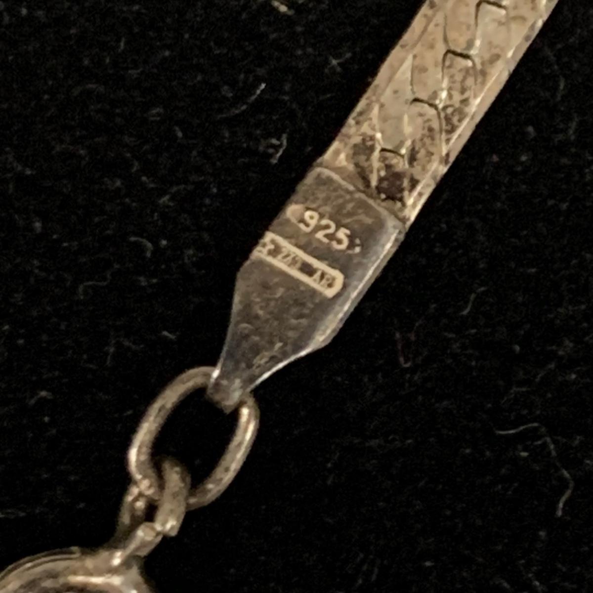 A lovely collection of necklaces, pendants, two cuff bracelets, and two small metal pill boxes. There are 11 necklaces included plus two pendants without chains. The V-point necklace chain is marked 925. It is a bit tarnished and needs to be polished. The longest necklace is the rounded silver chain that currently holds the silver pendant with the glass dragonfly motif. It is 30” long. The pearl-like necklace does not appear to have real pearls. Please see photos for markings.