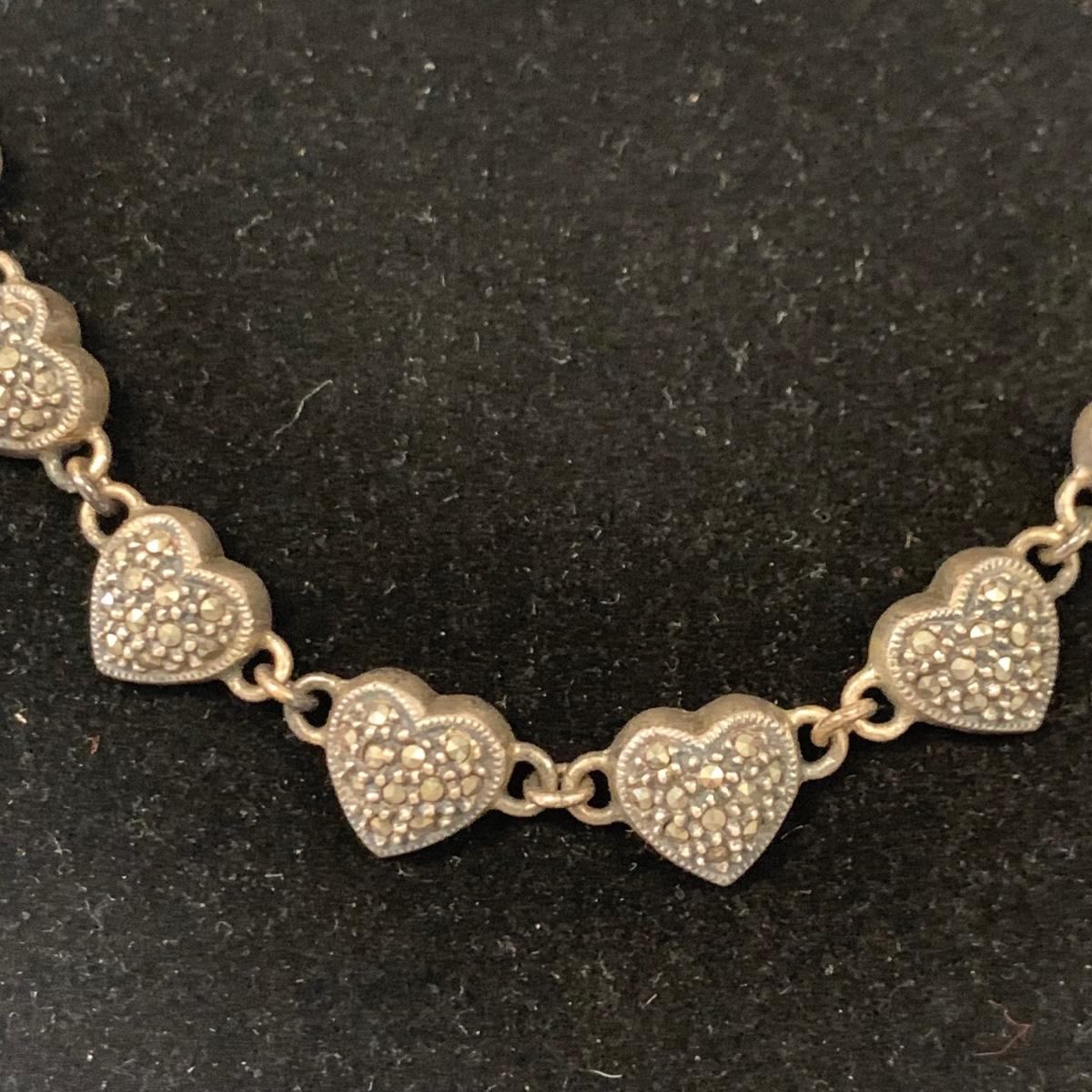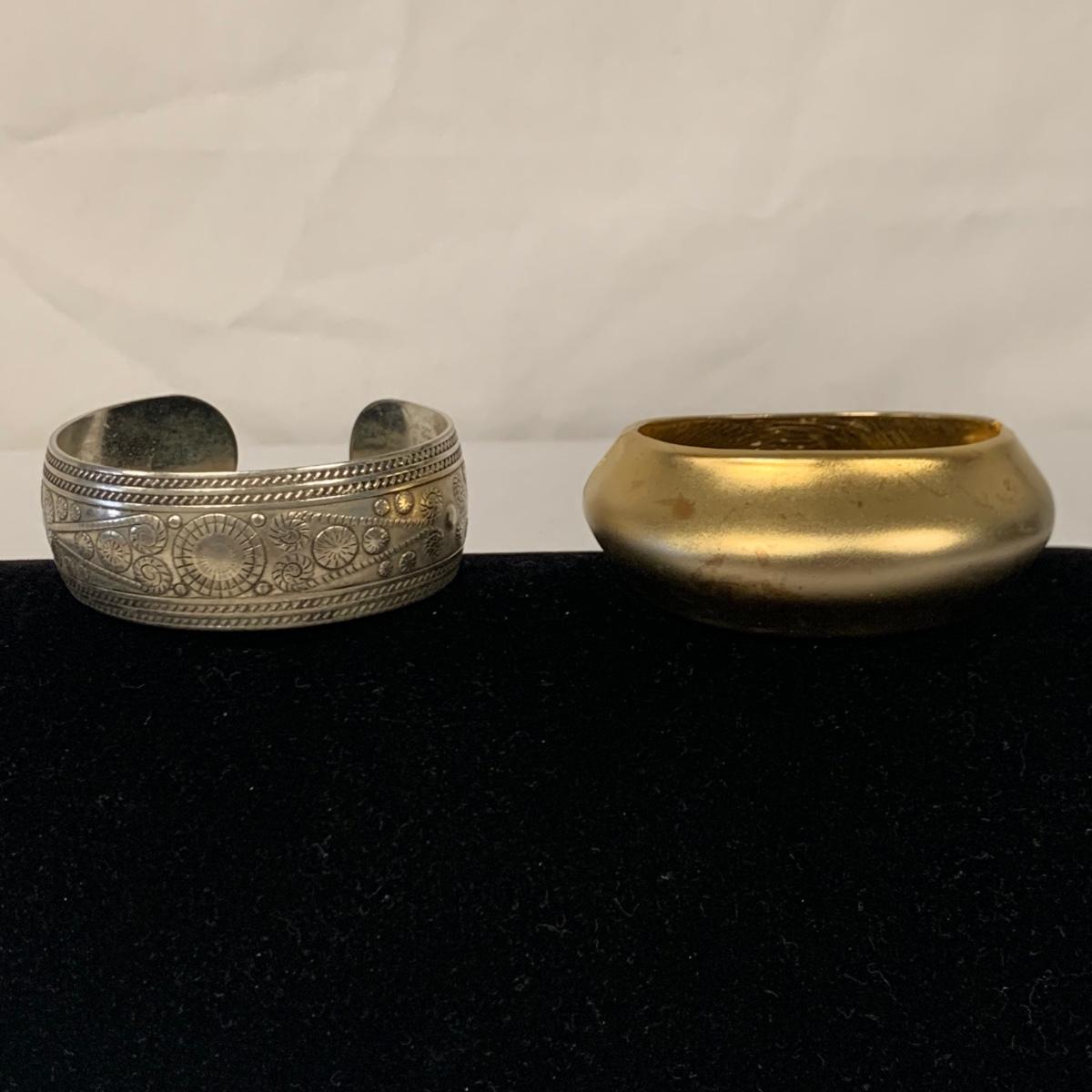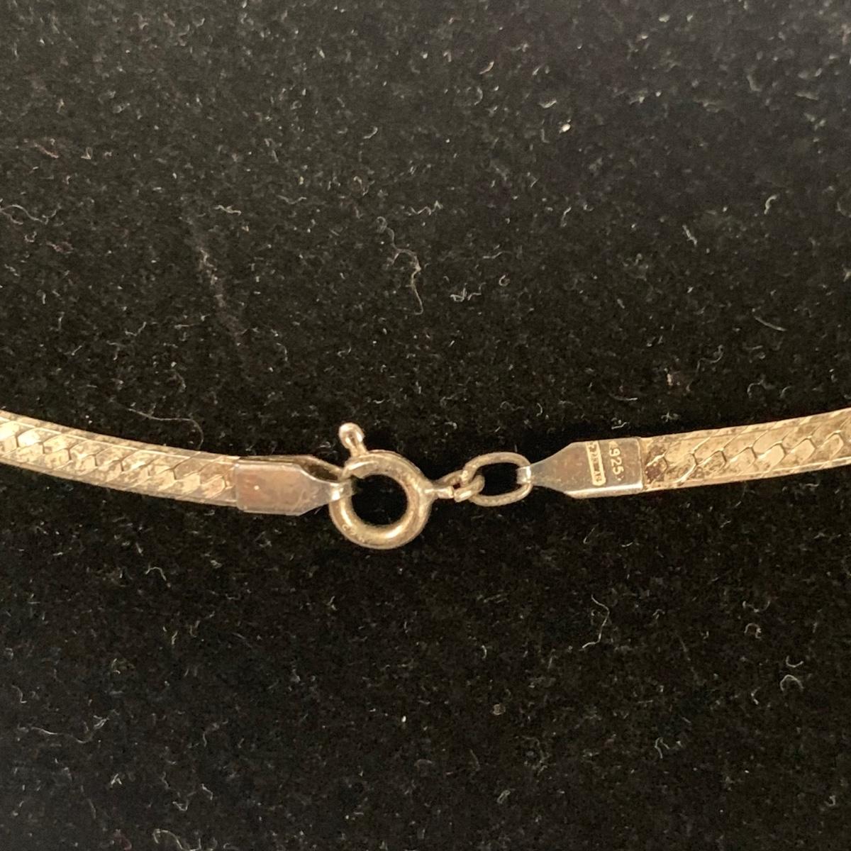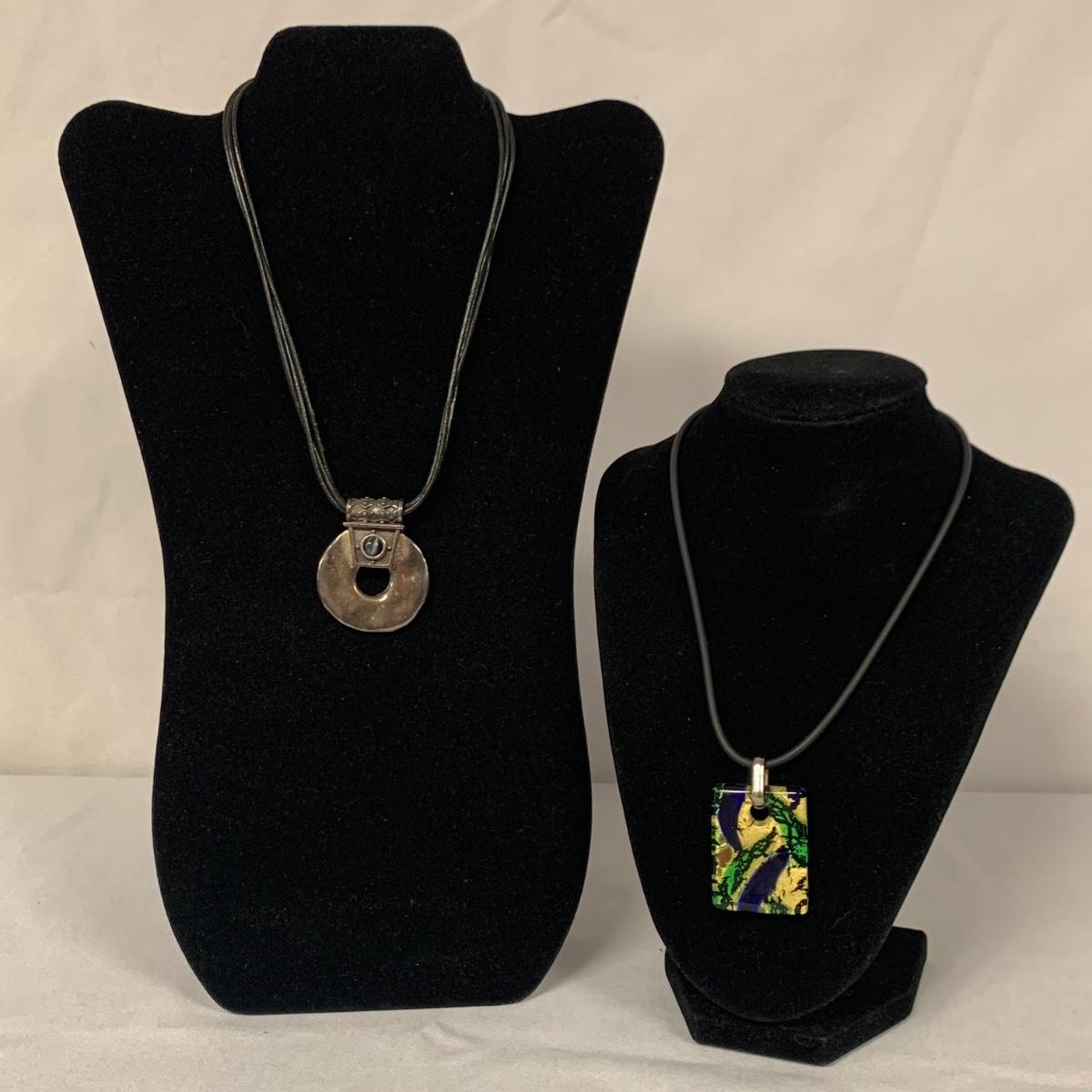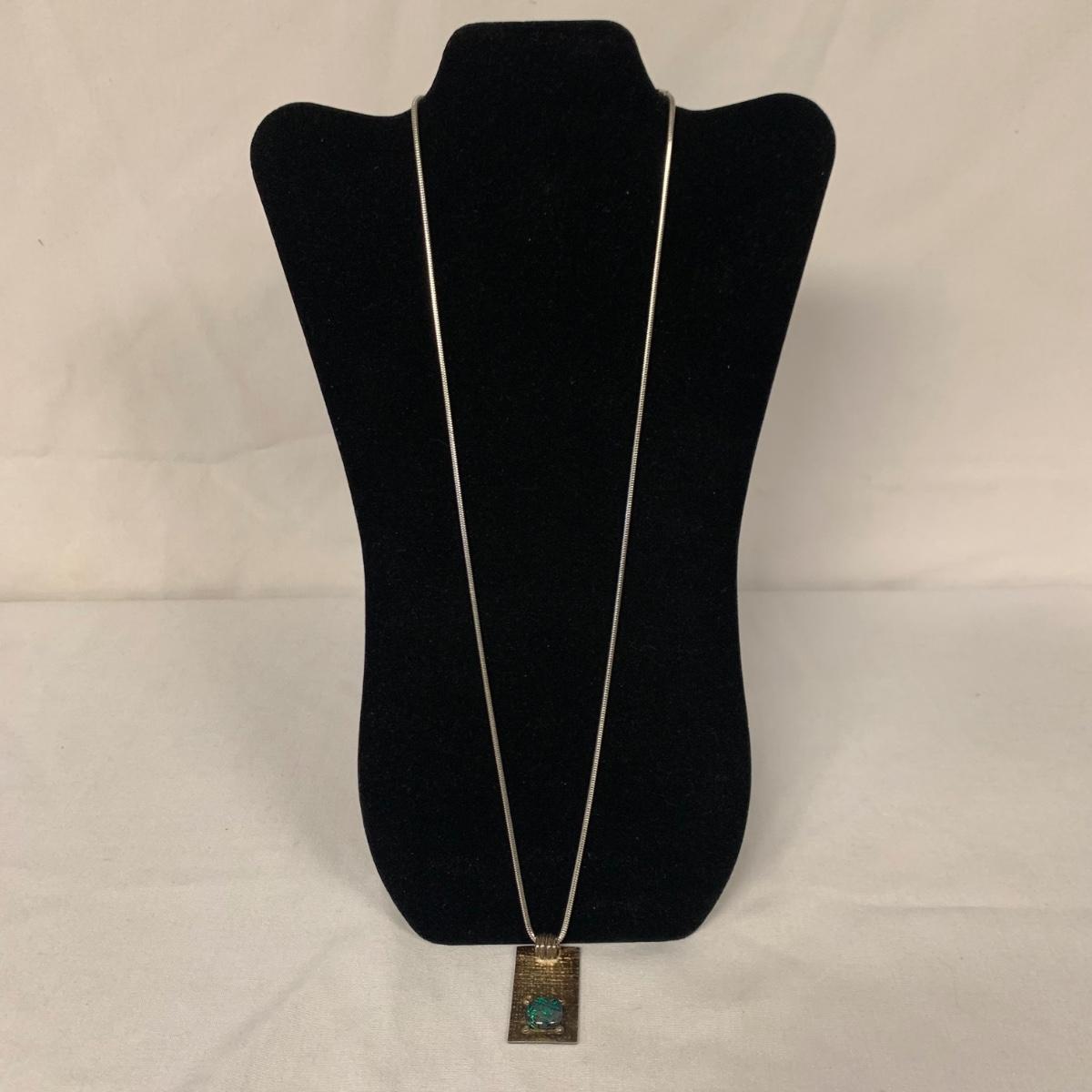 A lovely collection of necklaces, pendants, two cuff bracelets, and two small metal pill boxes. There are 11 necklaces included plus two pendants without chains. The V-point necklace chain is marked 925. It is a bit tarnished and needs to be polished. The longest necklace is the rounded silver chain that currently holds the silver pendant with the glass dragonfly motif. It is 30” long. The pearl-like necklace does not appear to have real pearls. Please see photos for markings.
