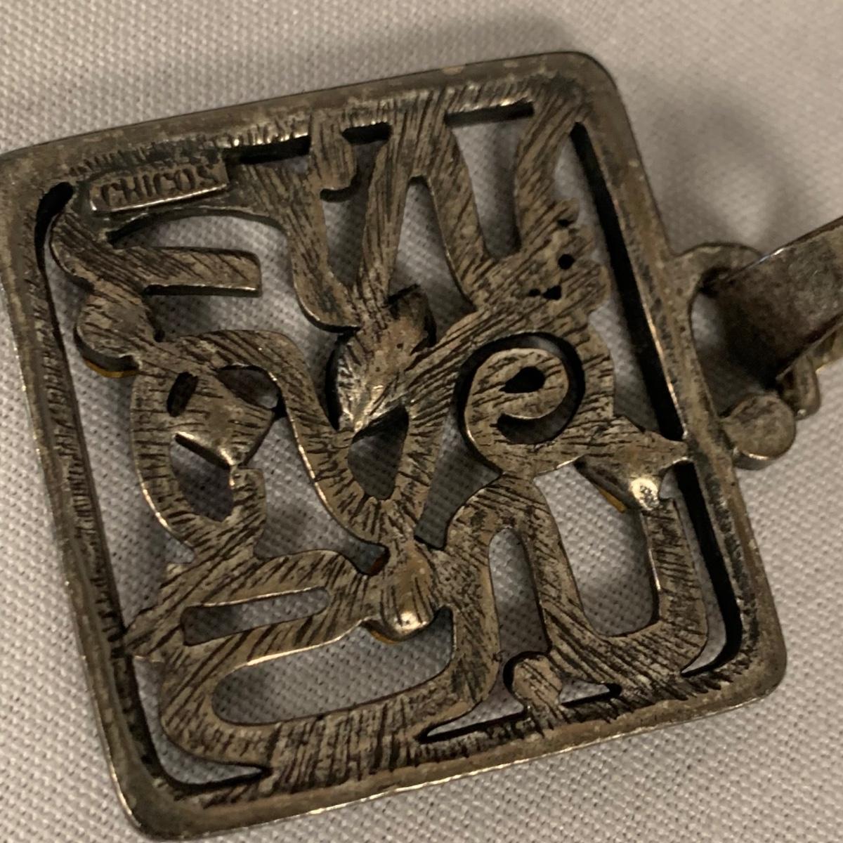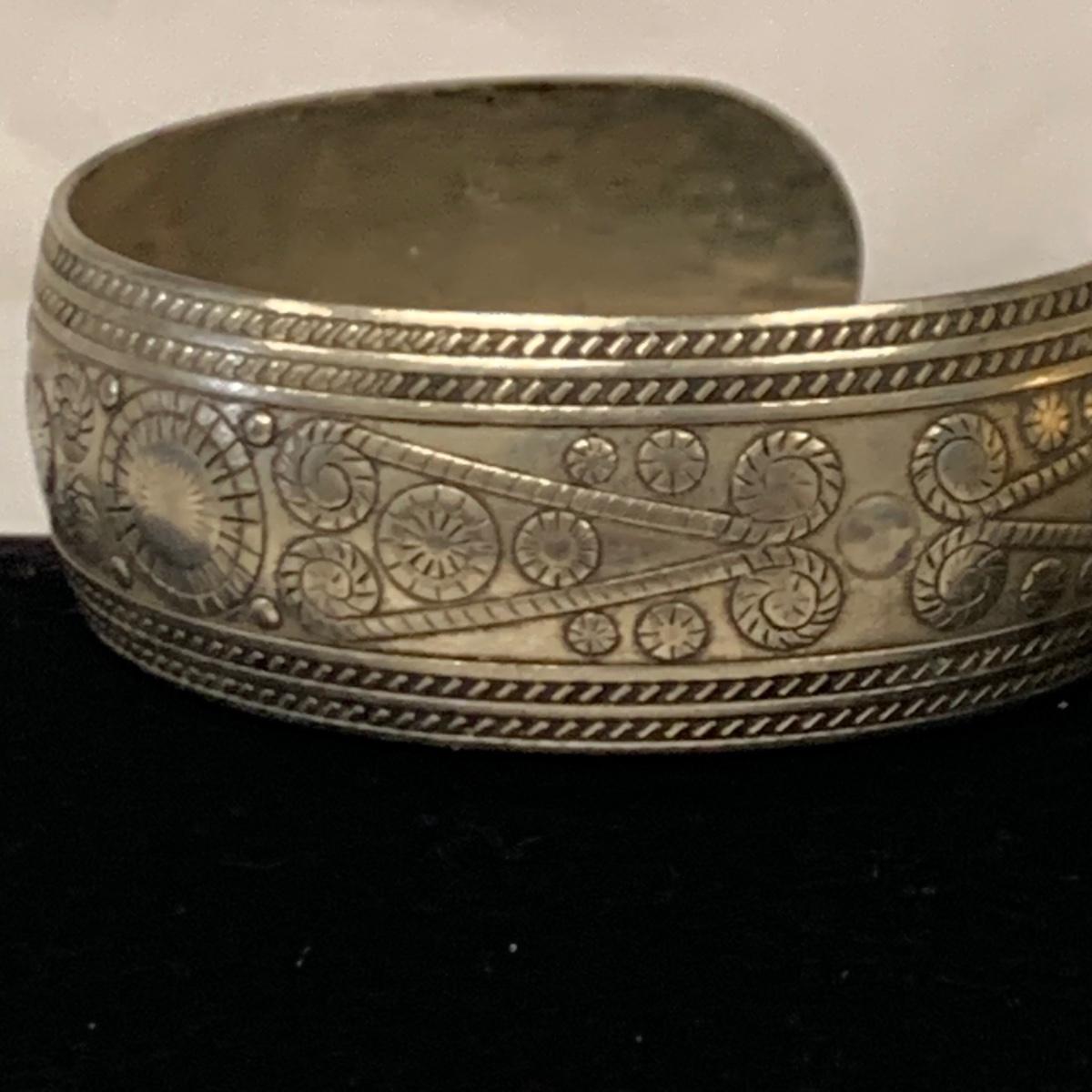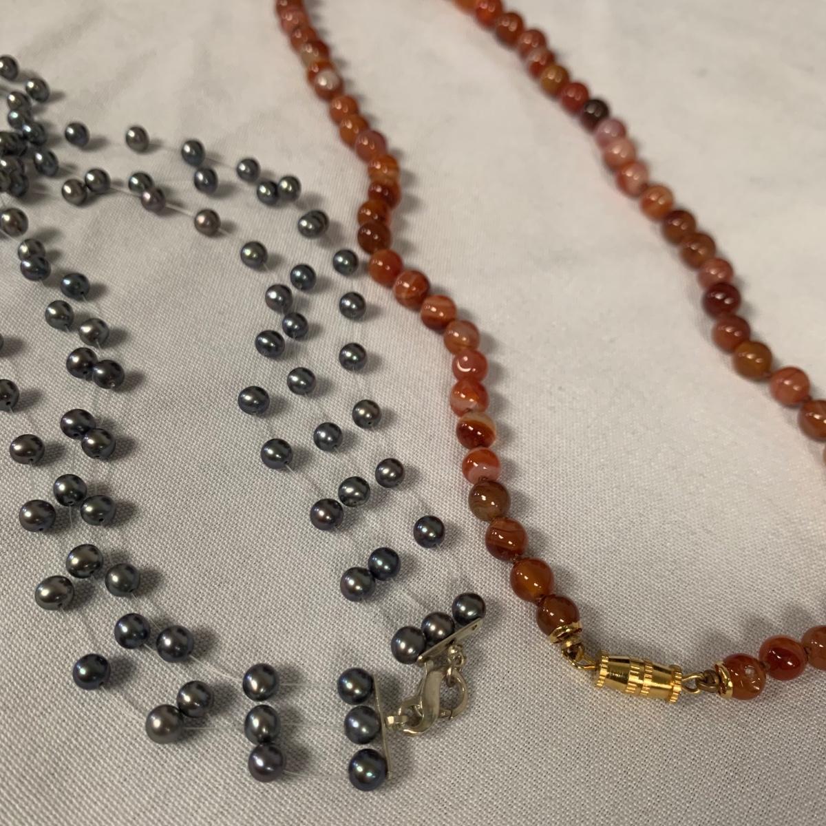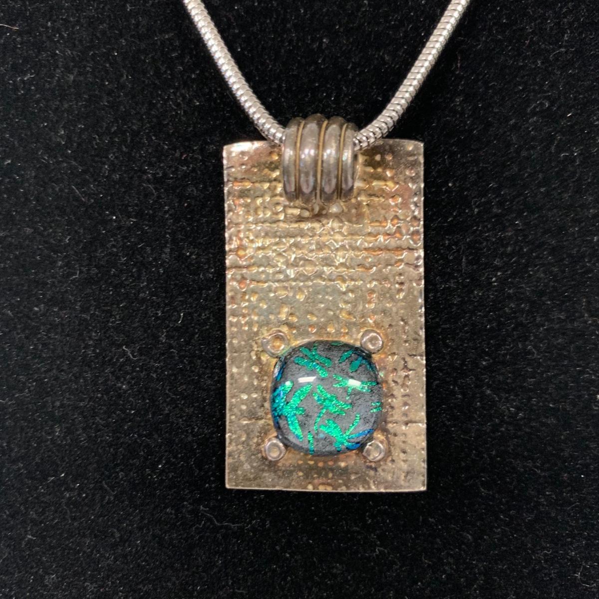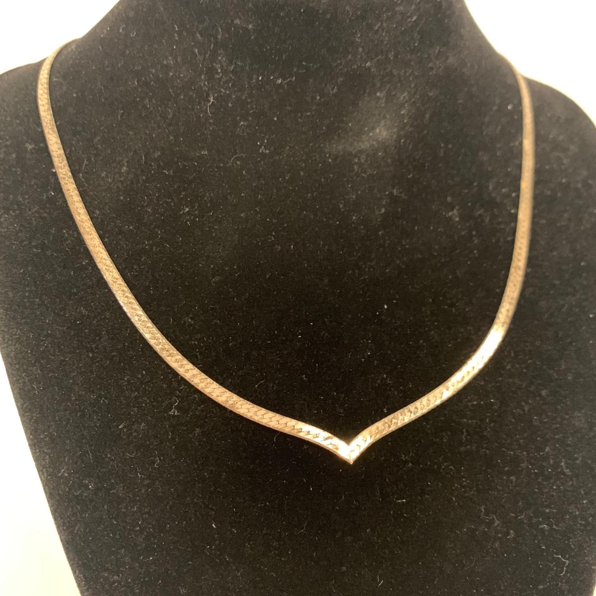 A lovely collection of necklaces, pendants, two cuff bracelets, and two small metal pill boxes. There are 11 necklaces included plus two pendants without chains. The V-point necklace chain is marked 925. It is a bit tarnished and needs to be polished. The longest necklace is the rounded silver chain that currently holds the silver pendant with the glass dragonfly motif. It is 30” long. The pearl-like necklace does not appear to have real pearls. Please see photos for markings.