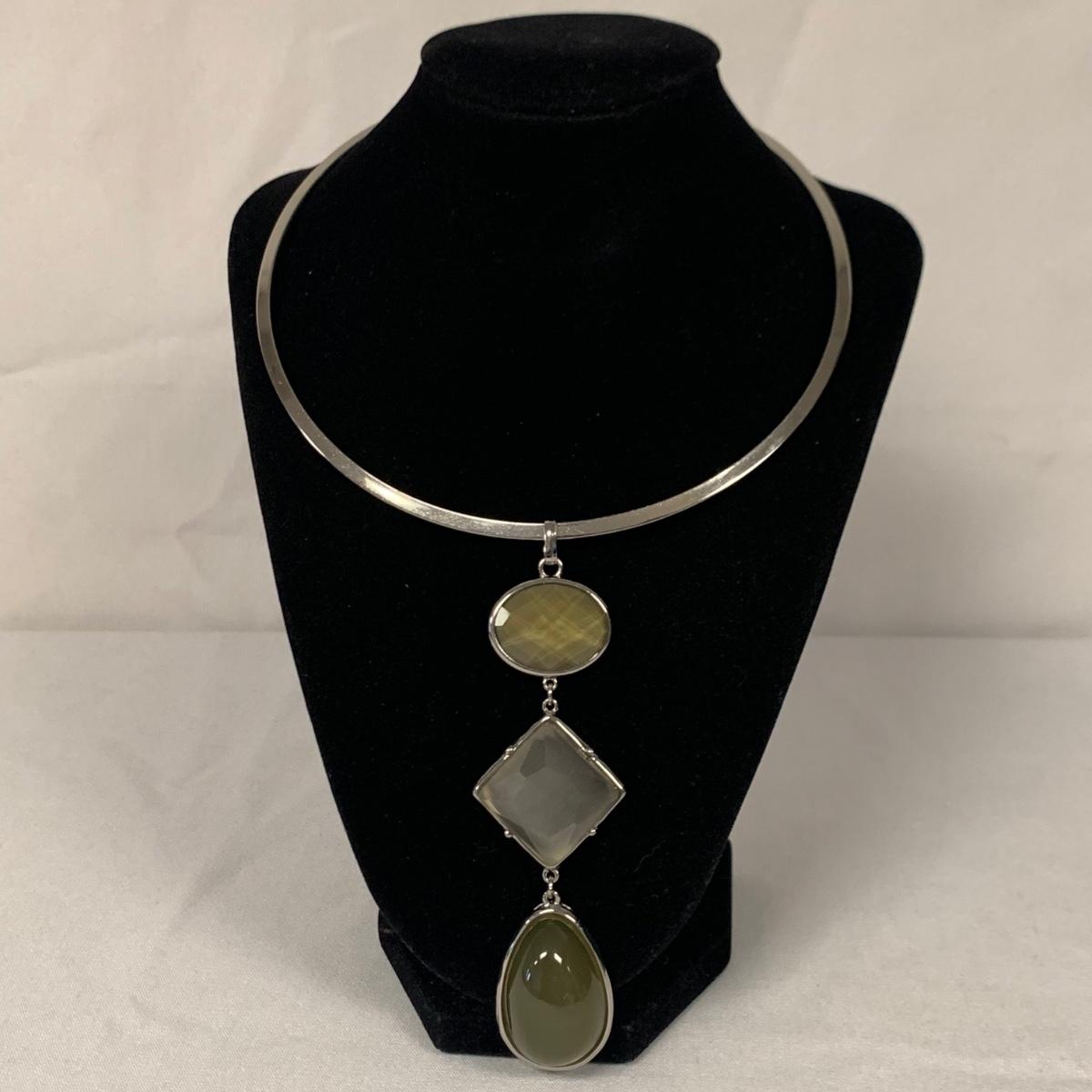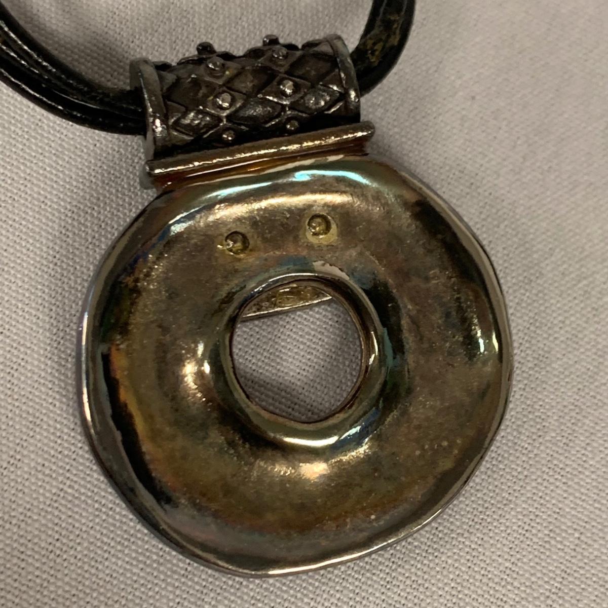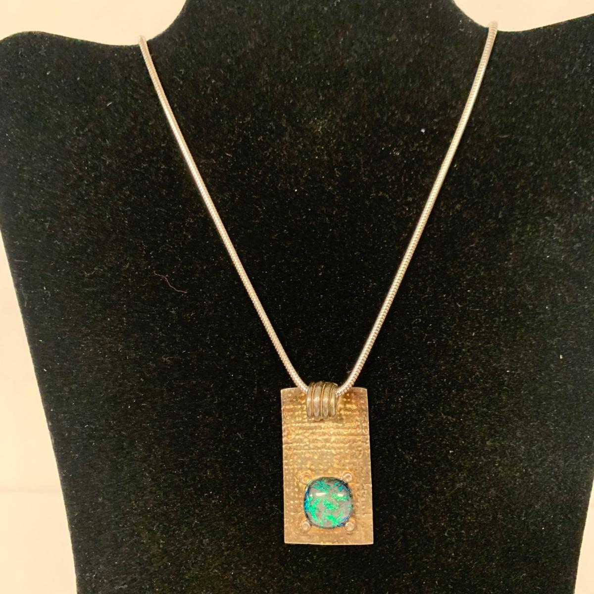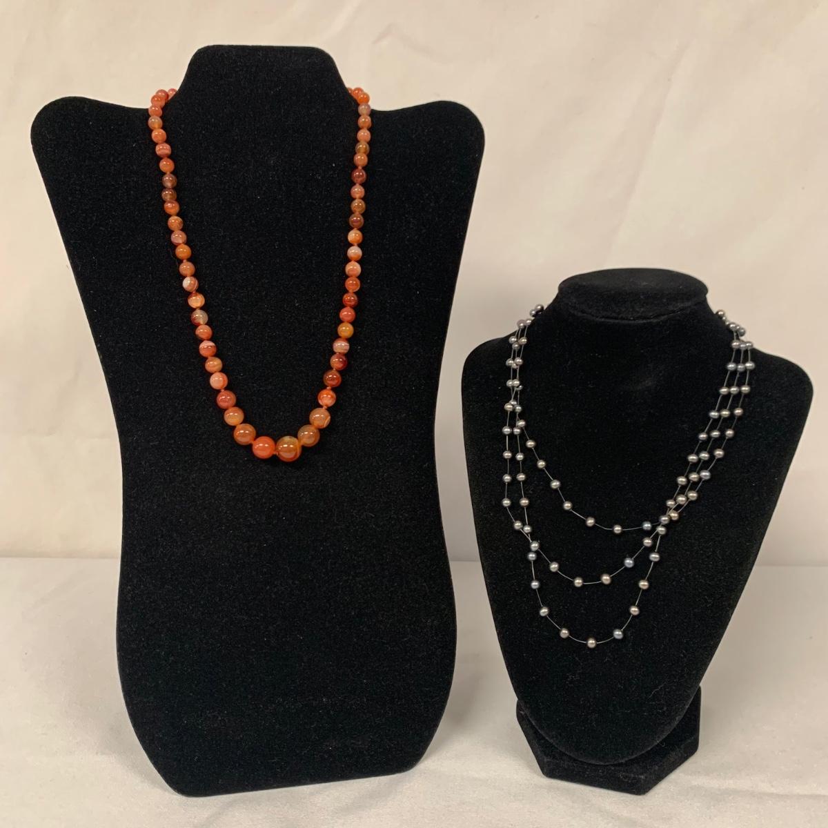 A lovely collection of necklaces, pendants, two cuff bracelets, and two small metal pill boxes. There are 11 necklaces included plus two pendants without chains. The V-point necklace chain is marked 925. It is a bit tarnished and needs to be polished. The longest necklace is the rounded silver chain that currently holds the silver pendant with the glass dragonfly motif. It is 30” long. The pearl-like necklace does not appear to have real pearls. Please see photos for markings.