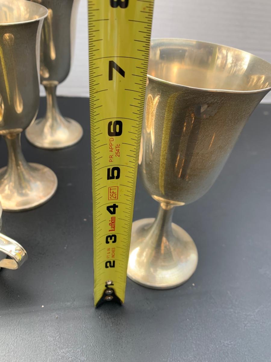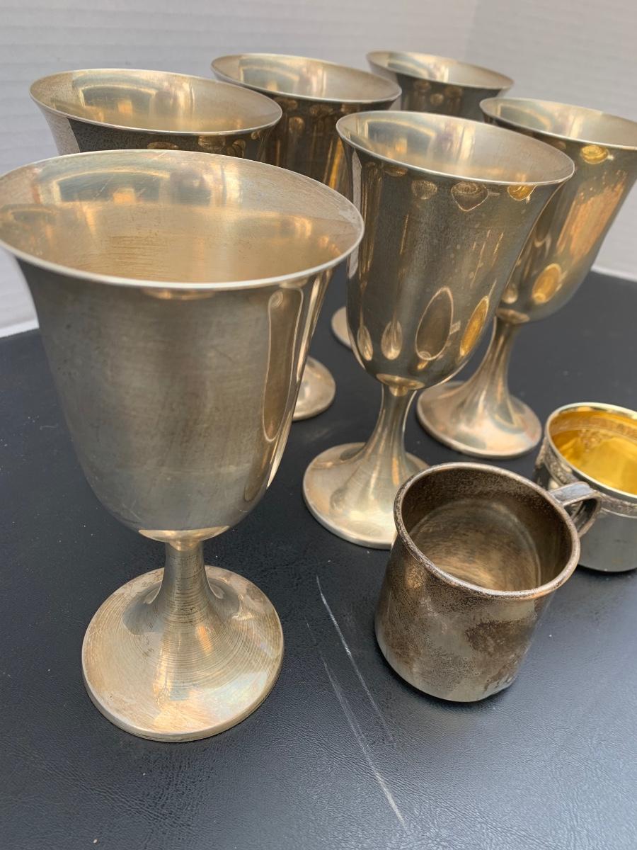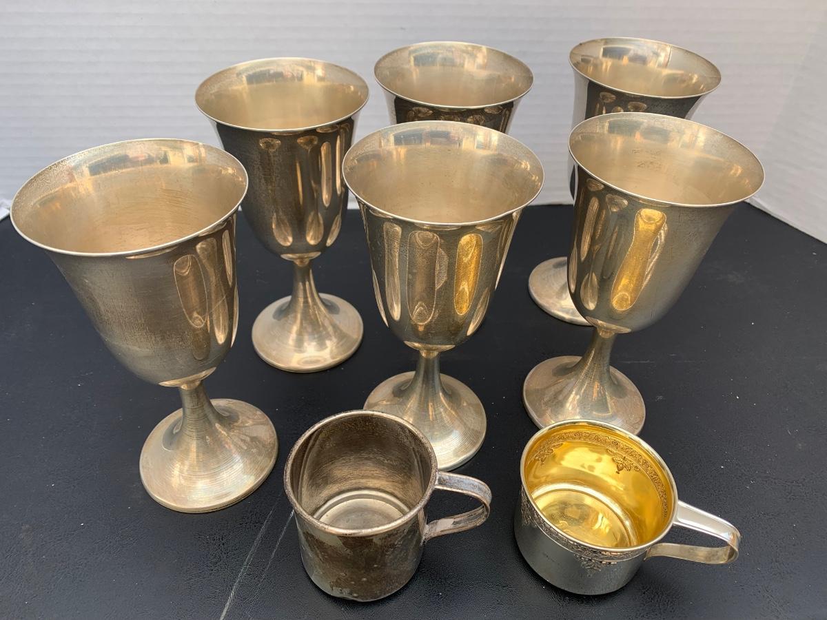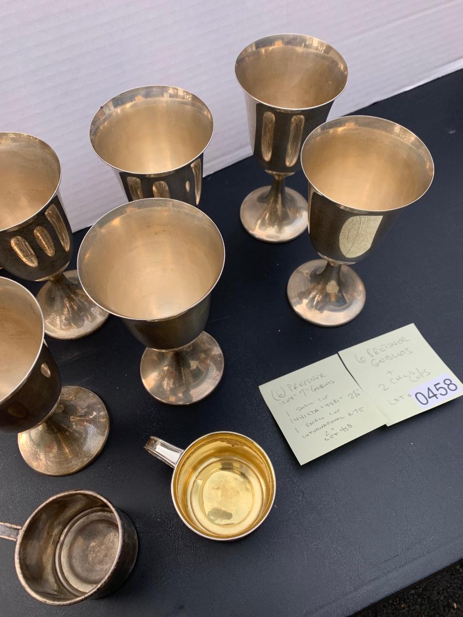 SIX 7” Sterling Silver Water Goblets by Preisner stamped “Sterling 104” plus 2 little cups also stamped sterling.