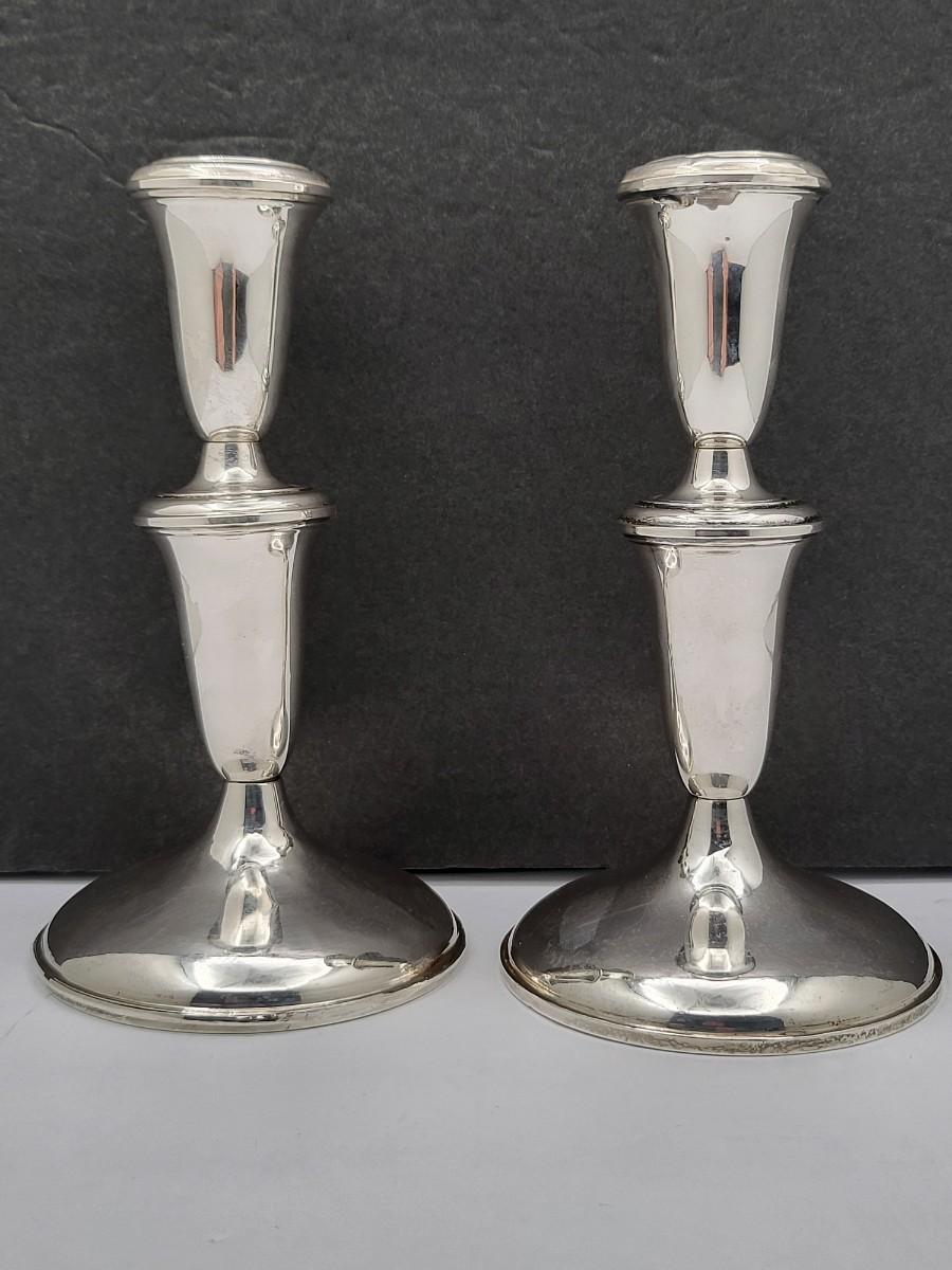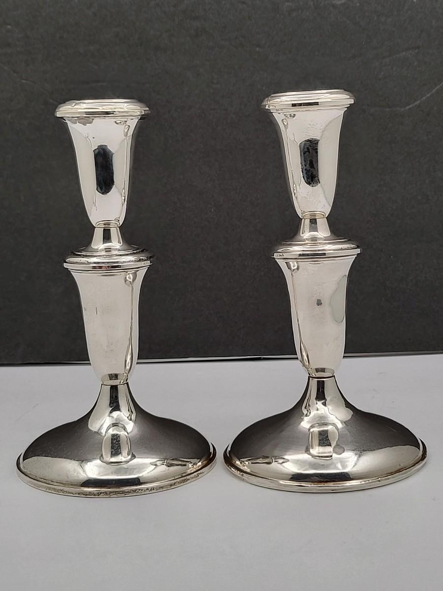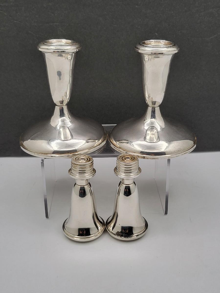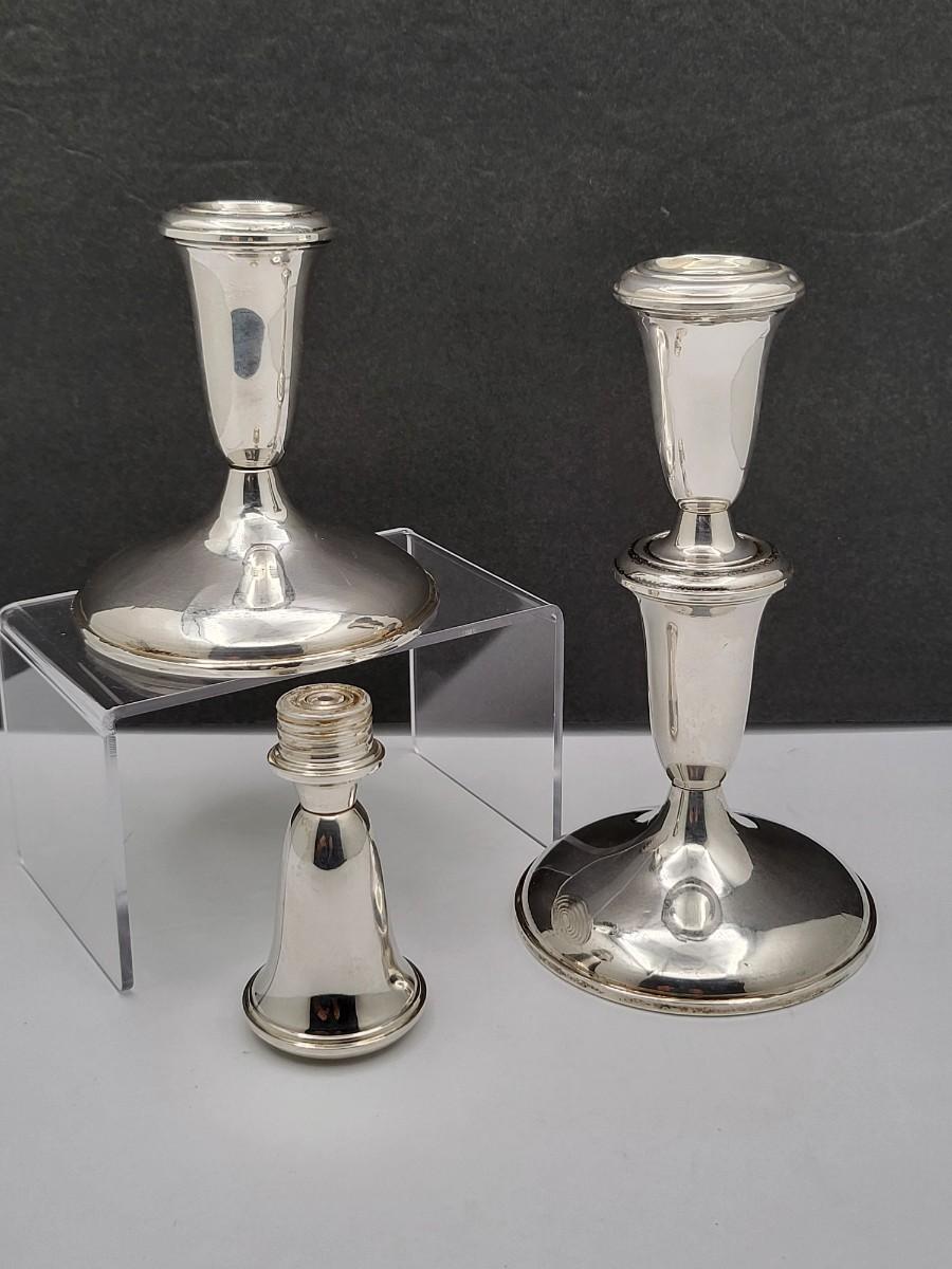 Empire #377 sterling silver, weighted candlestick holders. Both candleholders have a top that screws off, so can be tall or short. Overall height is 7" and base is 3.75" diameter.
