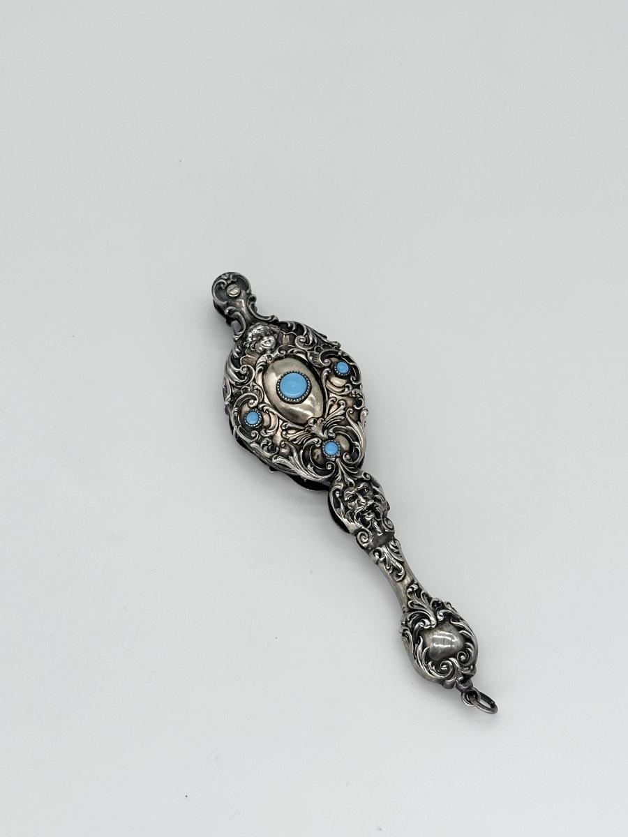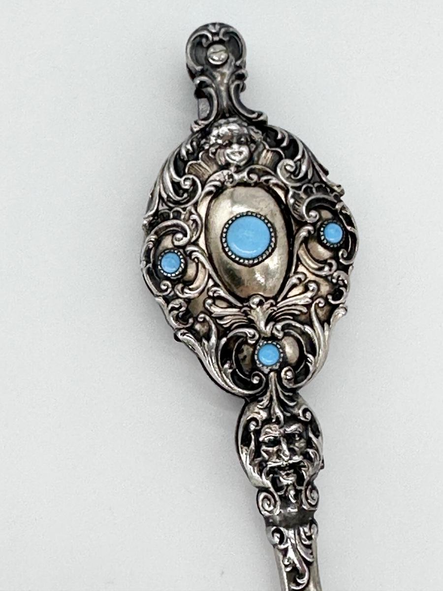 Glass have surface scratches from age. The glasses are not broken ~ Turquoise embellishments ~ there is a Cupid and Lion Head designed on the both the front and back ~ 4.5” L x 1.25” W.