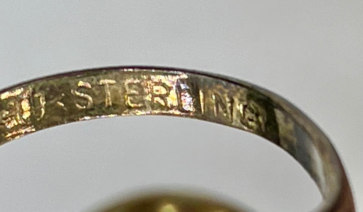 Oval setting with raised dots and swirls on the edge, marked STERLING” on the inside. A little visible tarnish, but otherwise in good condition.