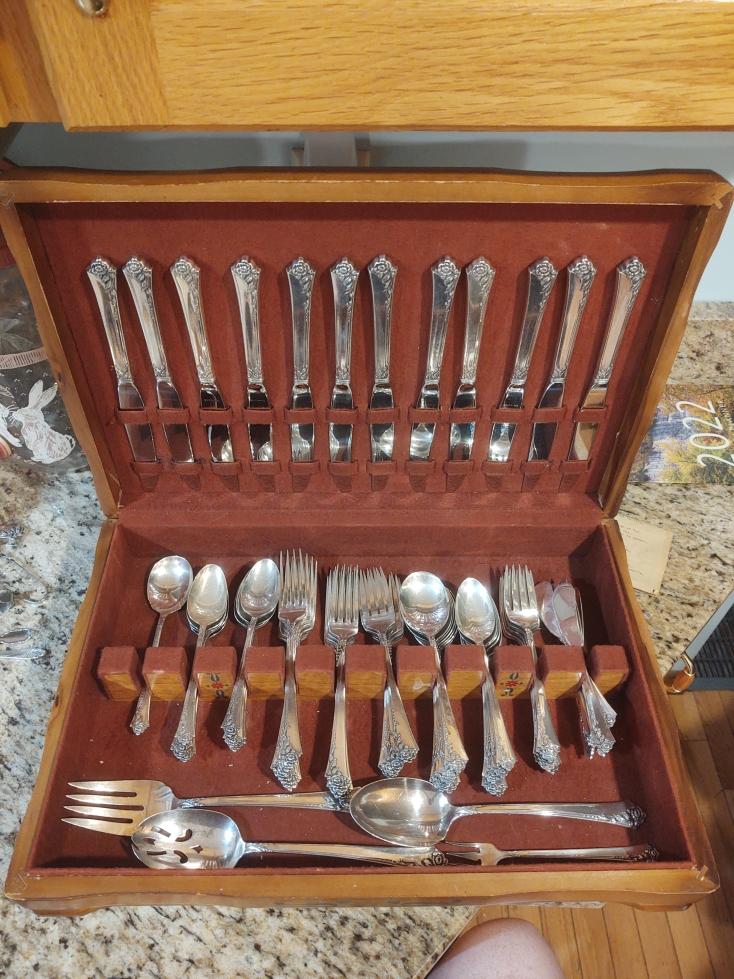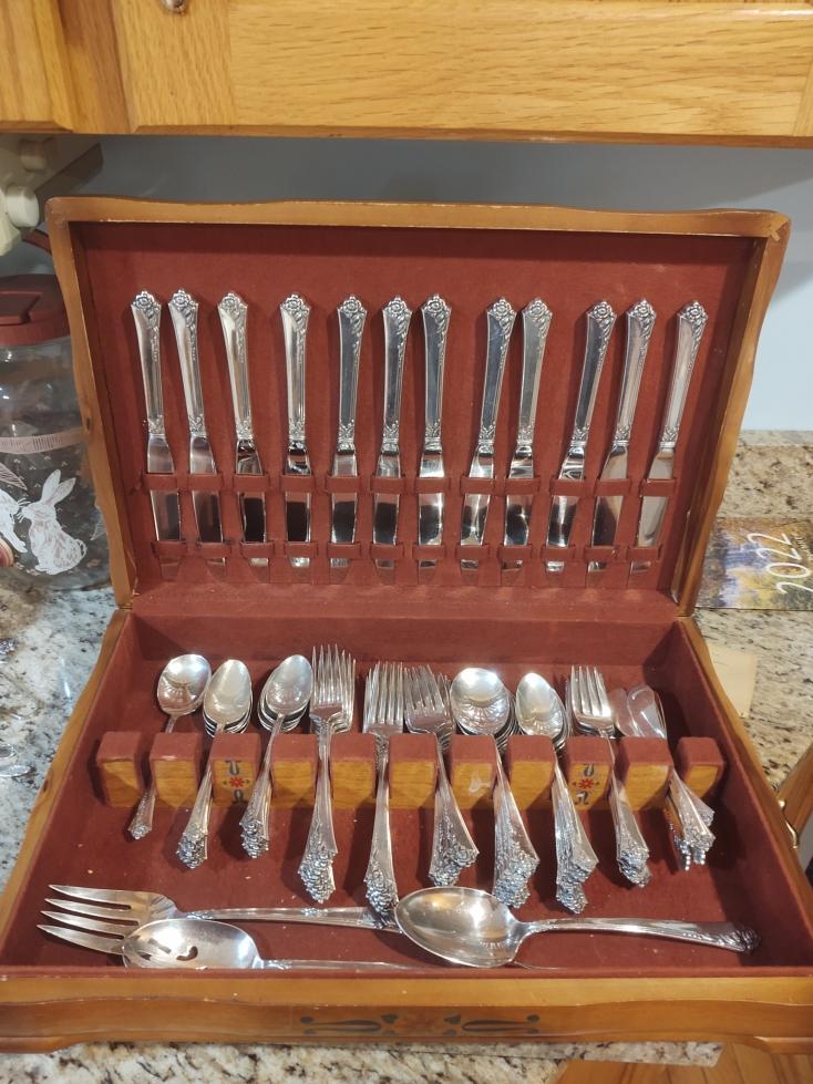 76 piece sterling silverware set. Damask Rose style. Marked "Heirloom Sterling". We have provenance dating this particular set back to 1956. In original wooden box.