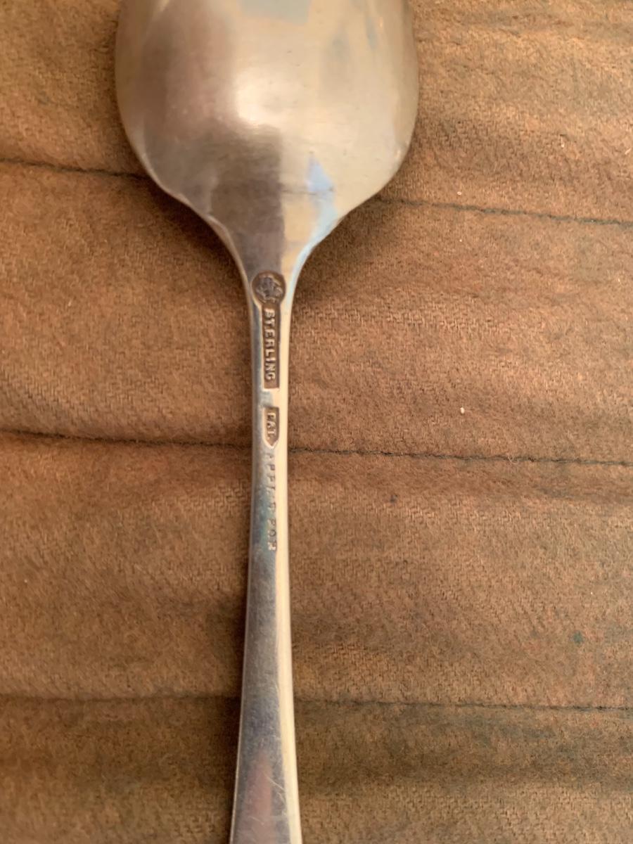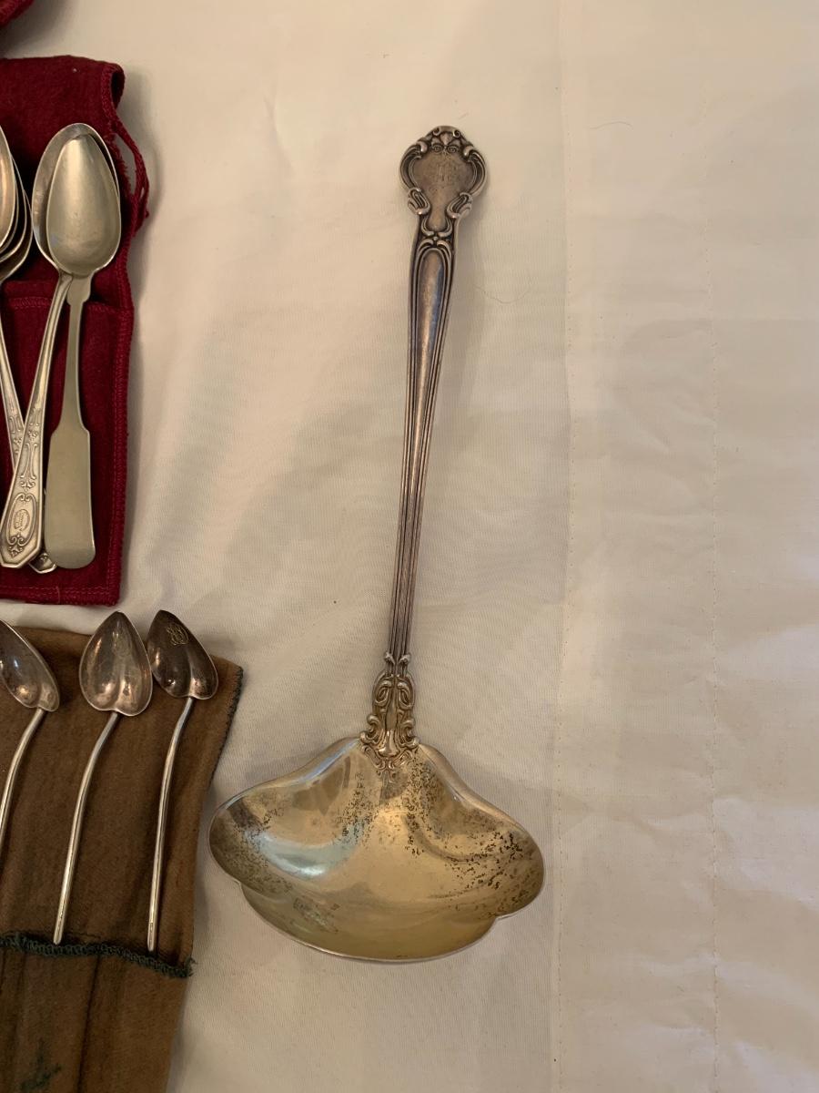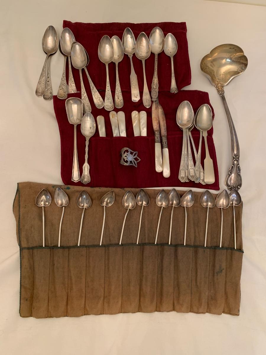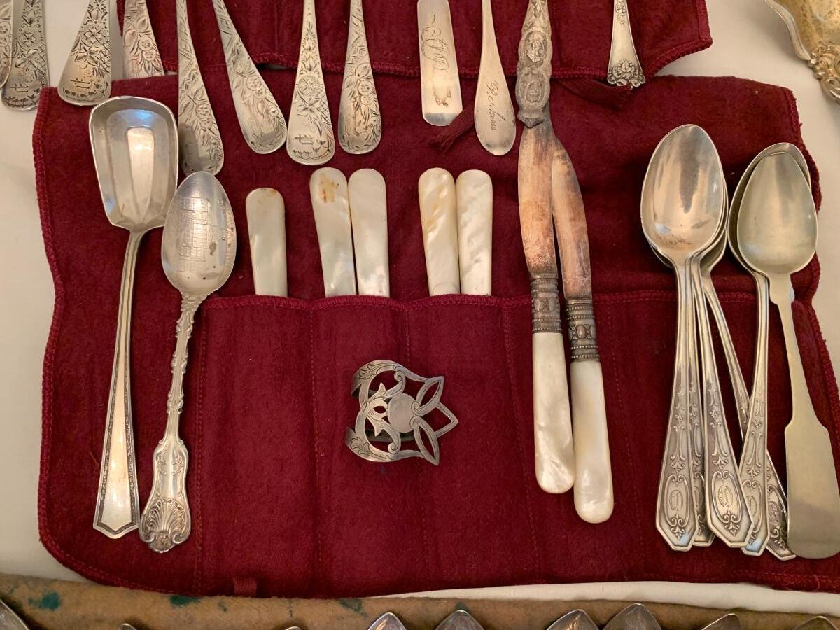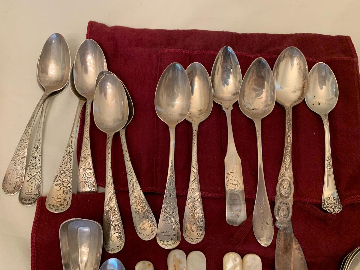 This lot includes a sterling tea spoon set of 12. Also various silverware and serving pieces and a set of knives with shell handles. All marked sterling.