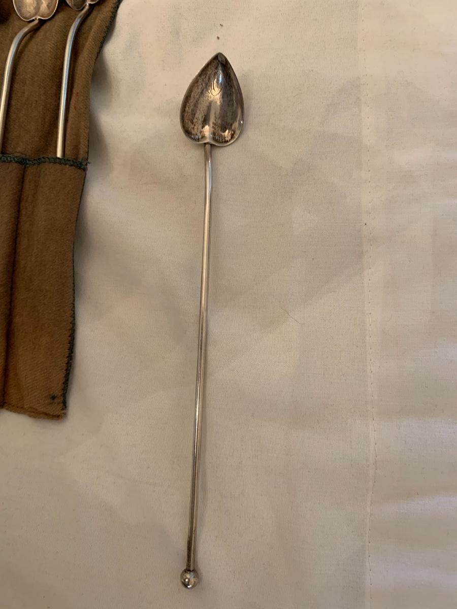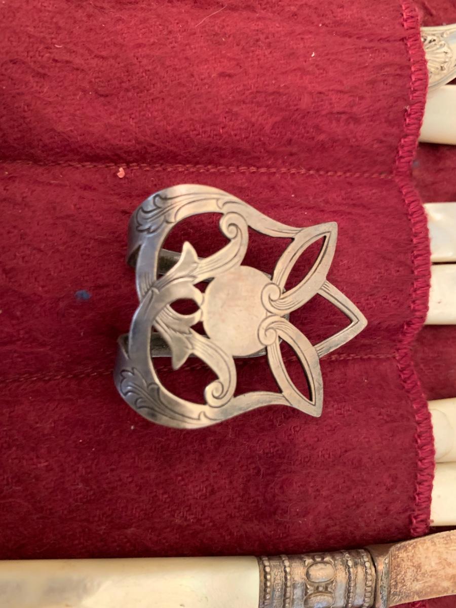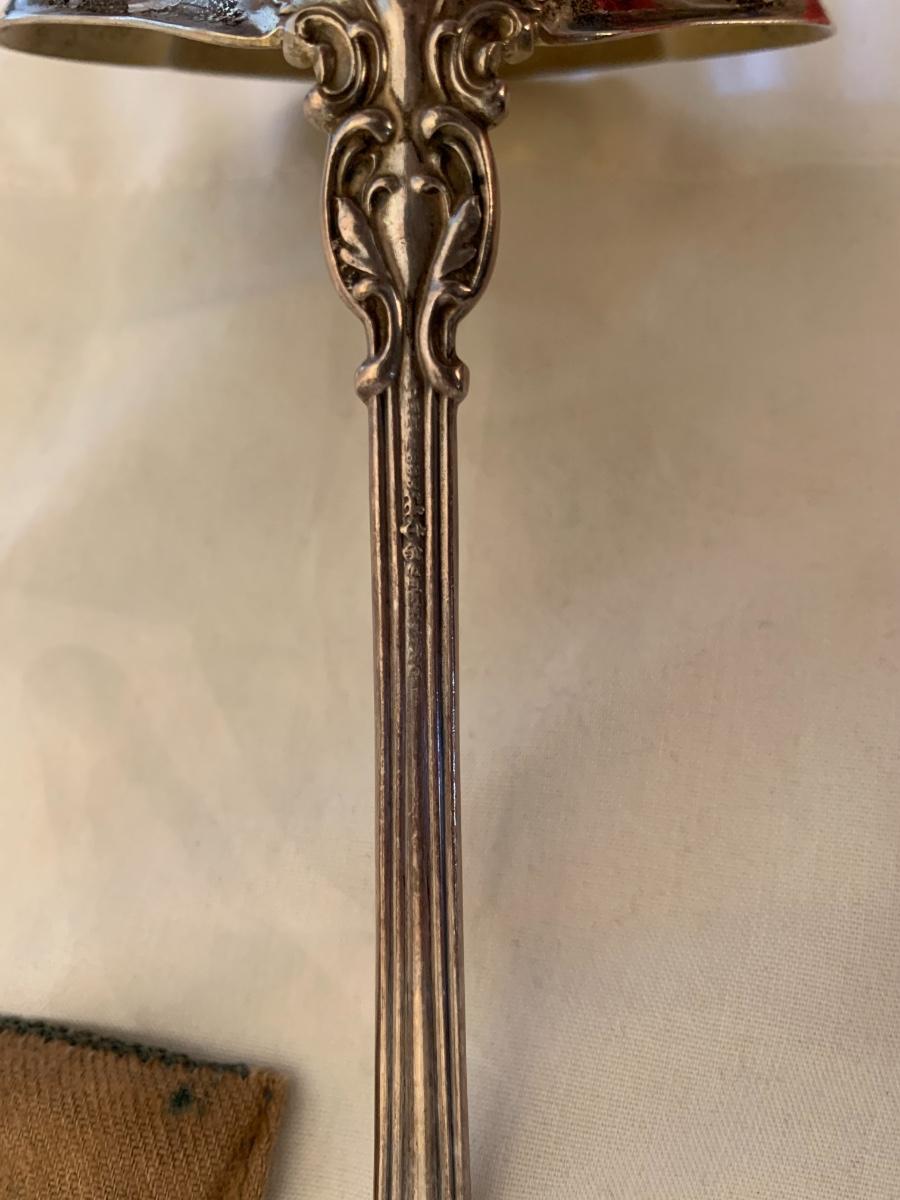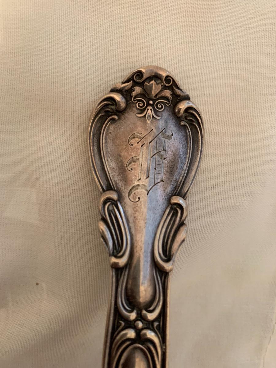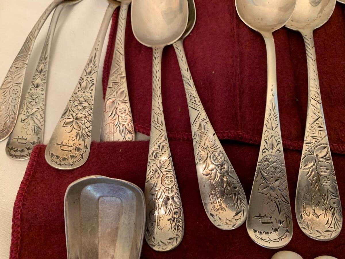 This lot includes a sterling tea spoon set of 12. Also various silverware and serving pieces and a set of knives with shell handles. All marked sterling.