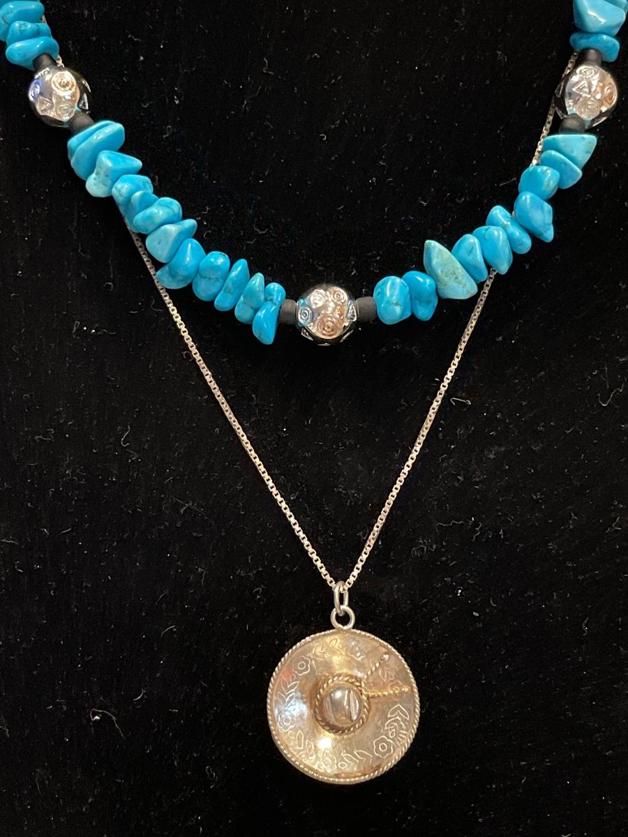 Small possible turquoise necklace and sterling sombrero necklace