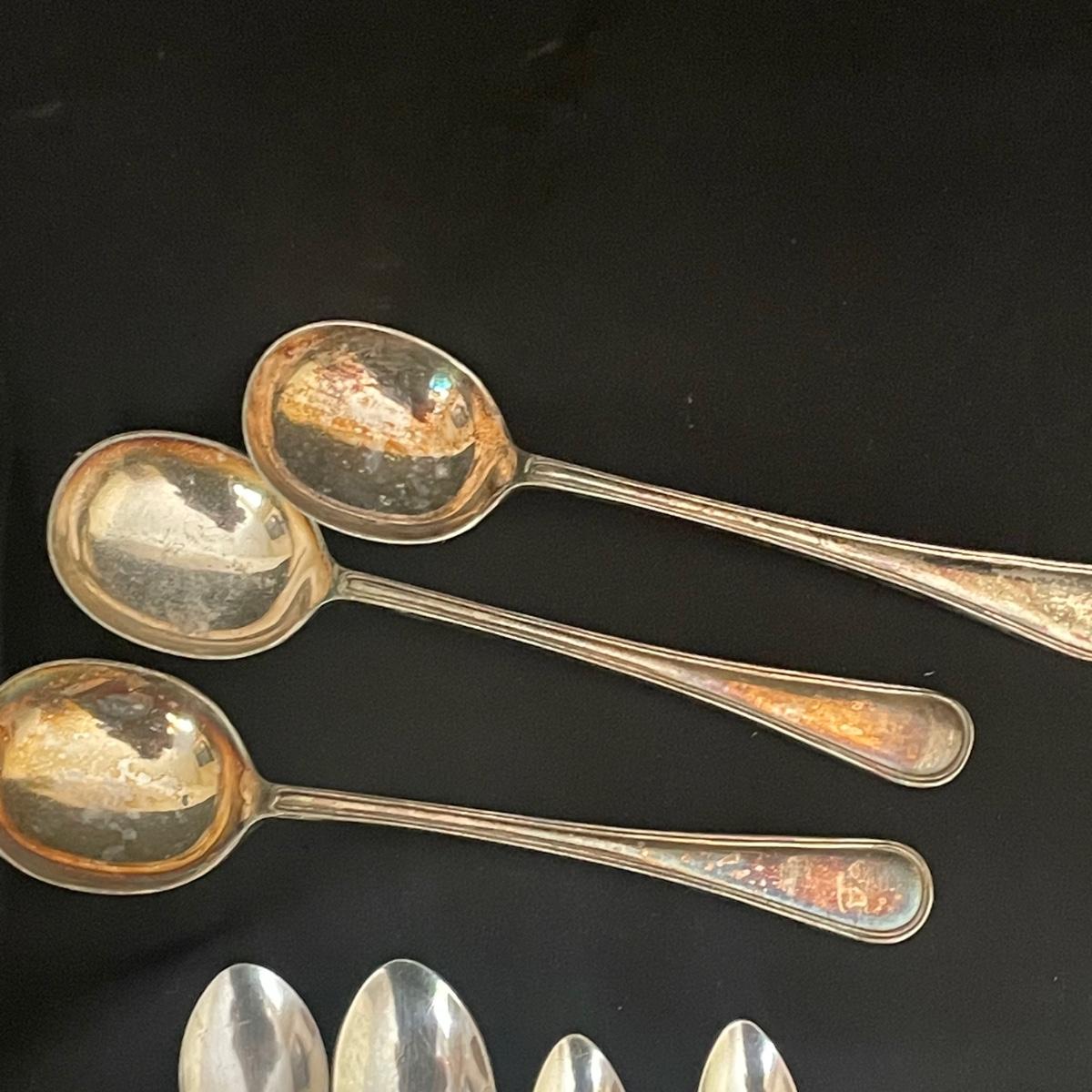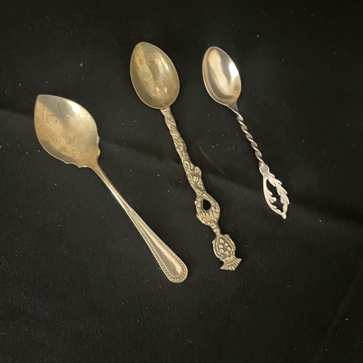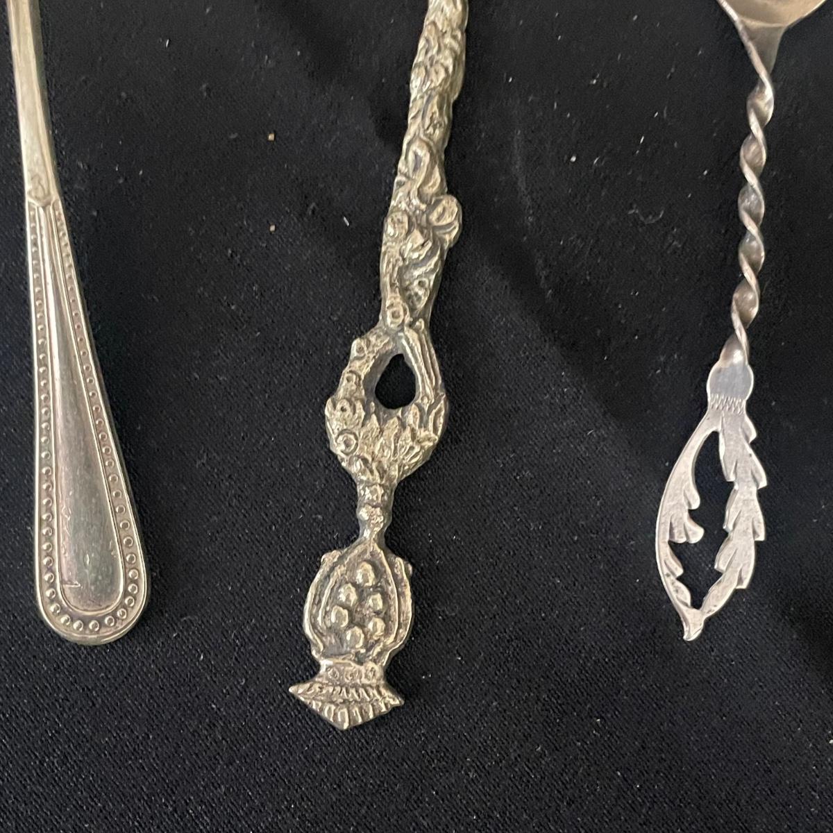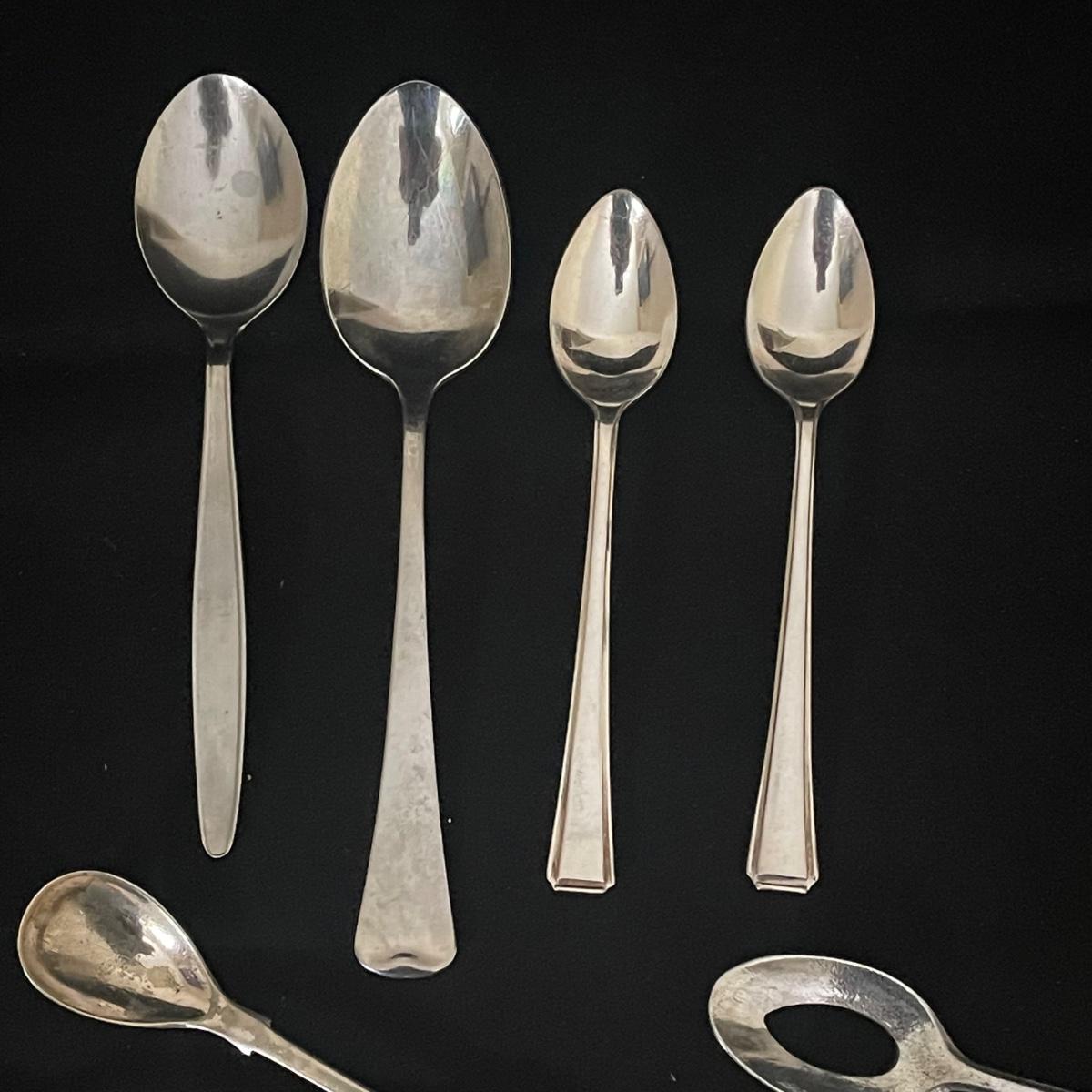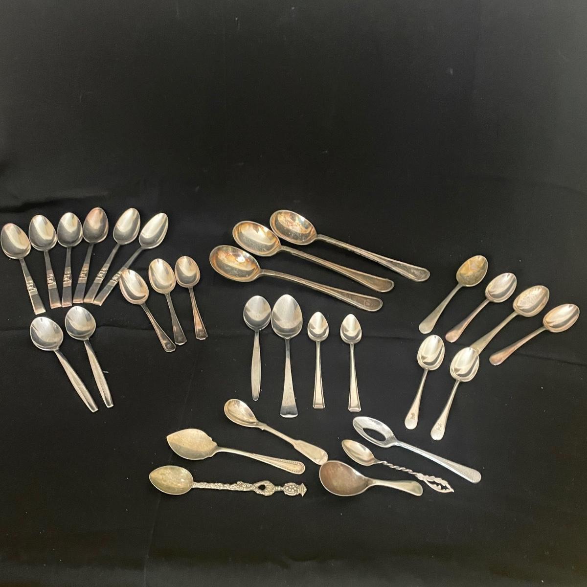 Thirty spoons here that includes tea spoons and larger spoons. One ornate teaspoon is marked sterling, the rest are mostly silver plate, see images for markings.