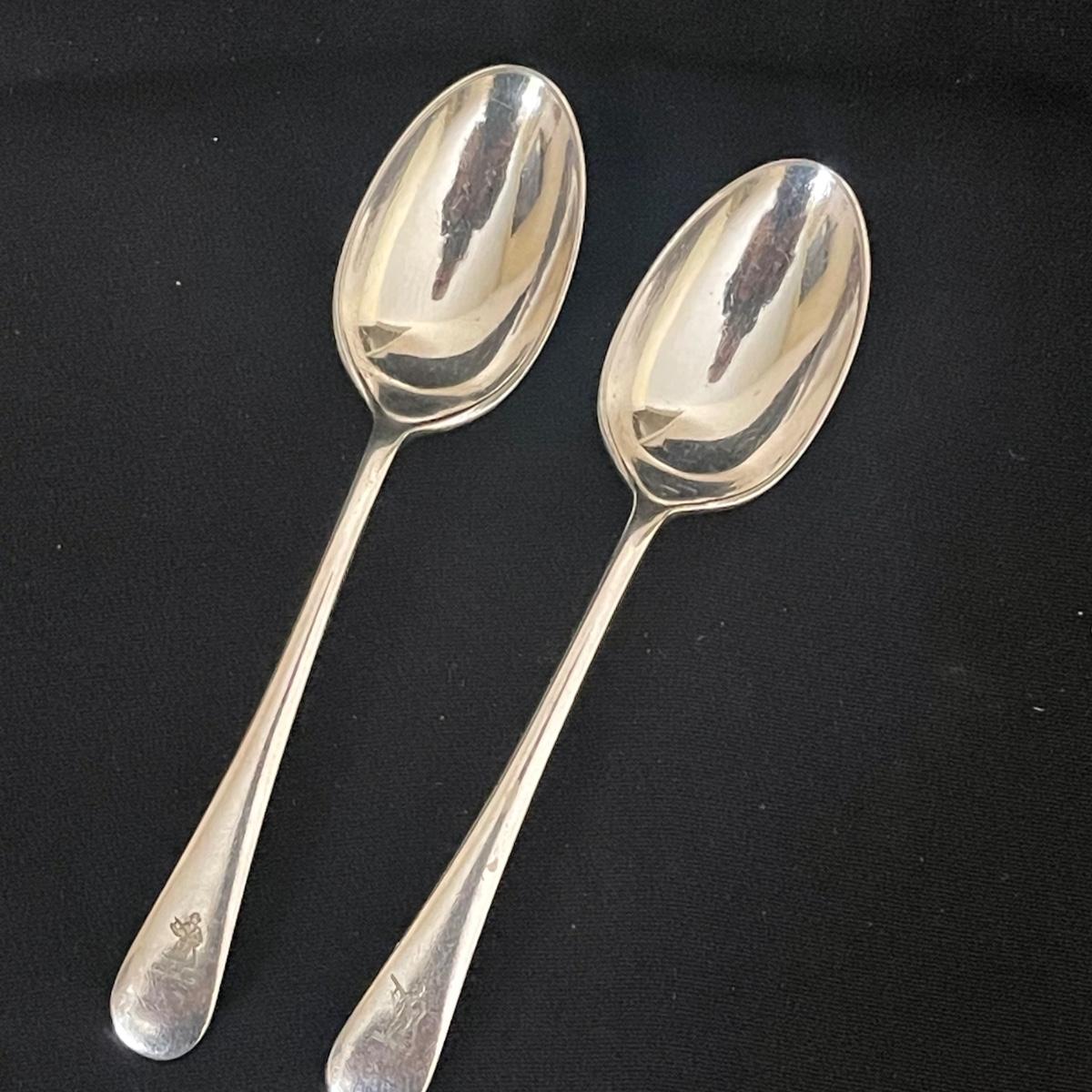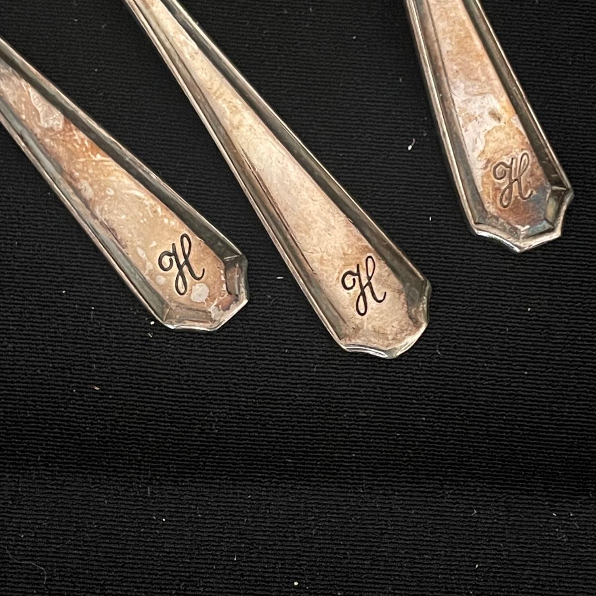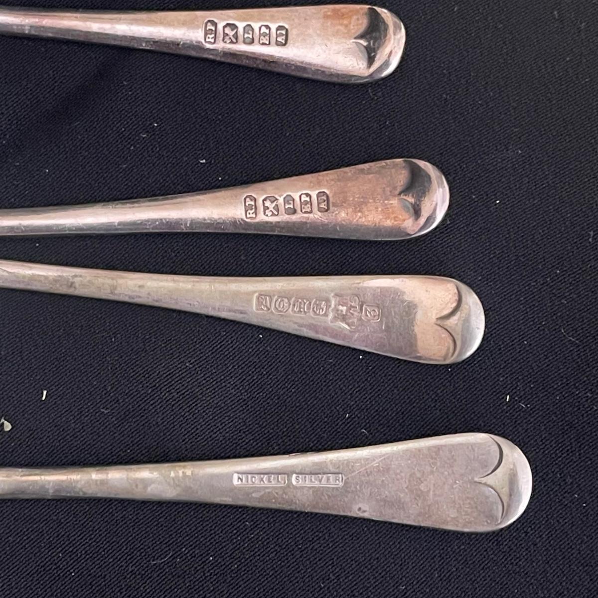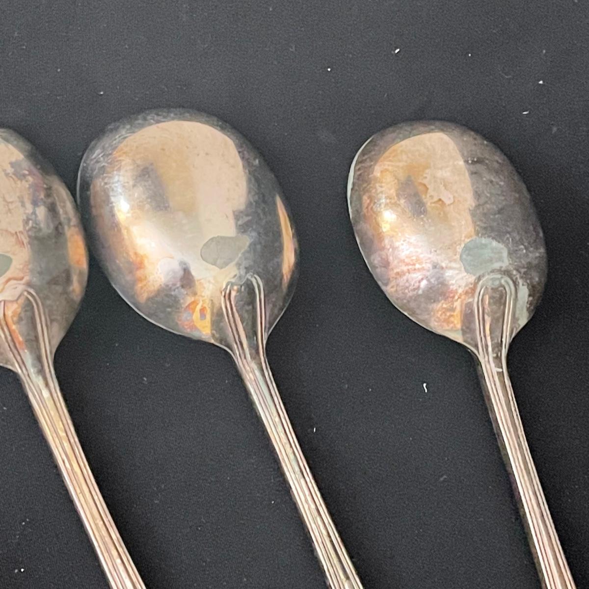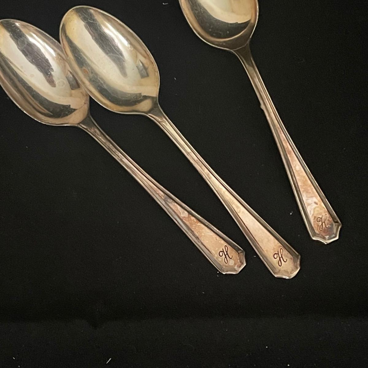 Thirty spoons here that includes tea spoons and larger spoons. One ornate teaspoon is marked sterling, the rest are mostly silver plate, see images for markings.